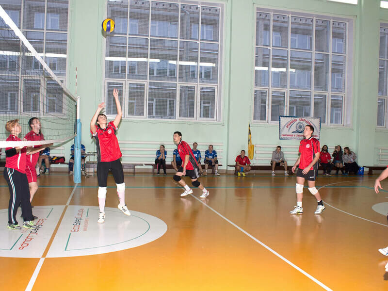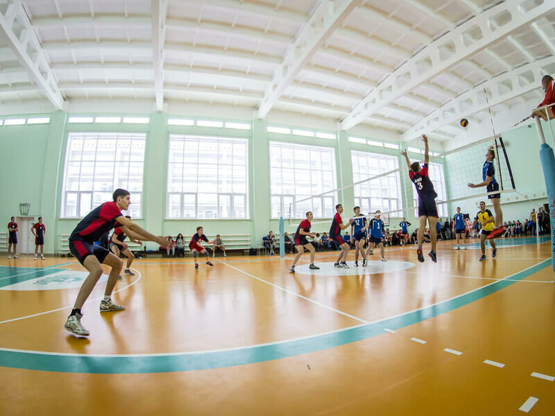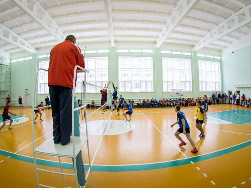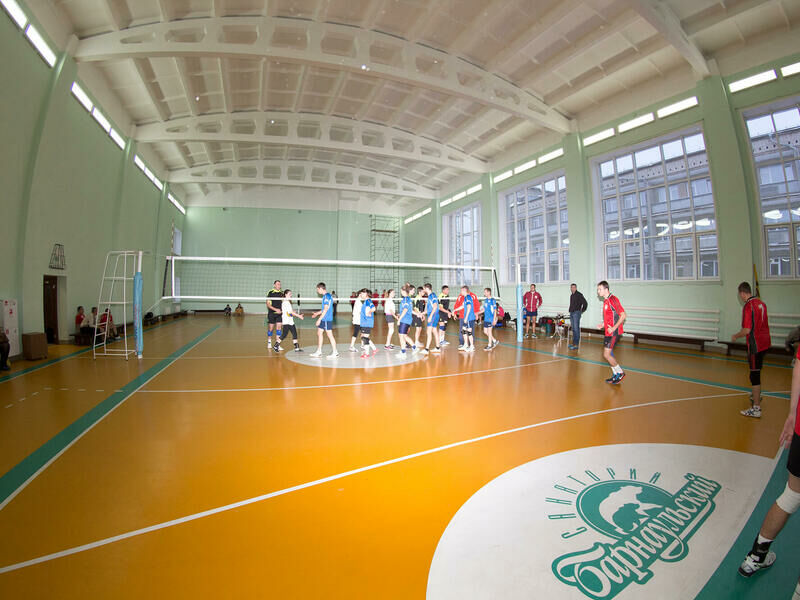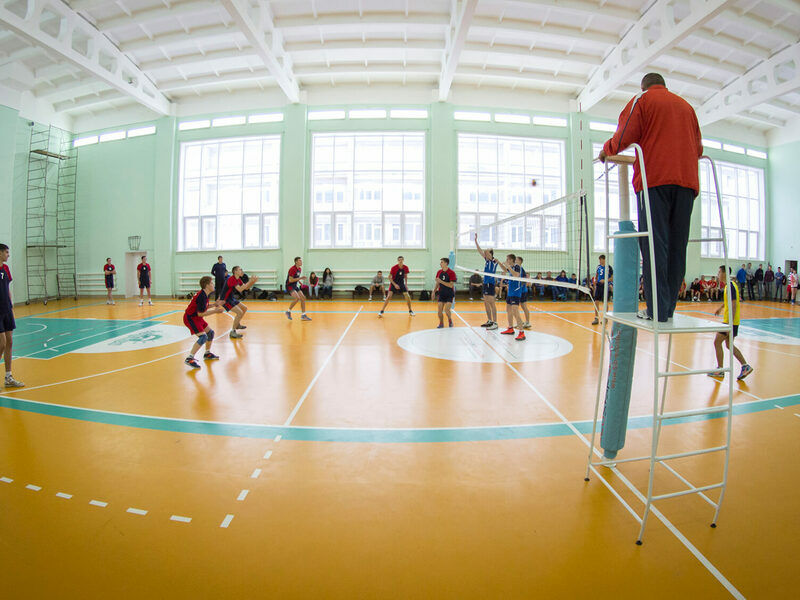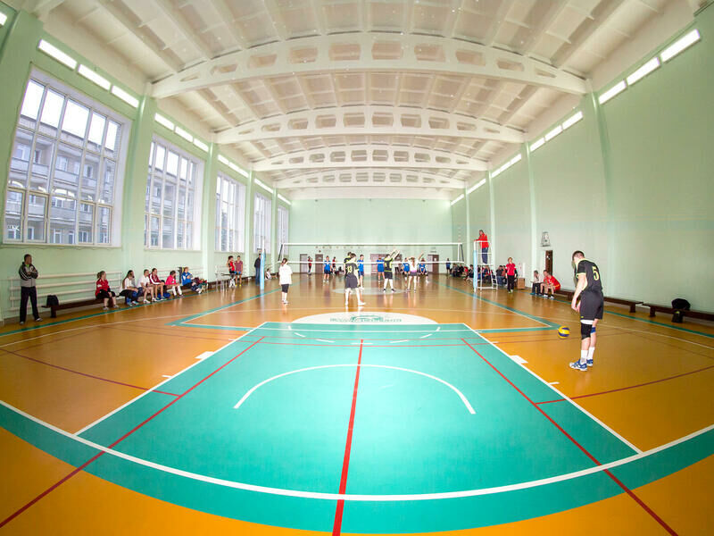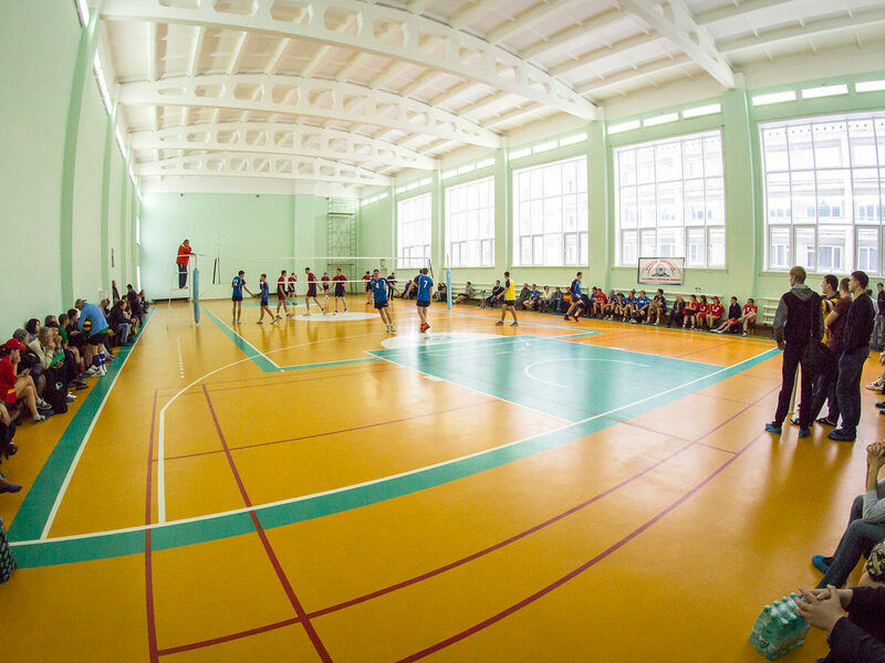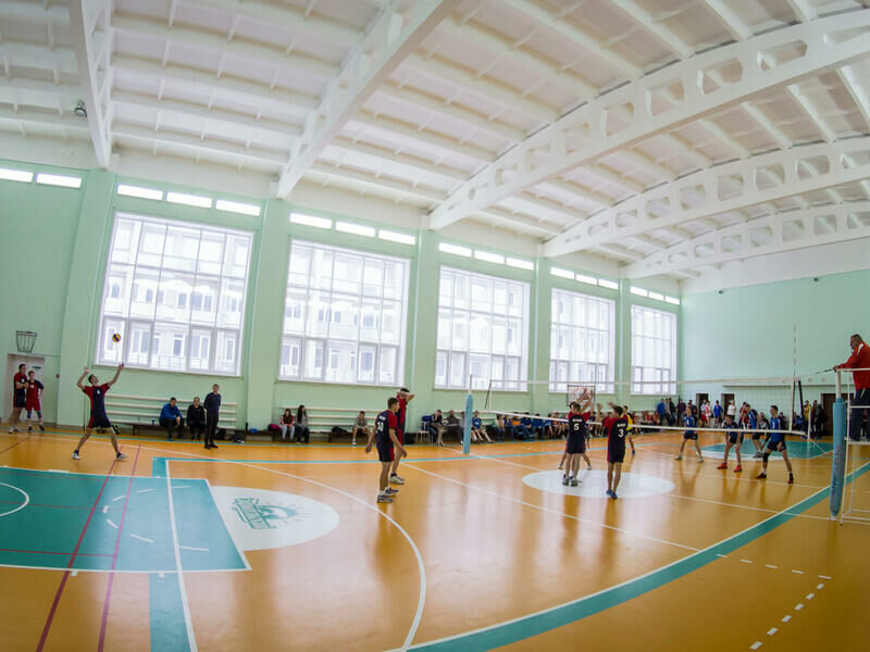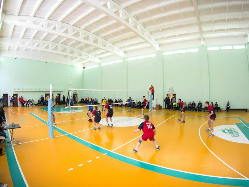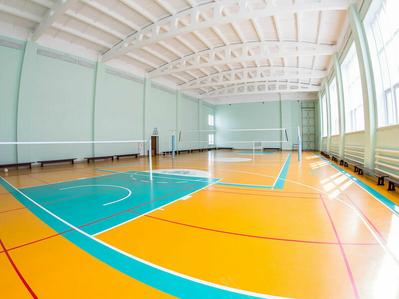 Спортивный зал размером 36 на 18 метров, высотой потолков 10 метров, с современным антитравматичным покрытием, с площадками для волейбола, баскетбола, бадминтона и настольного тенниса.