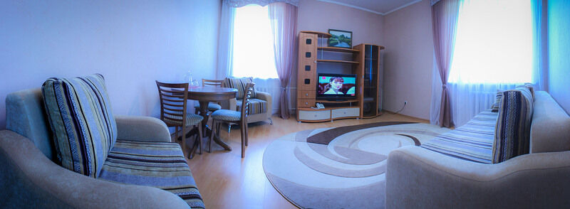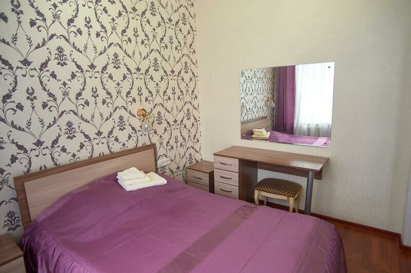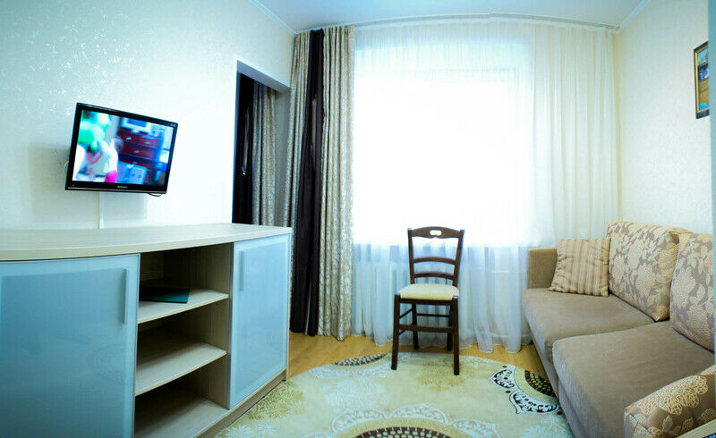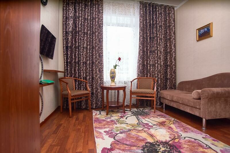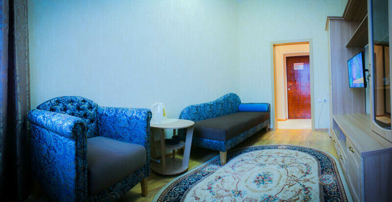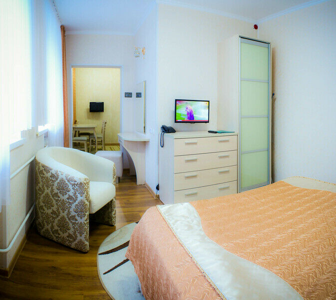 В номере: холодильник, телевизор, ванна/душ, раковина, WC, кровать/2 кровати, диван, кресло, шкаф платяной, шкаф посудный, пуфик, стол журнальный, стул, тумбочка, ковер, телефон, радио, фен, чайник, картины, сервиз чайный или чайные пары, зеркало, сушилка для белья, столовый набор, набор фужеров и рюмок, графин со стаканами.