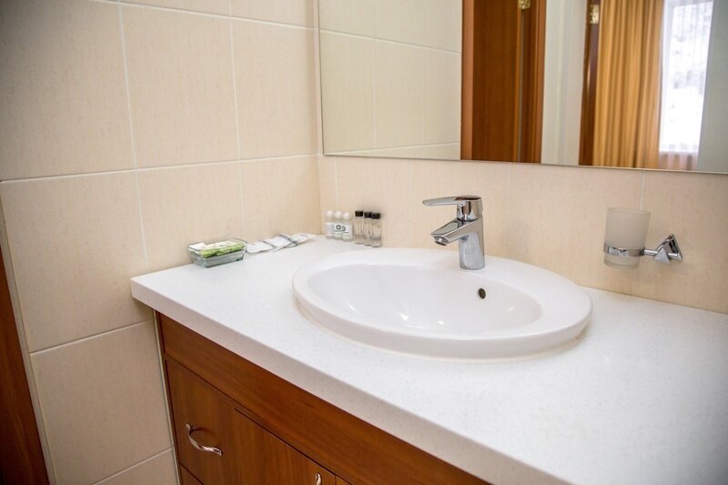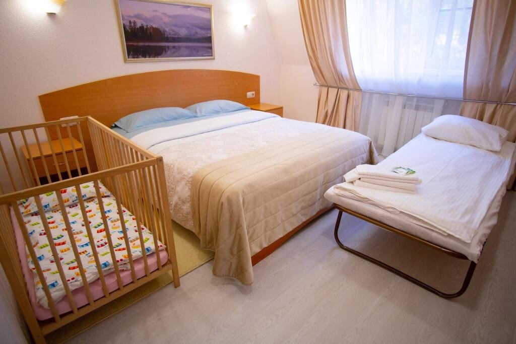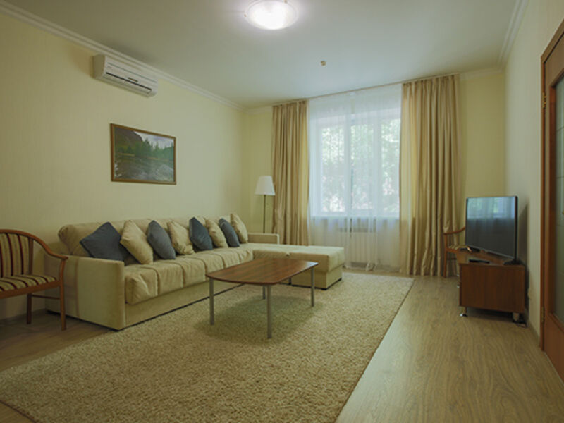 Двухкомнатный номер состоит из уютной гостиной с диваном и спальной комнаты с двуспальной кроватью. Гостям предоставляются махровые халаты, тапочки, бутилированная вода. Номера оснащены всем необходимым для комфортного отдыха.