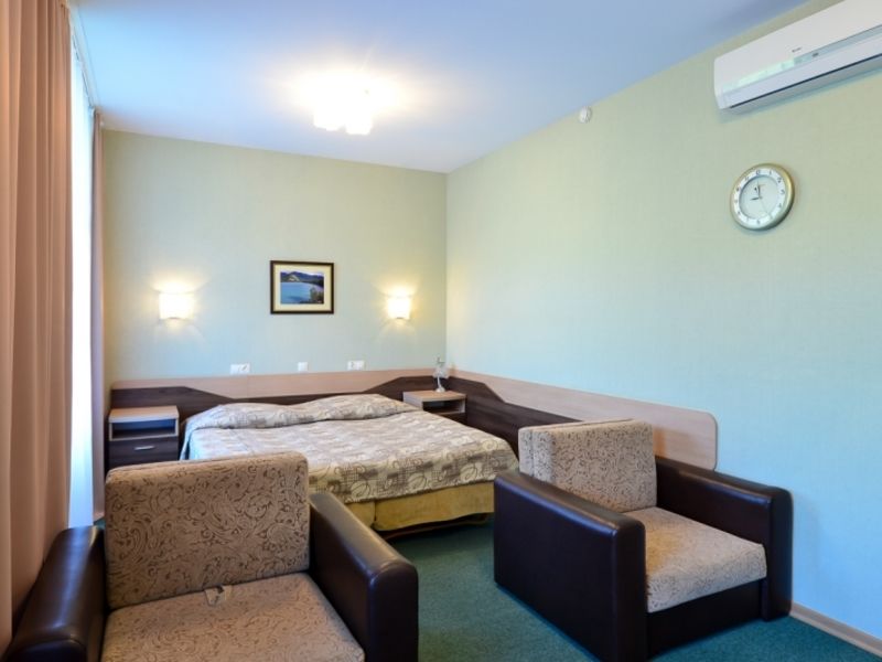 Корпус состоит из 8-ми этажей с номерами категорий разного уровня. Благоустроенная территория раскрывает прекрасные обзоры. Качественно оборудованные комнаты оснащены телевизором, холодильником, комфортабельной мебелью. Питание включено в стоимость путевки. Для любителей экзотической кухни предлагается система питания Люкс, включающая более широкий выбор блюд. Детское меню подразумевает пятиразовое питание.