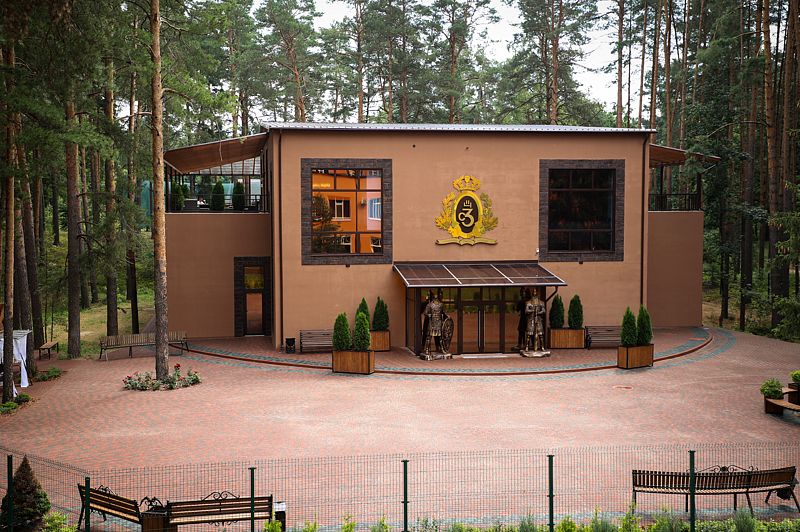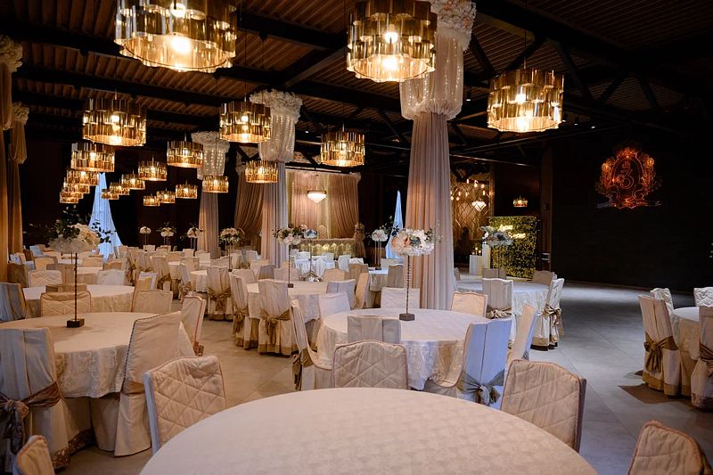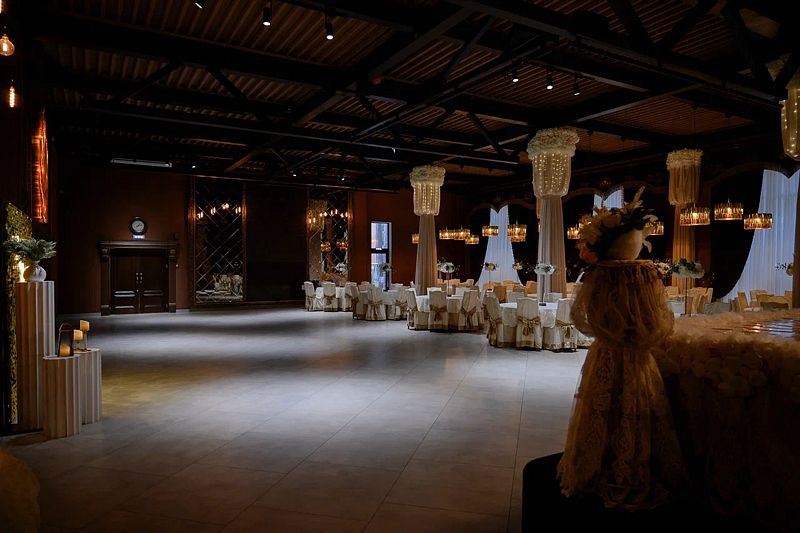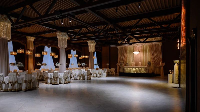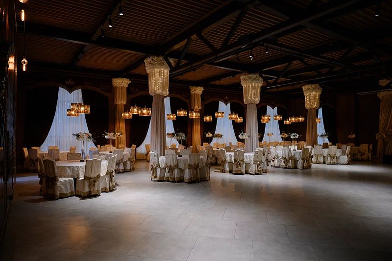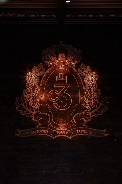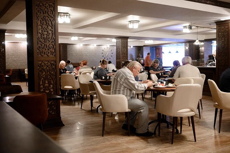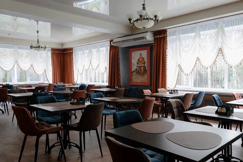 Зал вмещает до 200 человек. Из огромных панорамных окон открывается живописный вид на благоустроенную территорию санатория. Оформление зала в теплых бежево-коричневых тонах придает ему особую уютную атмосферу.