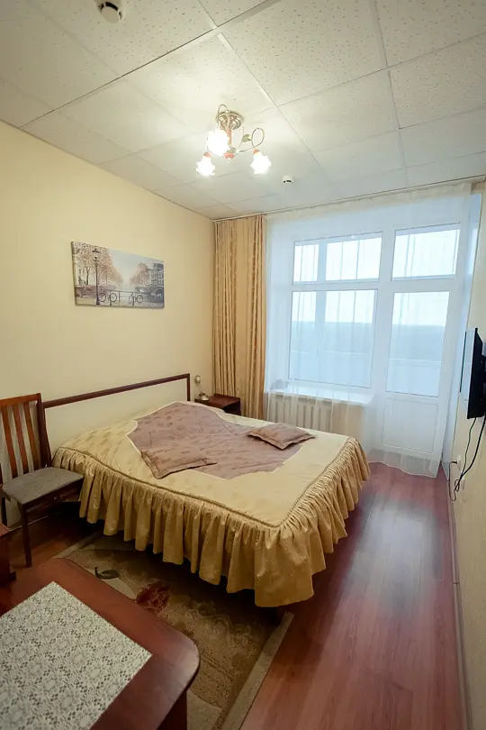 Просторный номер площадью 24 кв.м. В номере большая двуспальная кровать (160х200), просторный совмещенный санузел с ванной, ЖК-телевизор 32". Имеются дополнительные спальные средства: 2 кресла-кровати (80х190) или выкатной мини-диван (120х185). Все номера однотипны, различаться могут по цветовой гамме интерьера. Номера расположены на самом высоком этаже (9), из окна открывается вид на реку Волга (с захватом заднего двора и леса) или на сосновый лес. Фактический номер размещения определяется случайным образом исходя из загрузки и рационального использования номерного фонда. Возможная установка в номере детской кроватки за отдельную плату.