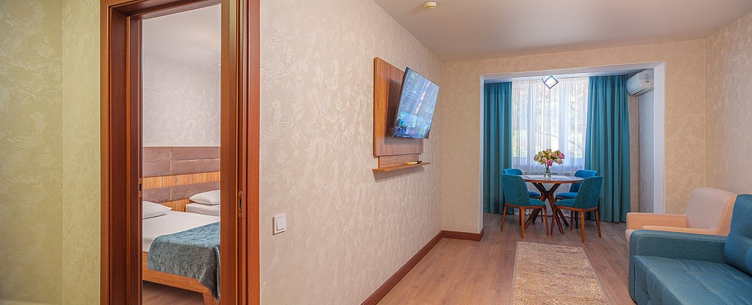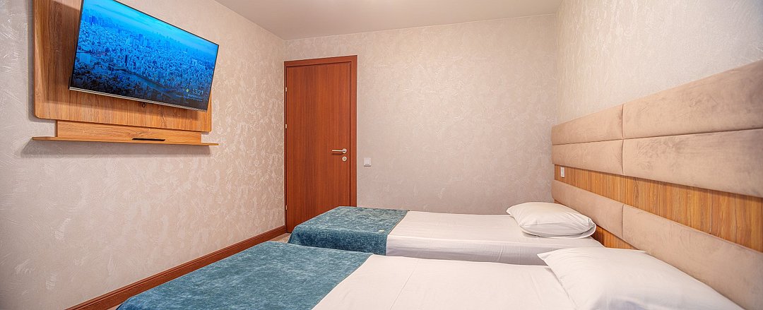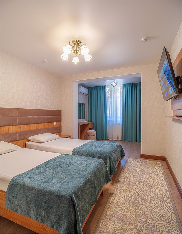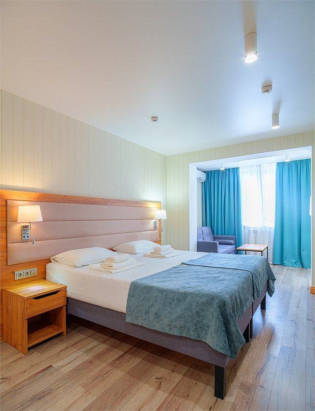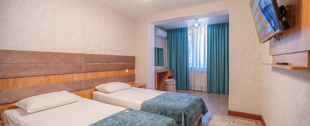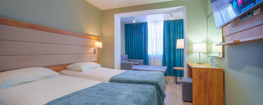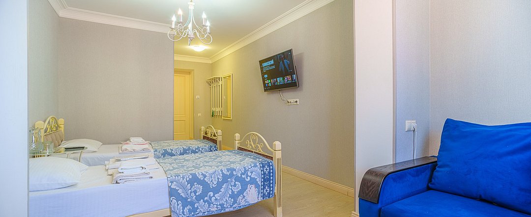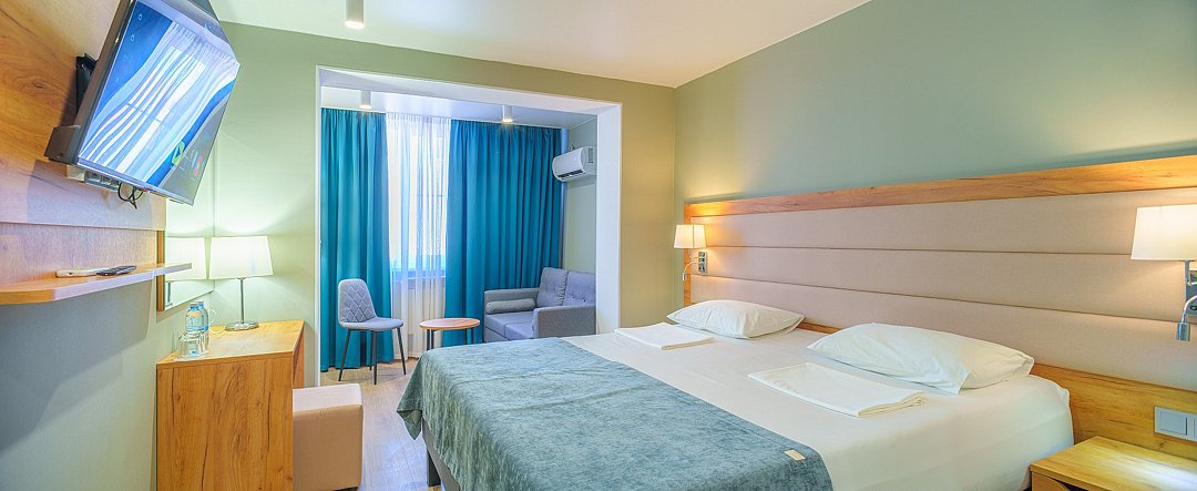 Просторные, полностью реновированные в 2025 году номера площадью 25 м² оформлены в светлых природных тонах и подходят для размещения с семьей или друзьями. Из окон некоторых номеров открывается частичный вид на Каспийское море. Функциональный дизайн создает комфортные условия для отдыха и работы. В номере: - Одна двуспальная кровать 180х200 см или две односпальные кровати 90х200 см - Раскладной диван 140х190 см - Телевизор с функцией SmartTV - Мини-холодильник - Кондиционер - Ванная комната с душевой кабиной - Косметические принадлежности - Фен - Халаты - Тапочки - Чайная станция - Бутилированная вода - WiFiУслуги и удобства