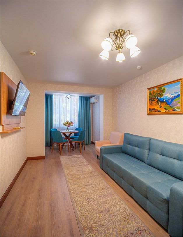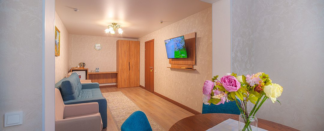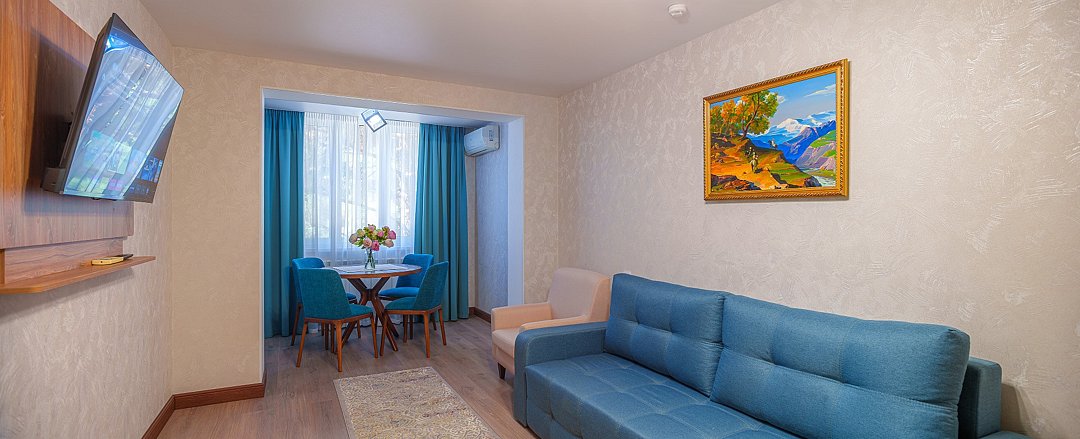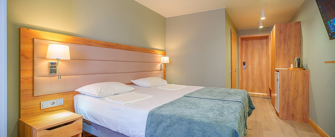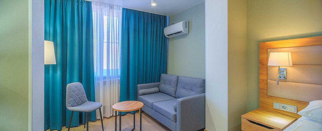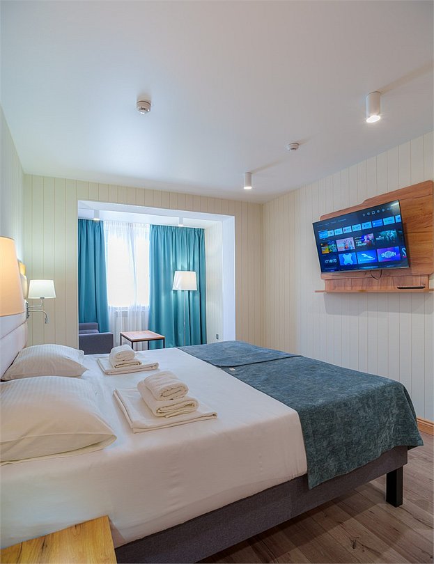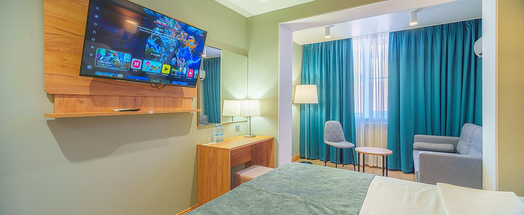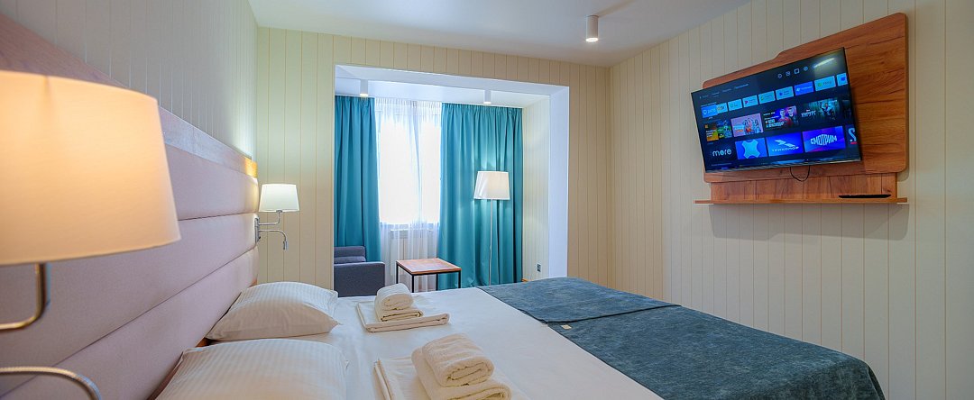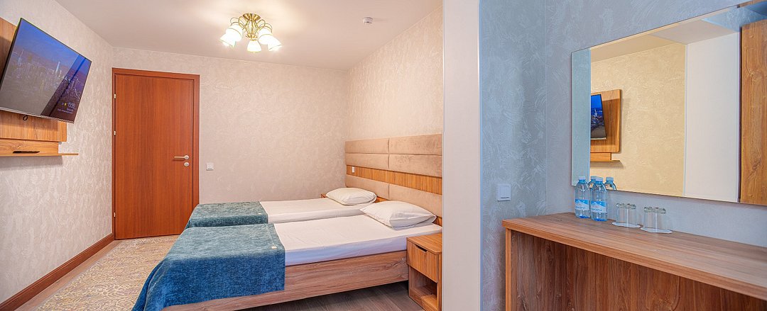 Просторные, полностью реновированные в 2025 году номера площадью 25 м² оформлены в светлых природных тонах и подходят для размещения с семьей или друзьями. Из окон некоторых номеров открывается частичный вид на Каспийское море. Функциональный дизайн создает комфортные условия для отдыха и работы. В номере: - Одна двуспальная кровать 180х200 см или две односпальные кровати 90х200 см - Раскладной диван 140х190 см - Телевизор с функцией SmartTV - Мини-холодильник - Кондиционер - Ванная комната с душевой кабиной - Косметические принадлежности - Фен - Халаты - Тапочки - Чайная станция - Бутилированная вода - WiFiУслуги и удобства