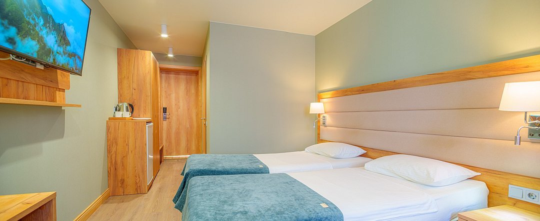 Однокомнатный номер с обновленным интерьером в теплых тонах и уютной зоной отдыха. В номере: - Две кровати 90х200 см - Телевизор с функцией SmartTV - Мини-холодильник - Кондиционер - Ванная комната с душевой кабиной - Косметические принадлежности - Фен - Халаты - Тапочки - Чайная станция - WiFiУслуги и удобства