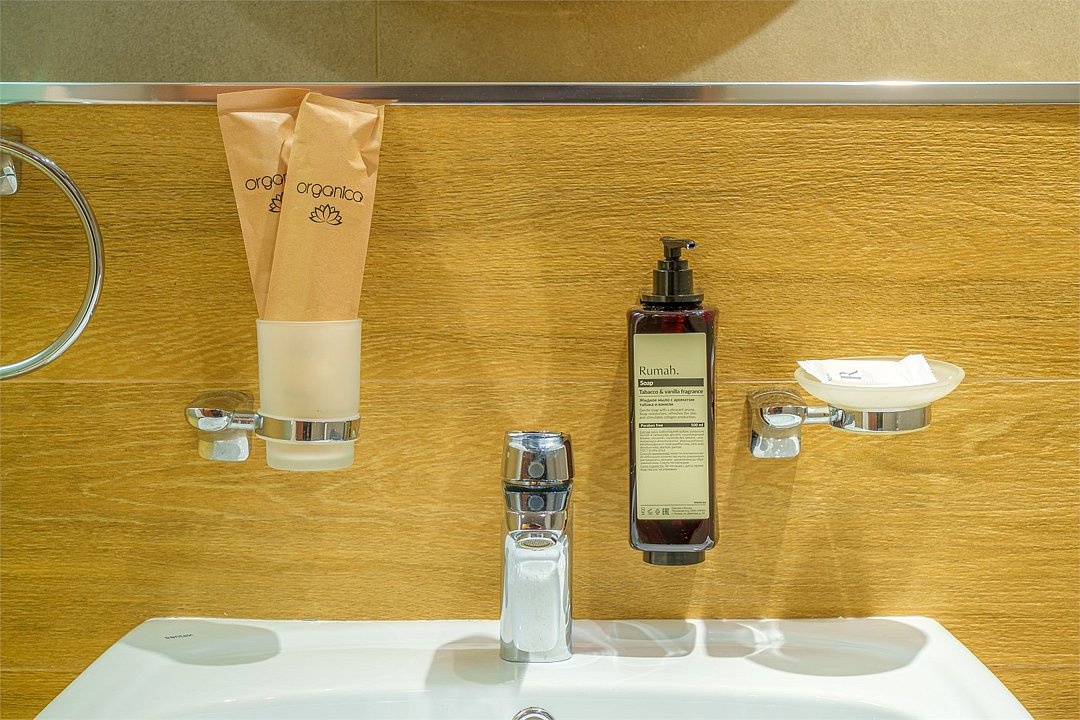 два телевизора, Wi-Fi, холодильник, кондиционер, светильник, фен, кофемашина, ванная комната, халаты, тапочки, гигиенические средства, косметические средства, две односпальные или большая двуспальная кровать, кресла, стулья, шкаф для одежды, письменный стол, обеденный стол, зеркало, раковина, душ, стаканы, туалет, диван-кровать, раскладной диван, мини-холодильник, чайная станция, услуги прачечной (платно), вешалки-плечики, мылоВ номере