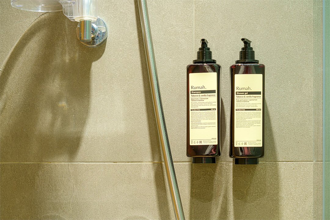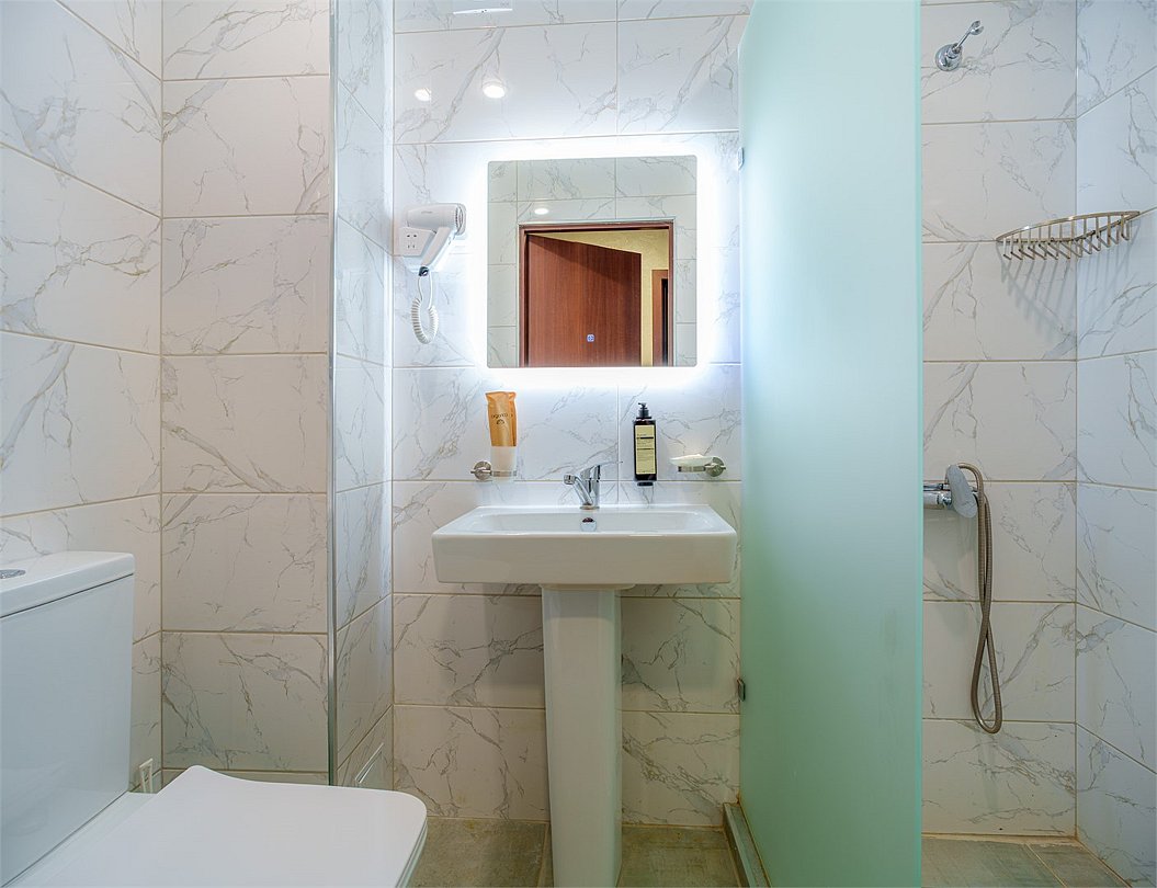 Wi-Fi, кондиционер, светильник, фен, душевая кабина, санузел, банные принадлежности, халаты, гигиенические средства, двуспальная кровать, гладильная доска, кресла, шкаф для одежды, журнальный столик, зеркало, кулер на этаже, вид во двор, туалет, телевизор с плоским экраном, мини-холодильник, телевизор со Smart TV, чайная станция, услуги прачечной (платно), вешалки-плечики, мылоВ номере