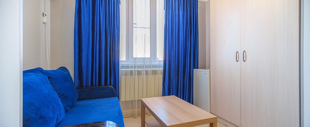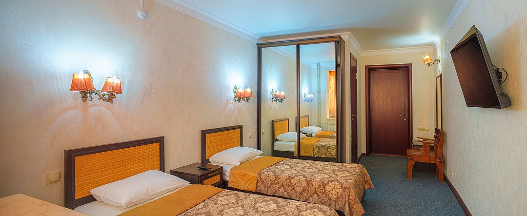 Wi-Fi, кондиционер, светильник, фен, душевая кабина, санузел, банные принадлежности, халаты, гигиенические средства, две односпальные кровати, гладильная доска, шкаф для одежды, журнальный столик, зеркало, унитаз, кулер на этаже, кресло, вид во двор, туалет, раскладной диван, телевизор с плоским экраном, мини-холодильник, телевизор со Smart TV, чайная станция, услуги прачечной (платно), вешалки-плечики, мылоВ номере