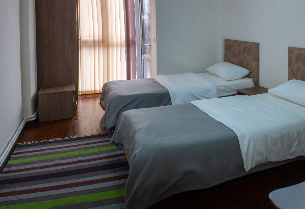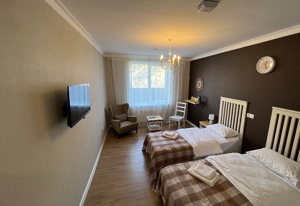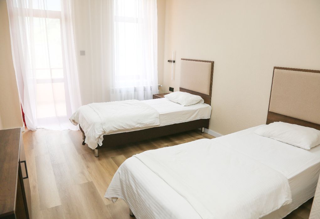 Просторный номер с окнами и балконом на курортную территорию, бассейн и Кавказские горы. Посещение открытого отапливаемого (+26С) бассейна в летнее время включено в стоимость проживания. Две односпальных кровати, письменный стол, стулья. Ванная комната с умывальником, косметикой для душа и ванной. По требованию предоставляются фен, утюг. В каждом номере из под крана течет структурированная горная вода из лечебного источника. Информационная папка в номере, расскажет вам о всех имеющихся возможностях курорта и экскурсиях. Общий балкон-терраса.