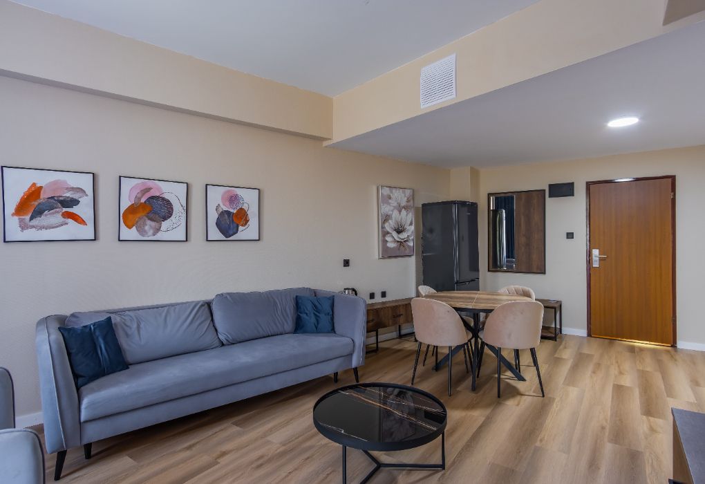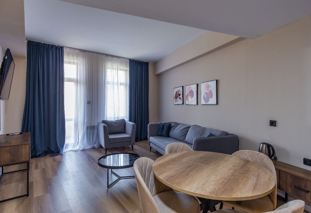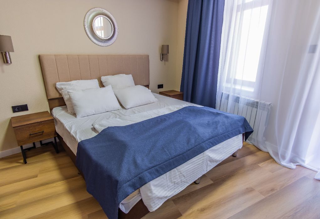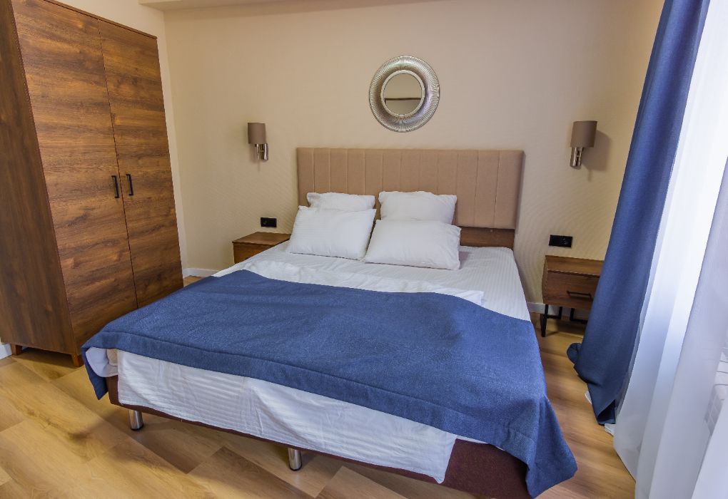 Апартаменты двухкомнатные (до 4 человек): две спальни, кухня + ванная комната. Спальня #1 — двуспальная кровать, две прикроватные тумбы, шкаф, трюмо+зеркало, плотные шторы. Спальня #2 — две односпальные кровати, две прикроватные тумбы, шкаф, плотные шторы. Кухня: оборудованная стенка, холодильник, газовая печь, телевизор, стол+стулья, набор посуды на 4 человека. Ванная комната: ванна, умывальник, санузел, ванные принадлежности. Рядом с апартаментами оборудована общая мангальная зона. У каждого номера отдельная беседка.