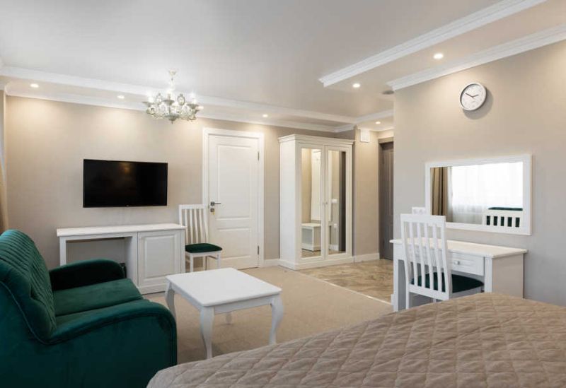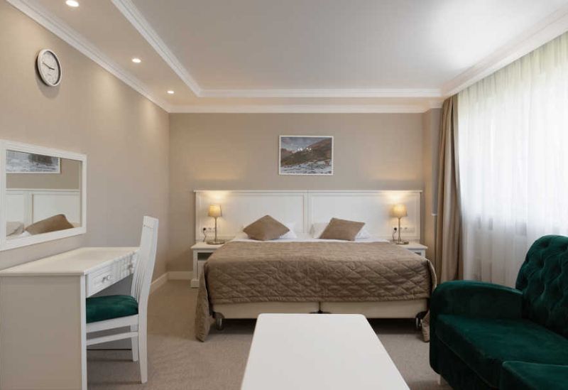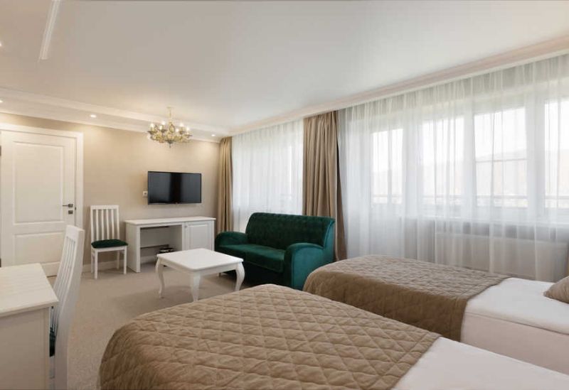Уютный двухместный номер с двуспальной кроватью и раскладным диваном, расположенный в новом корпусе. Номер, состоящий из спальни и собственной ванной комнаты, оформлен в светлых бежевых тонах и идеально подходит для комфортного отдыха и релакса. Вместимость до трёх человек, возможность смежного номера (connected rooms).
