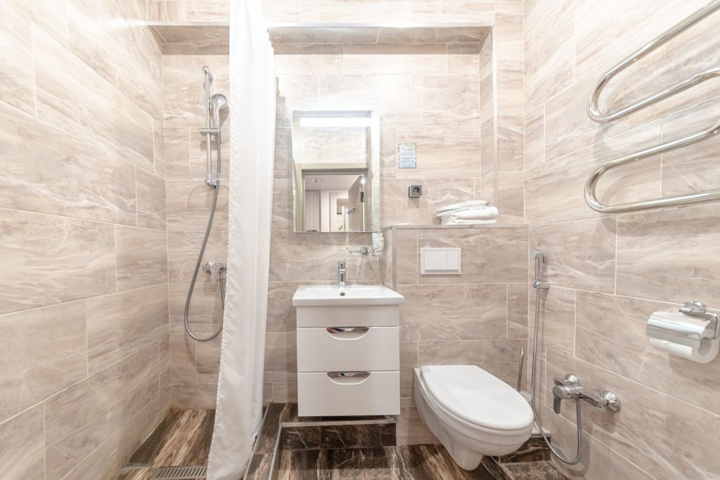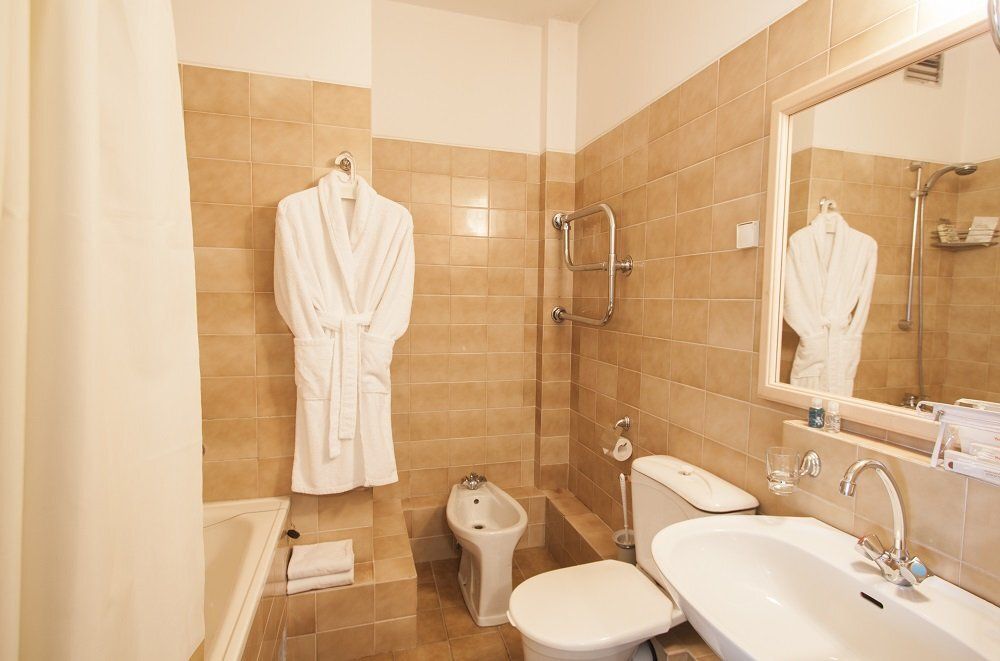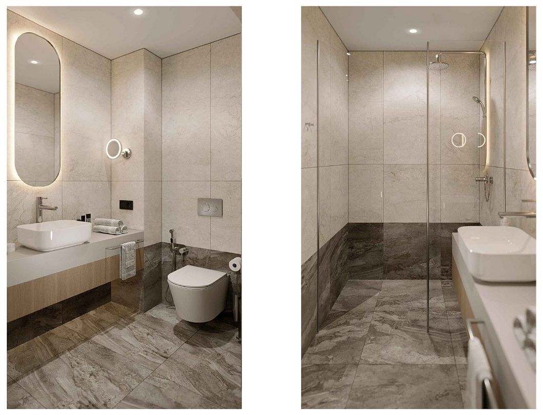 Санузел: душ, раковина, унитаз, биде, фен, туалетные принадлежности.