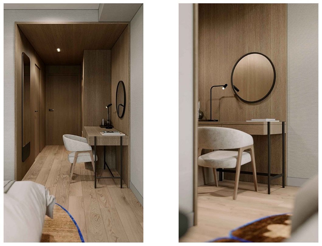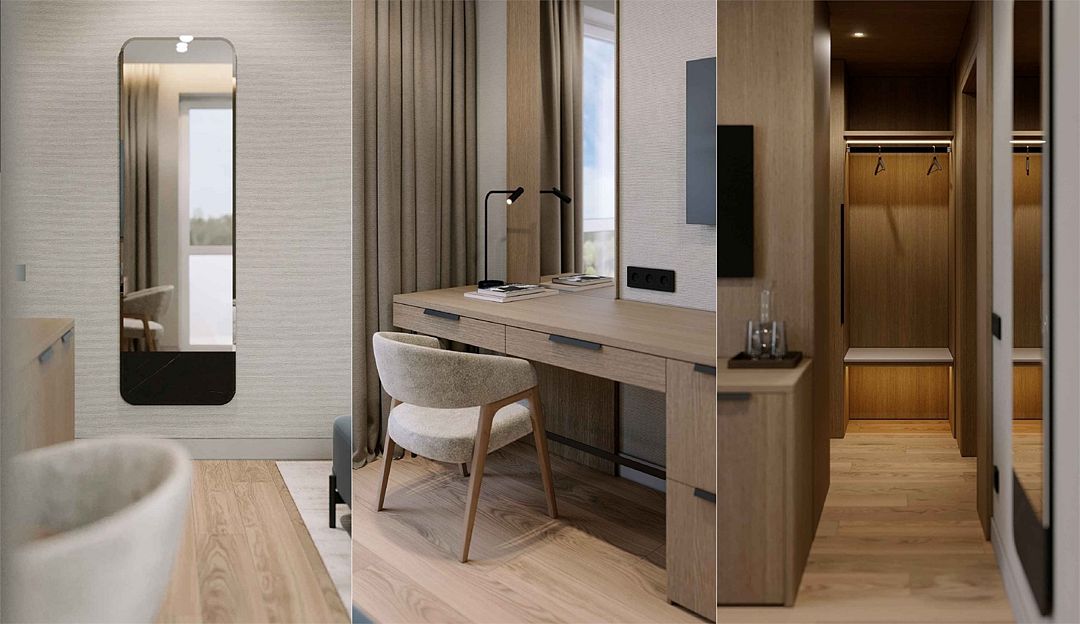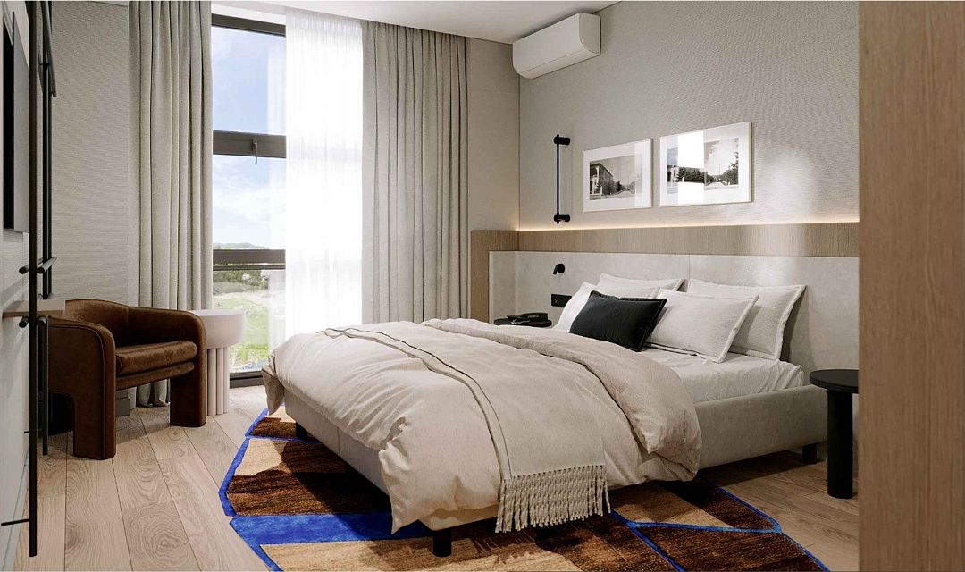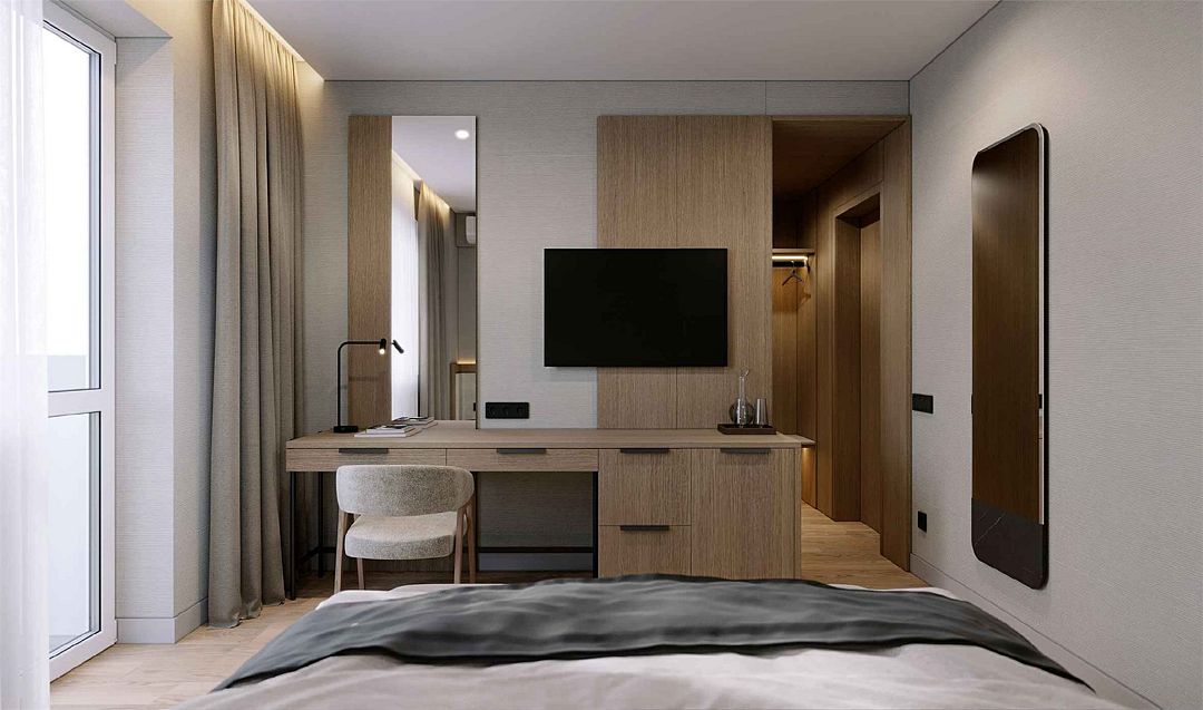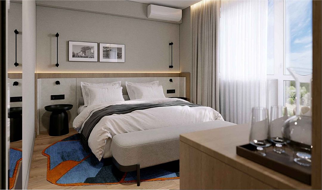 Мебель: две односпальные кровати (90х200 см.), или одна двуспальная (180х200 см.), прикроватные тумбочки, прикроватные светильники, встроенный шкаф, письменный стол, журнальный столик, стул, пуфик, напольная вешалка с зеркалом и багажницей, гостевые принадлежности.