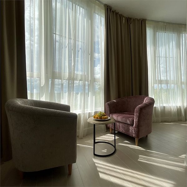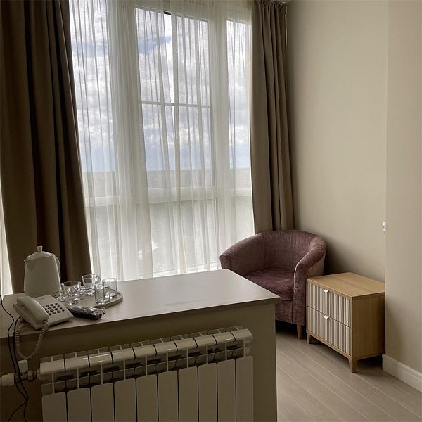 Просторный номер с гостиной и спальной зоной. Панорамные окна, вид на сад или парк. В гостиной зоне диван-кровать, в зоне отдыха кресла и журнальный столик, теплые полы.