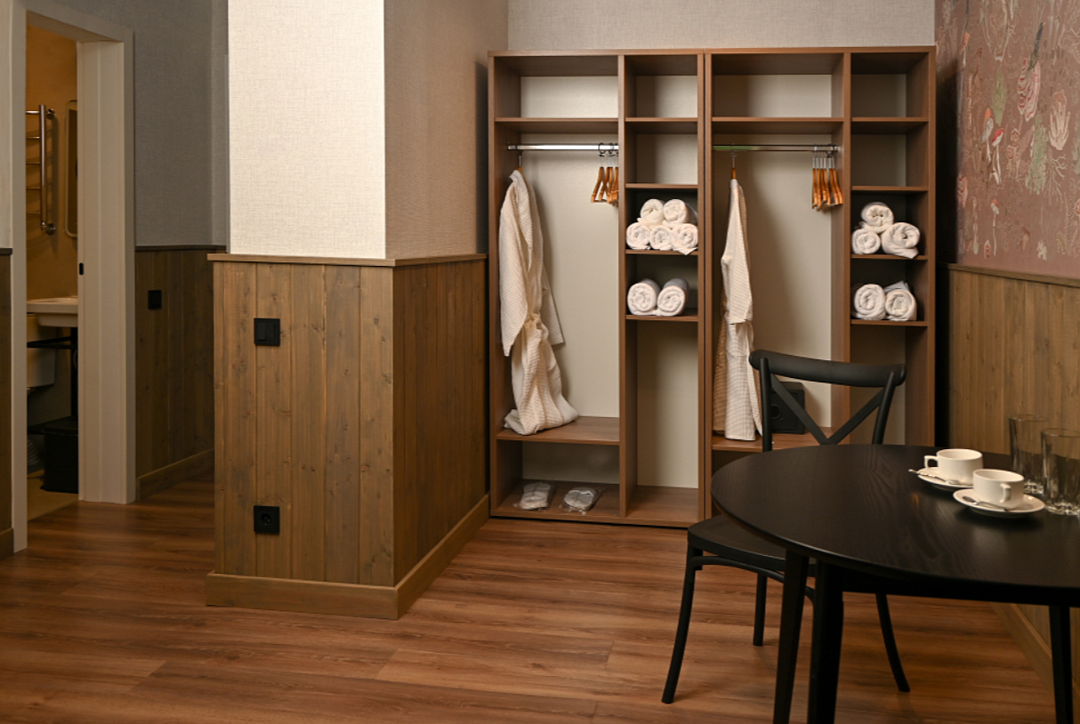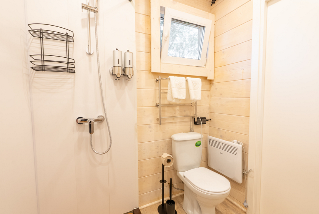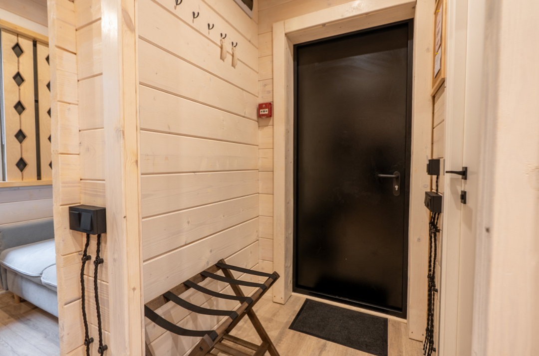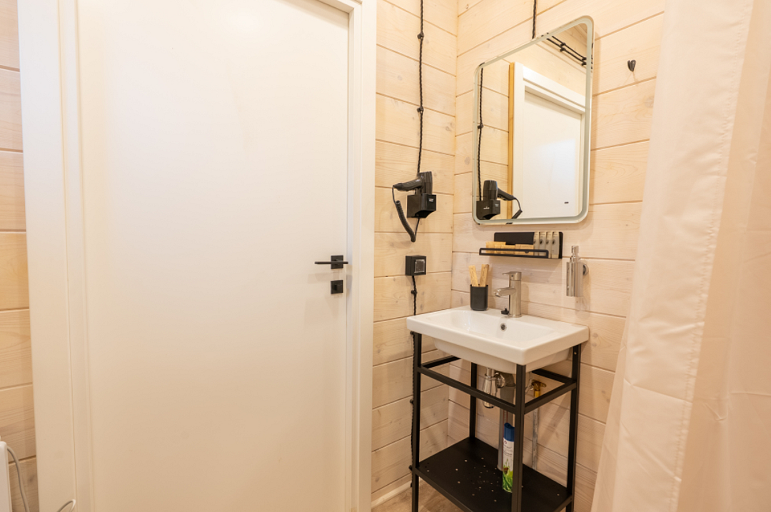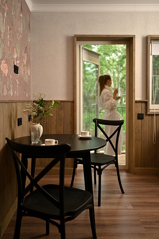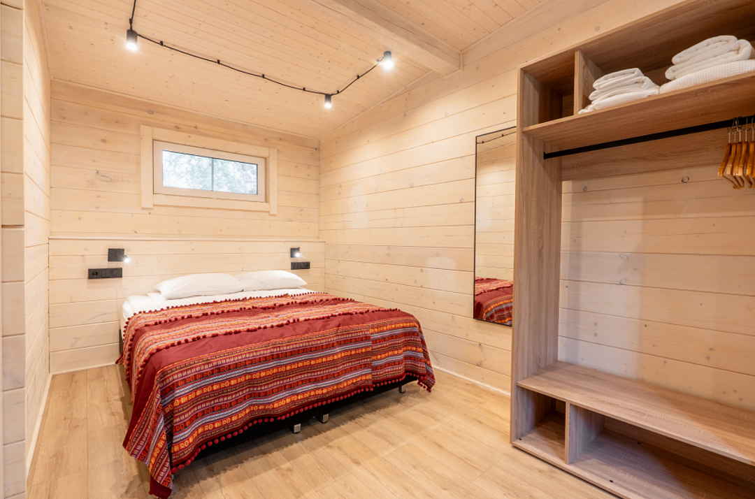 Домик выполнен из экологически чистого материала — дерева, которое дарит ощущение близости к природе. Внутри вас ждет теплая атмосфера, созданная благодаря натуральному дереву и минималистичному интерьеру. Просторная терраса приглашает насладиться утренним кофе на свежем воздухе или провести вечерние посиделки с друзьями.