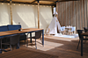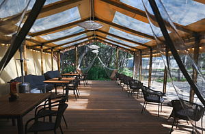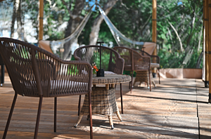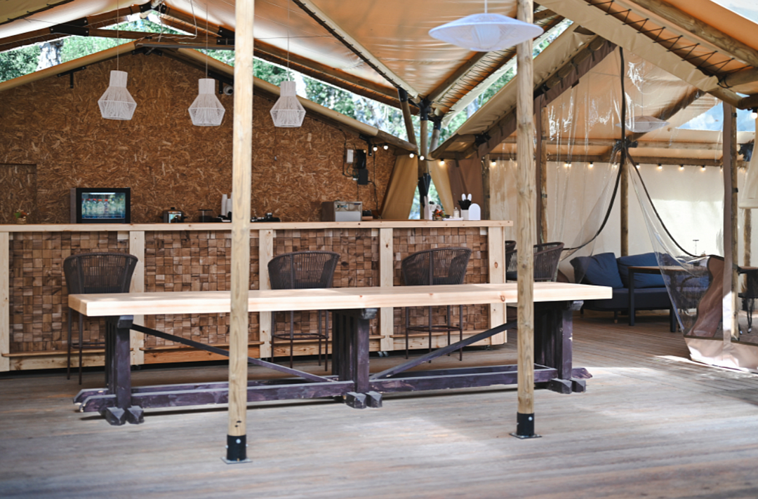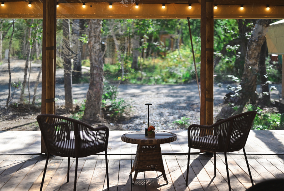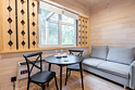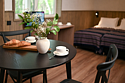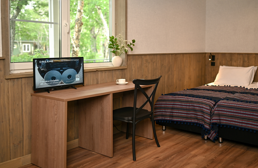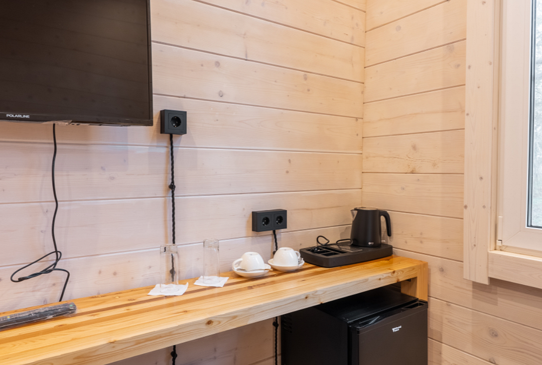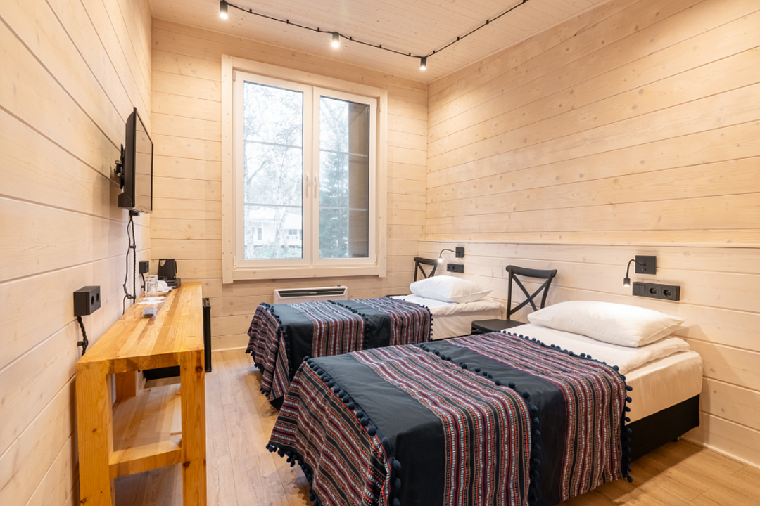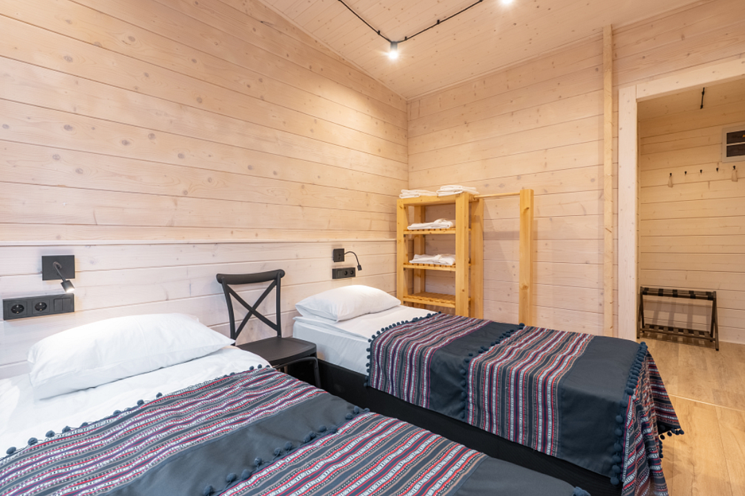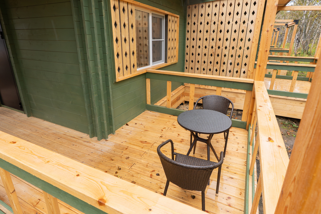 В номере есть небольшой обеденный стол с удобными стульями, две односпальные кровати, рядом с которыми располагаются прикроватные тумбочки для хранения личных вещей. В каждом домике есть собственная веранда. На ней установлены столик и стулья, идеальные условия для утреннего кофе или вечернего отдыха на свежем воздухе. Мангальная зона общая на территории.