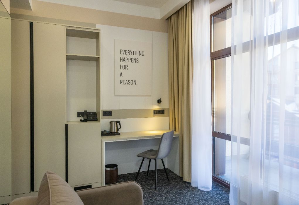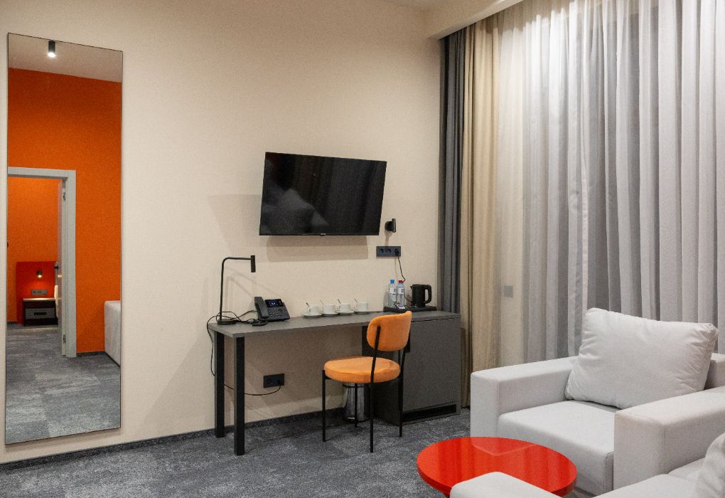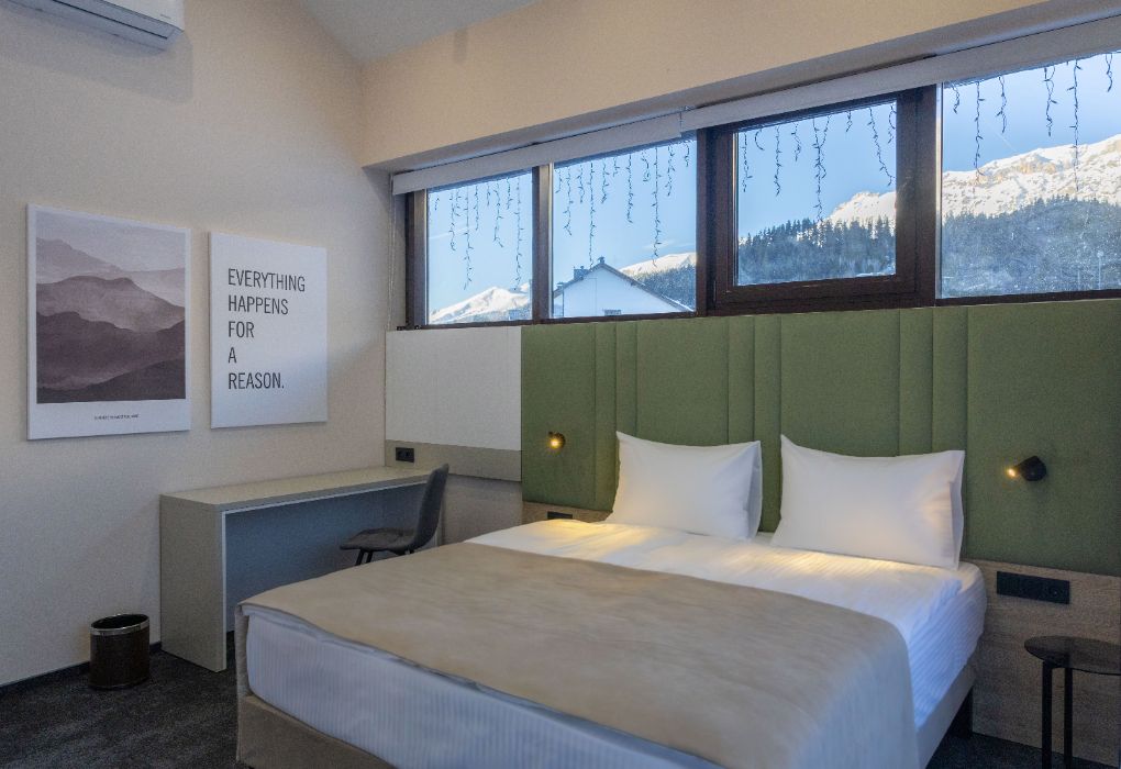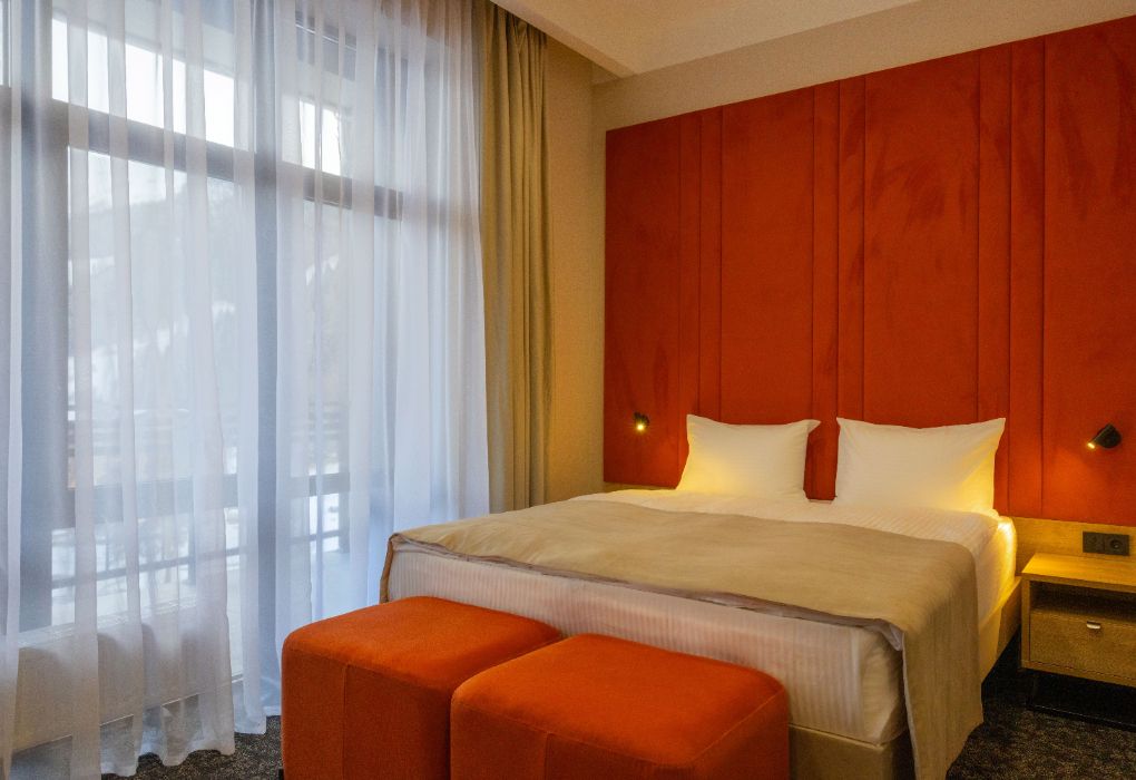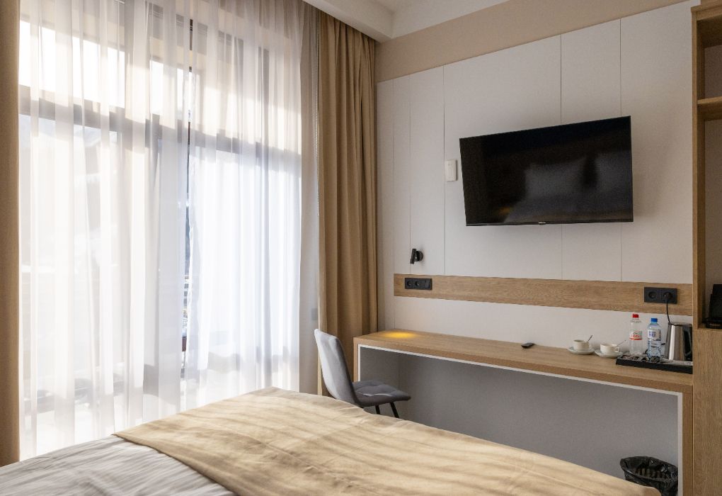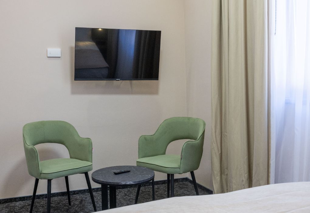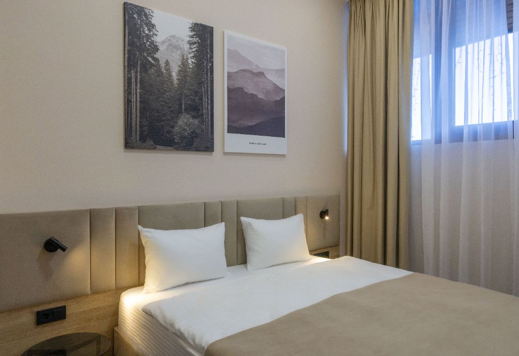 Гостиница состоит из 2 корпусов — двухэтажный и шестиэтажный (без лифта). Гостей ожидают номера одноместные и двухместные номера Стандарт, двухместные Студии и двухкомнатные Люксы. Во всех номерах приятный интерьер, хорошая современная мебель, собственный санузел с душем или ванной, телевизор, холодильник, панорамные окна с видами на горы.
