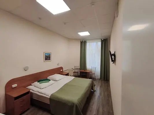 Отдельный двухместный однокомнатный номер с прихожей площадью от 13 до 18 м2. В номере две односпальные кровати, прикроватные тумбы, телевизор, холодильник, журнальный столик, два кресла/стула, платяной шкаф, балкон, санузел (душ, унитаз, умывальник). Номера отремонтированы в 2018-2021 годах с полной заменой сантехники, мебели, окон. В номере может разместиться от 1 до 3 человек (дополнительное место: раскладушка).