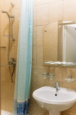 Современный двухкомнатный номер «блок» состоит из двух двухместных комнат. Площадь каждой комнаты от 11 до 16 м2. На блок (на 2 двухместных номера) общая прихожая, раздельный санузел (2 умывальника, унитаз, душ).