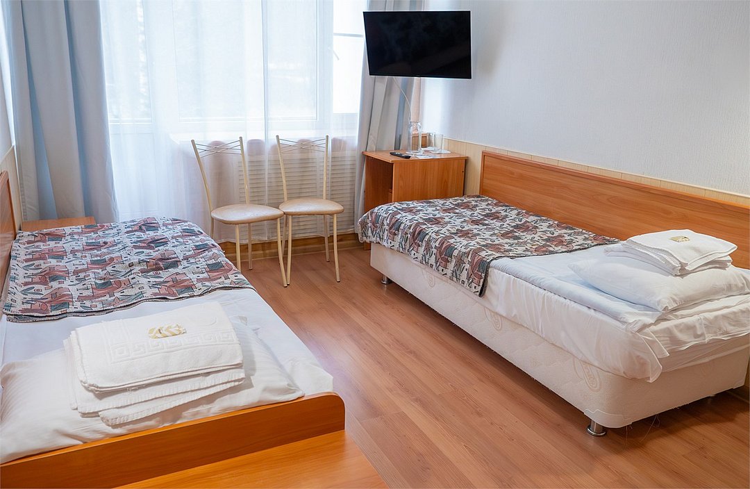 телевизор, светильник, две односпальные кровати, стулья, шкаф для одежды, зеркало, раковина, стол, санузел на этаже, душ на этаже, без питомцевВ гостиничном номере