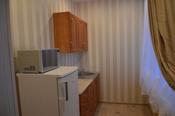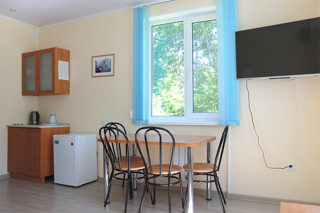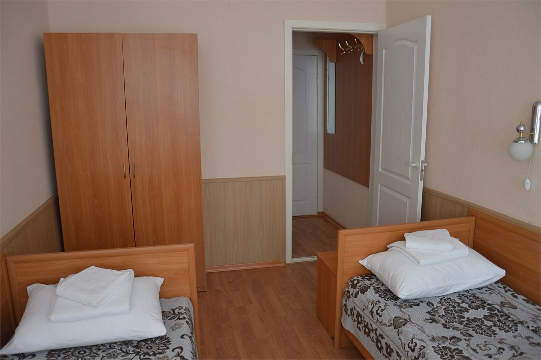 Площадь номера 22 кв. м. Сан. узел совмещенный (душ, электрополотенцесушитель). В номере ТВ, холодильник, кухонный гарнитур, посуда, чайник, набор мебели, кровати - полутороспальныеУслуги и удобства