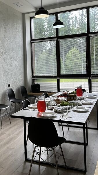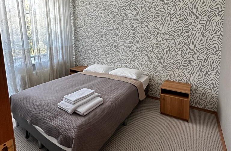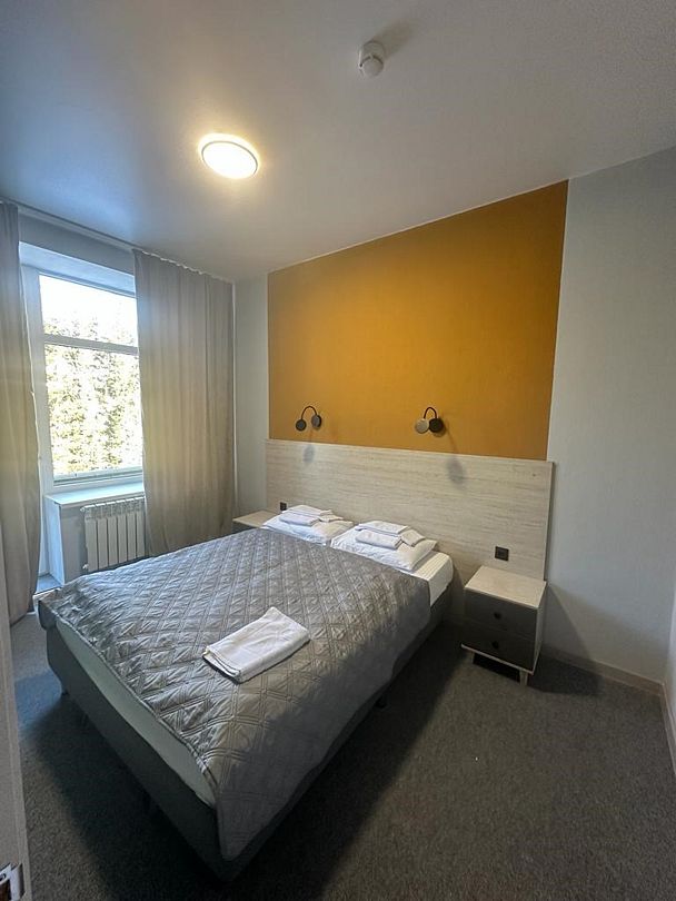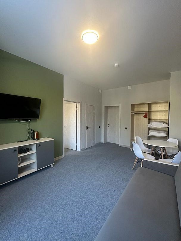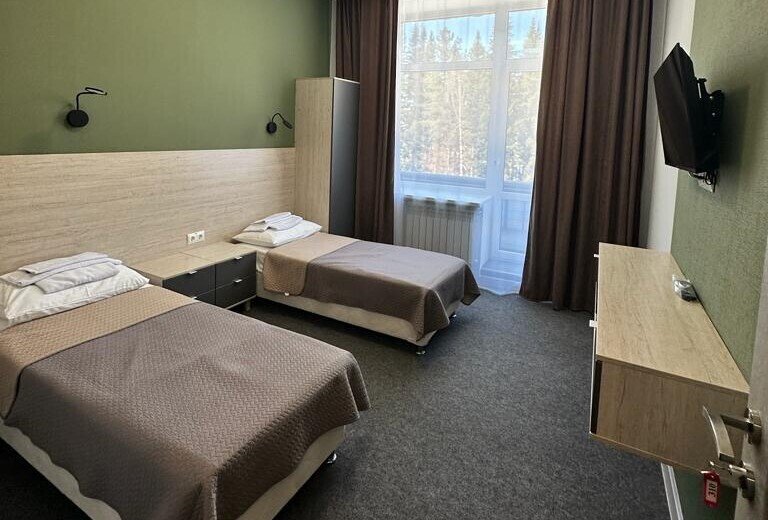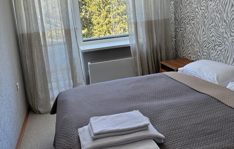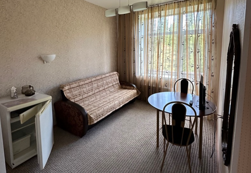 Интерьер санатория выполнен в светлых тонах, что создает уютную атмосферу. В каждом номере есть спальня и стандартная ванная комната с сантехникой. Гости могут отдохнуть и провести время в общей гостиной зоне. С балкона открывается живописный вид на горы.