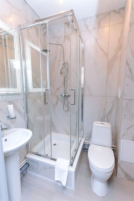 Ванная комната представлена душевой кабиной, раковиной и туалетом.