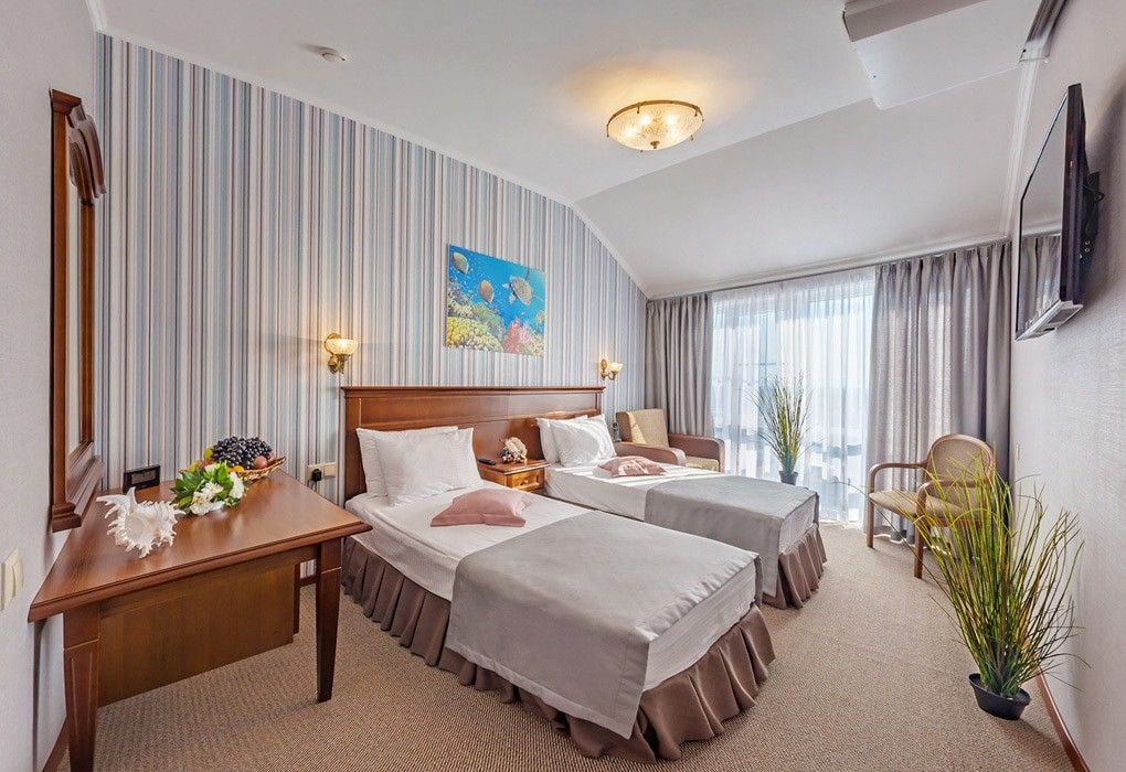 Современный уютный номер с двуспальной или двумя раздельными кроватями оформлен в приятных светлых тонах и оснащён удобной функциональной мебелью.
