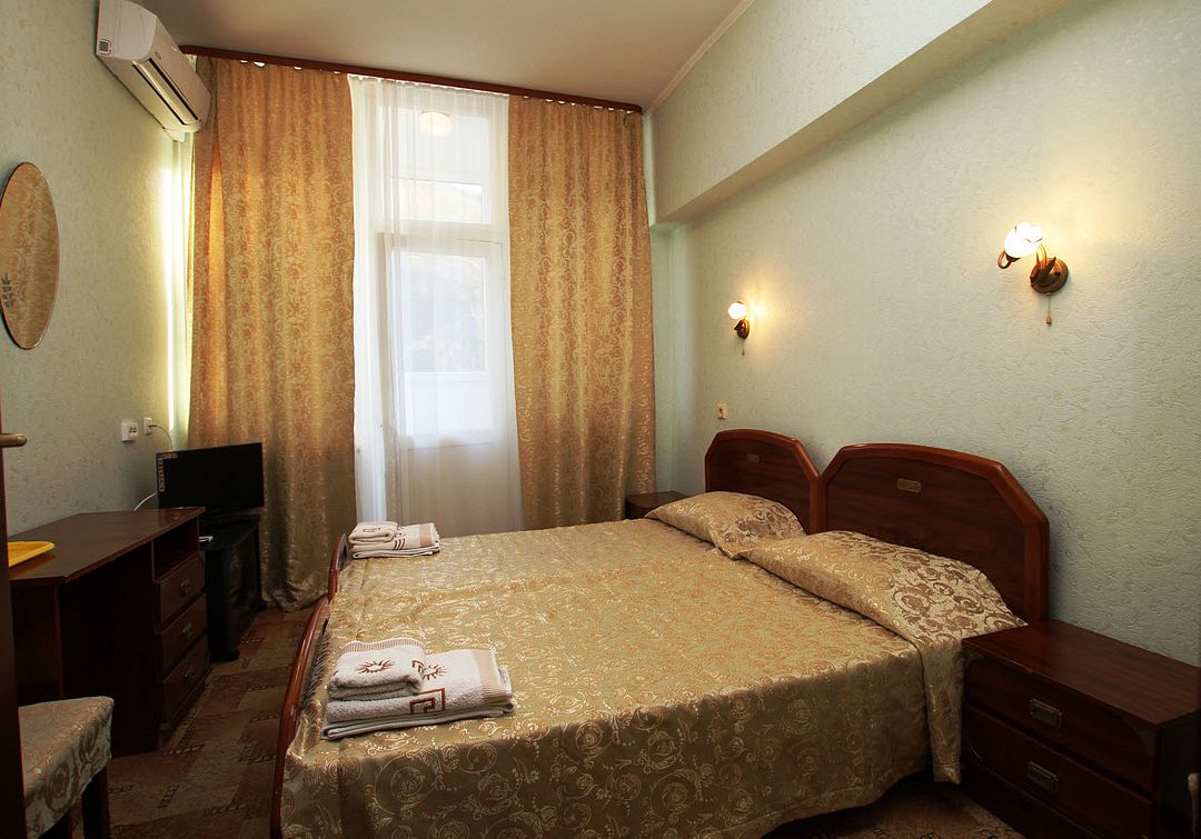 Большой, уютный двухкомнатный номер с гостиной, спальней и прихожей. Одна большая двуспальная кровать, балкон.