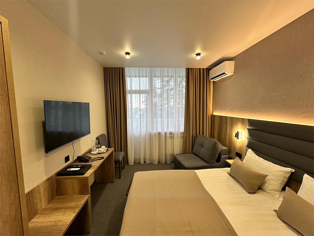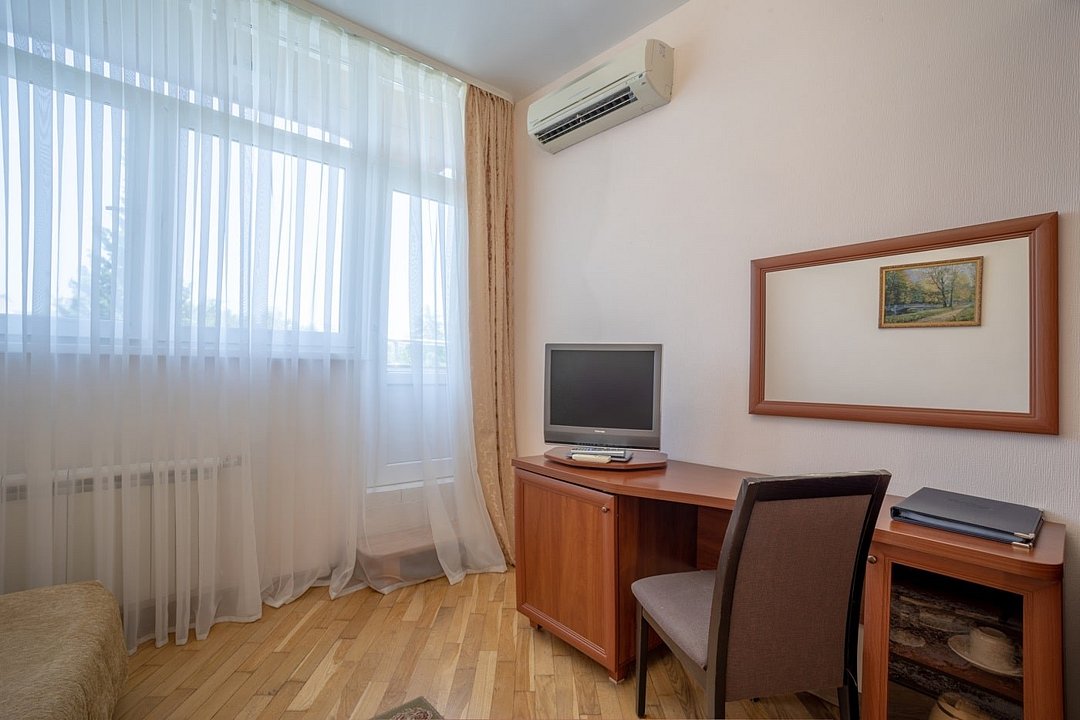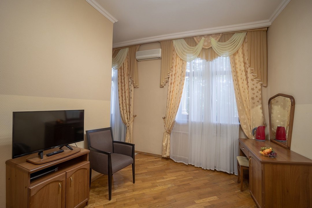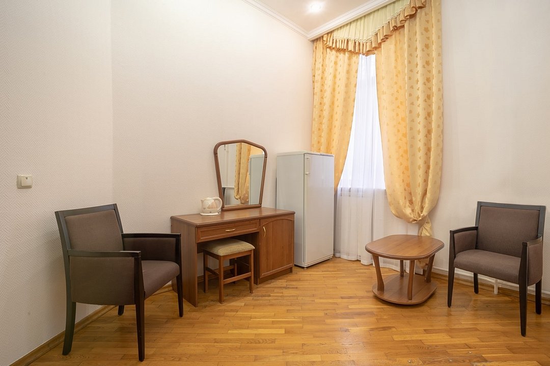 Санаторий может одновременно принимать более 400 гостей. Полноценное санаторно-курортное лечение подразумевает довольно длительное пребывание в здравнице, и номера оборудованы с учетом этого: в них есть все необходимое, от телевизоров до чайников и посуды.