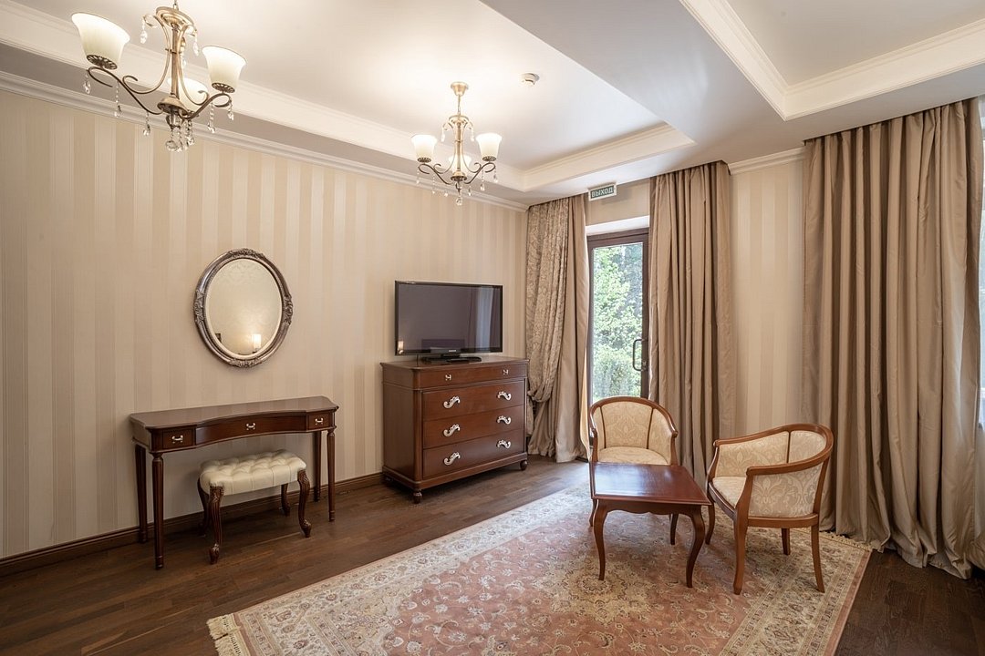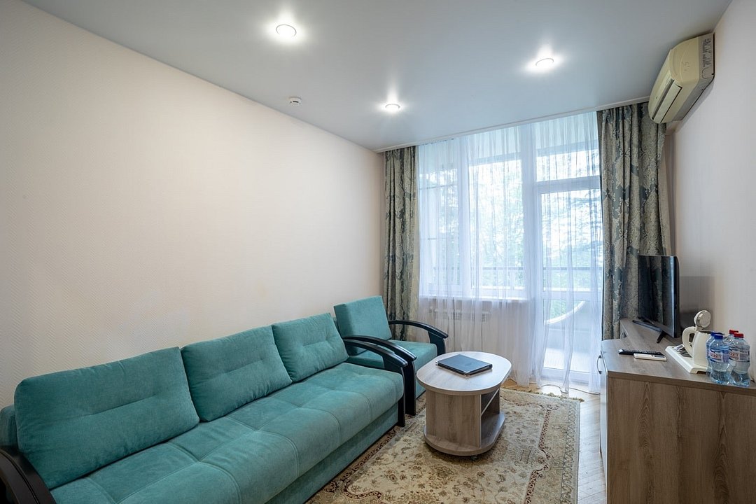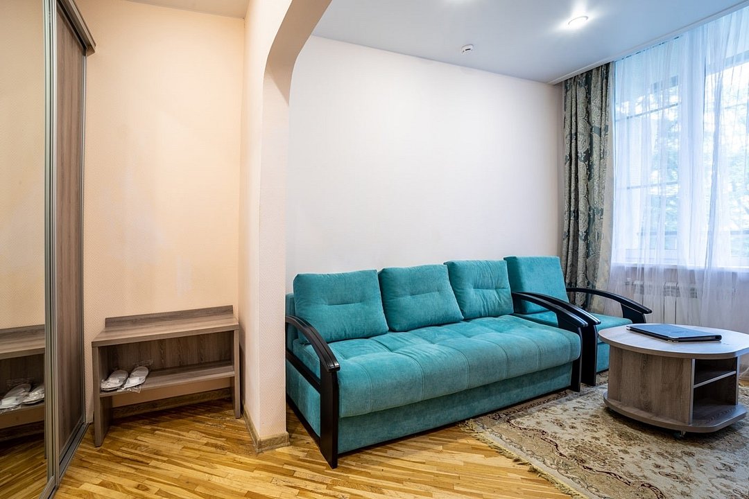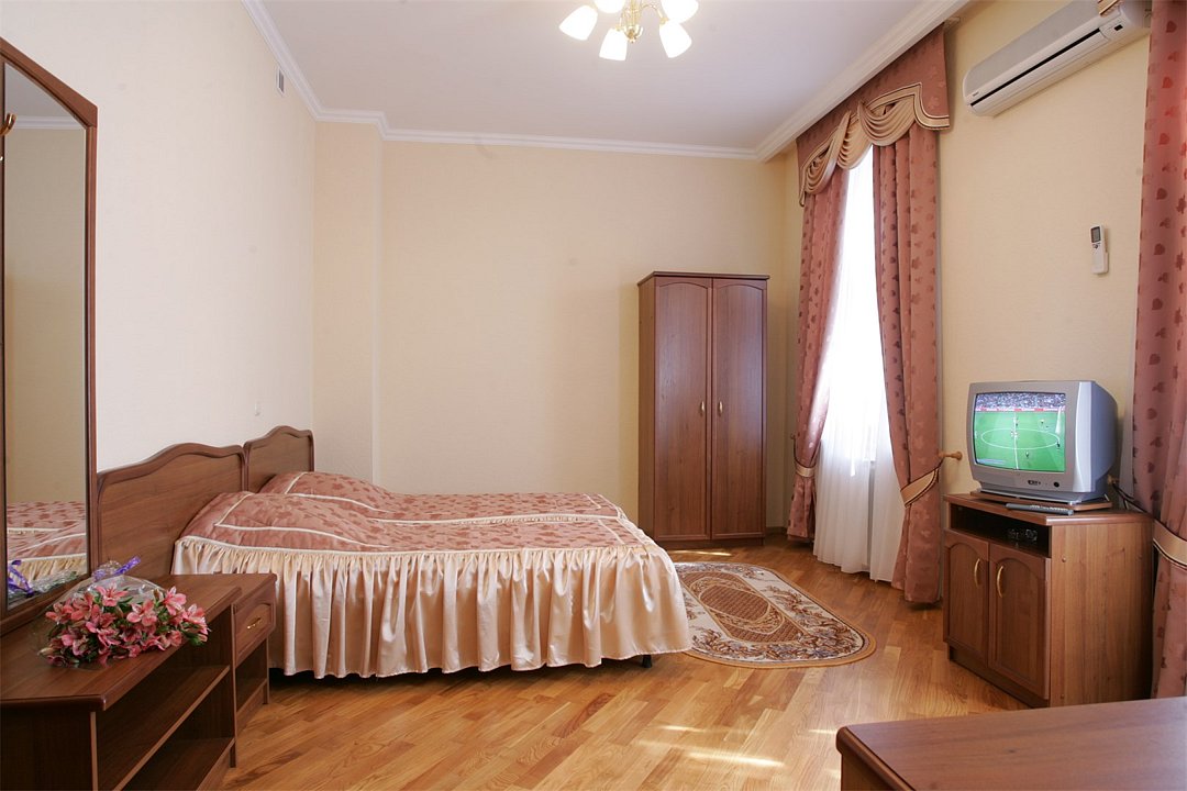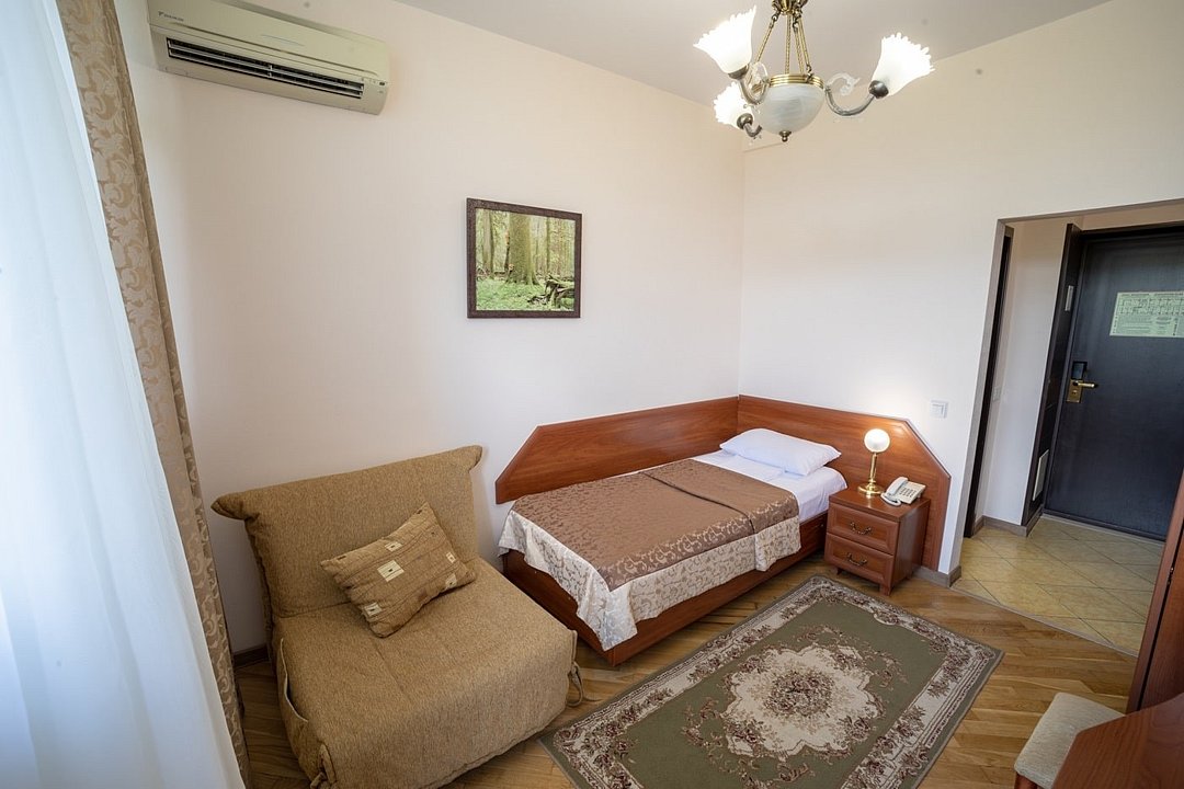 Санаторий может одновременно принимать более 400 гостей. Полноценное санаторно-курортное лечение подразумевает довольно длительное пребывание в здравнице, и номера оборудованы с учетом этого: в них есть все необходимое, от телевизоров до чайников и посуды.