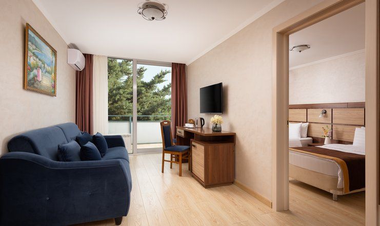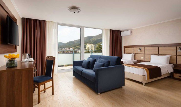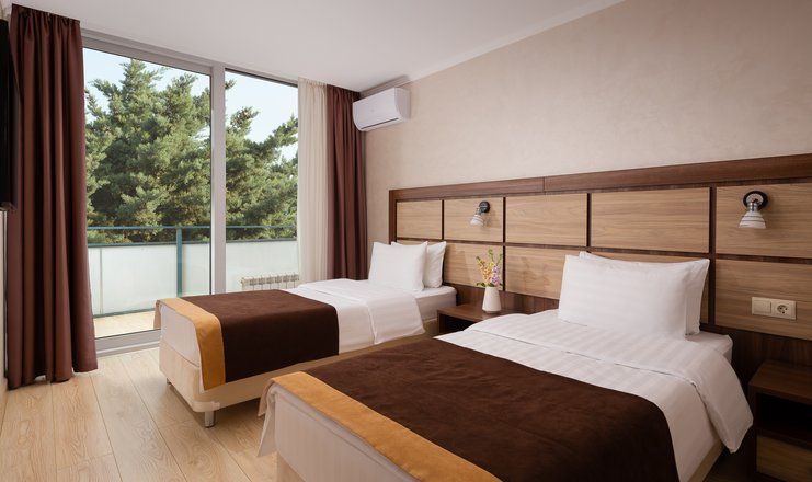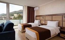 Элегантный и уютный улучшенный «Стандарт с балконом» придется по душе всем ценителям минимализма. Однокомнатный двухместный номер, площадью 15 кв.м. В помещении выполнен свежий стильный ремонт и установлена новая мебель. Большие окна, обилие мягкого рассеянного света и отсутствие вычурных декоративных элементов задают ощущение воздушности и простора. Номер оснащен двумя односпальными кроватями, сплит-системой, телевизором, холодильником, шкафом для одежды, чайным набором, сейфом, электрическим чайником, санузлом с душем. При необходимости, в номере устанавливается дополнительное спальное место. С балкона открывается панорамный вид на море, горы и городскую застройку.
