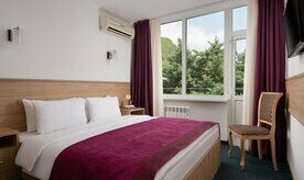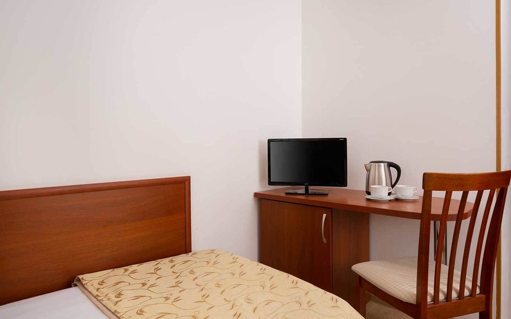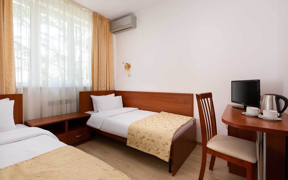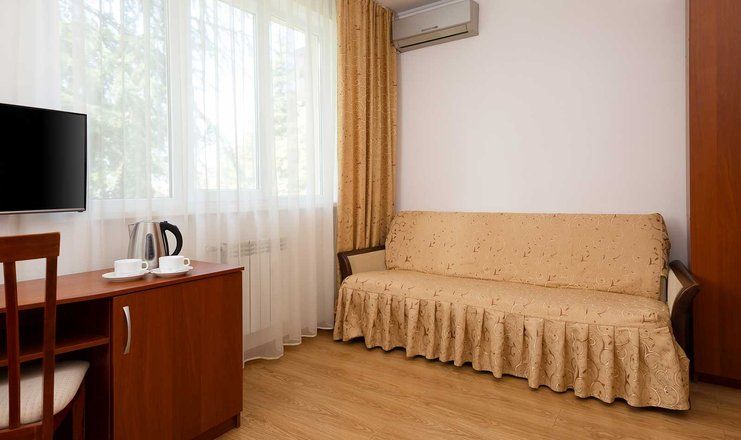 «Комфорт» без балкона – однокомнатный номер площадью 20 кв.м., идеальный пример для гостей, предпочитающих отдых с родителями или детьми. Номер оборудован удобными односпальными кроватями, дополнительным местом – креслом или диваном, сплит-системой, телевизором, холодильником, шкафом для одежды, чайным набором, сейфом, электрическим чайником, санузлом с душем. Все это обеспечит оптимальные условия для прекрасного отдыха
