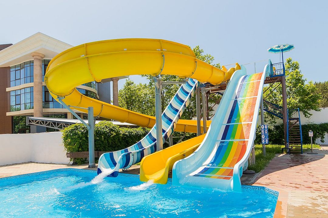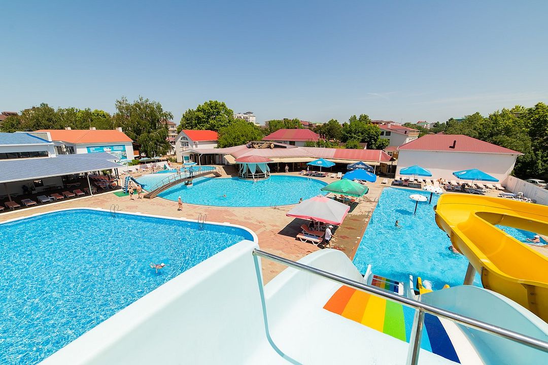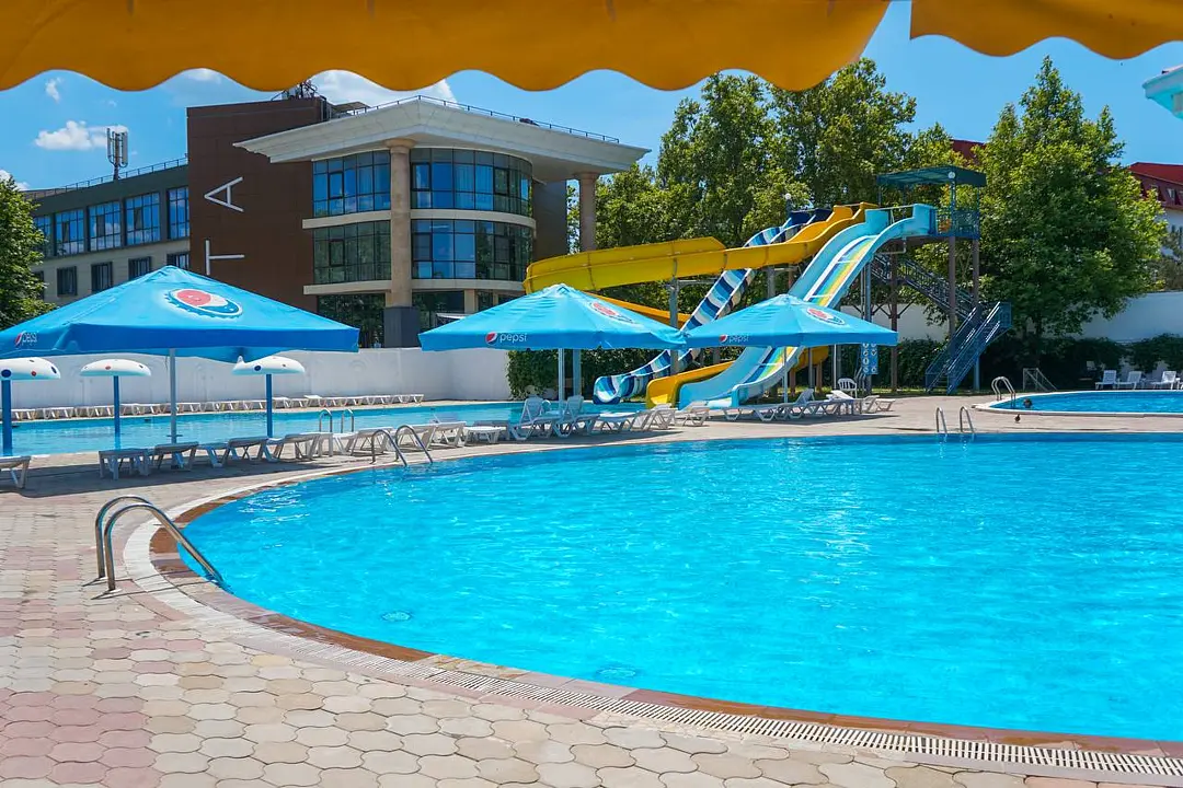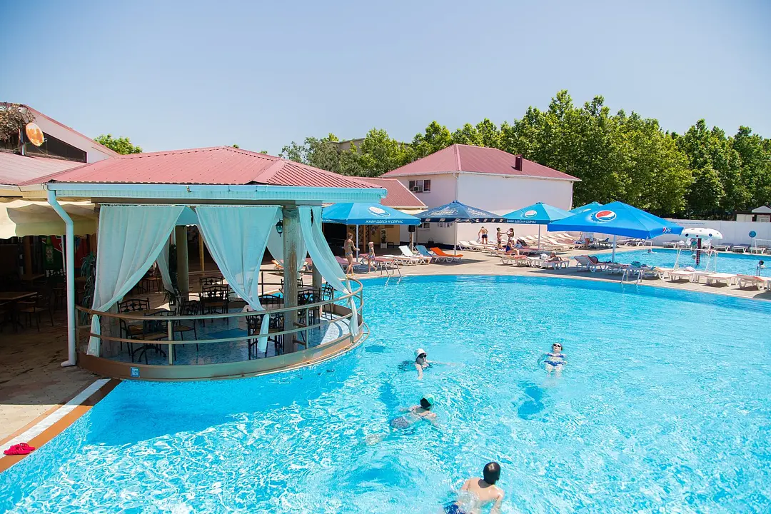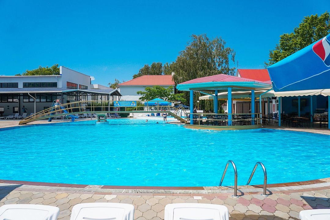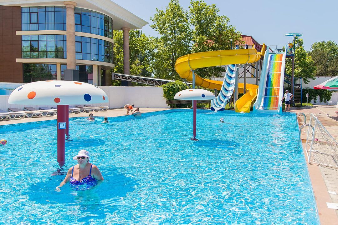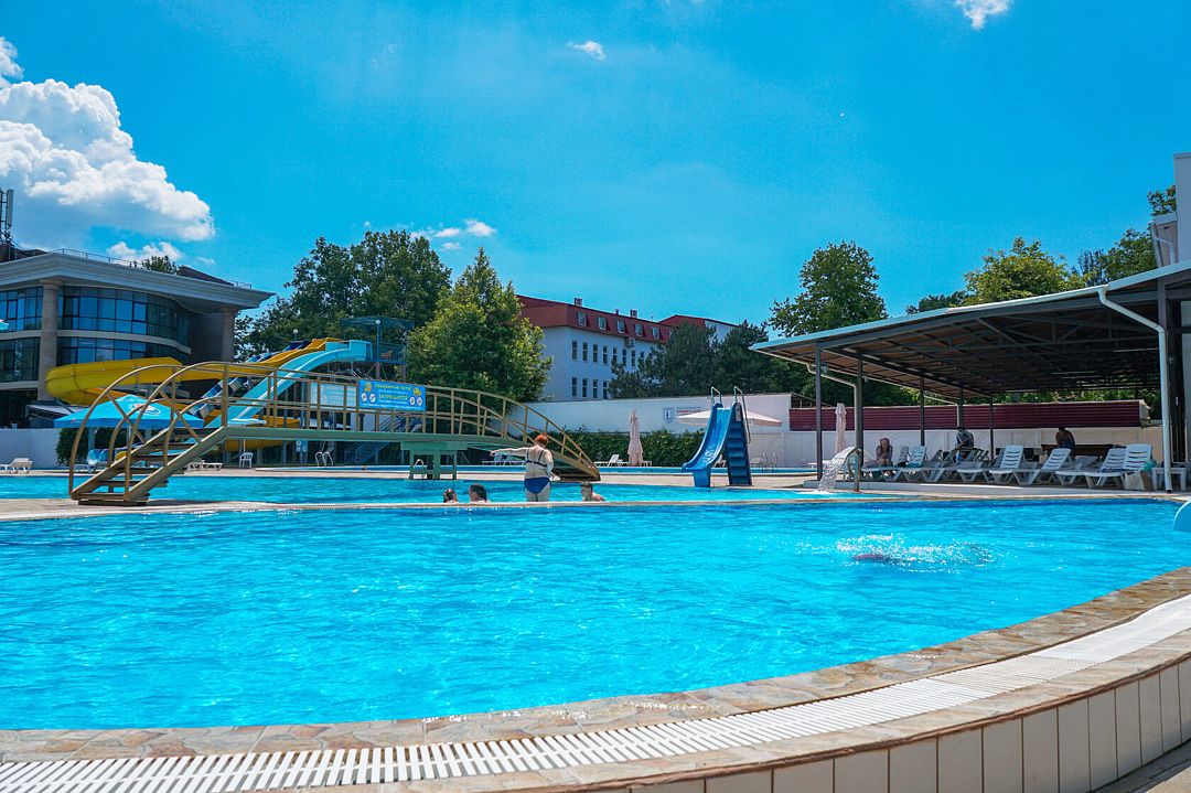 На территории санатория расположено четыре открытых бассейна, среди которых есть бассейн с гидромассажем и детский бассейн. С 13:00 до 15:00 проводится технический перерыв, а обработка территории и лежаков осуществляется с 14:20 до 15:00.