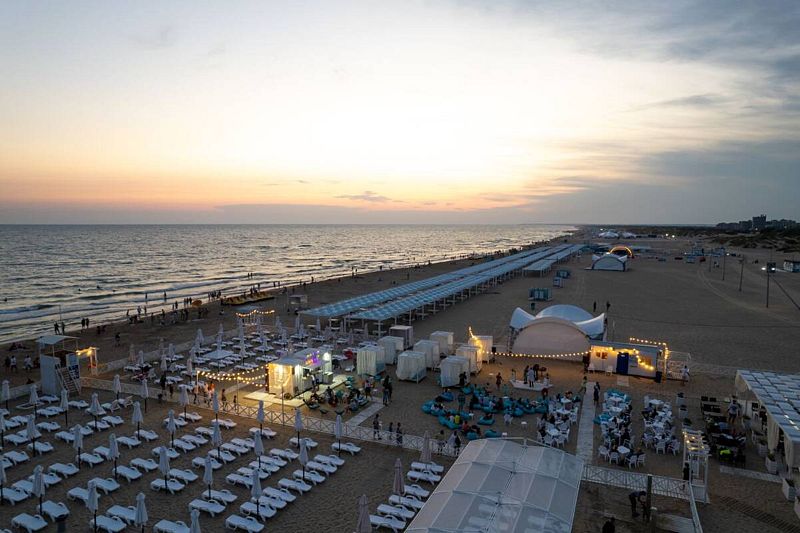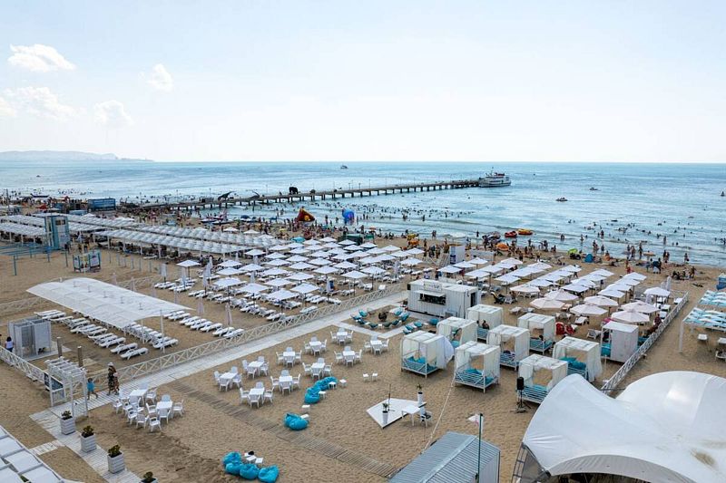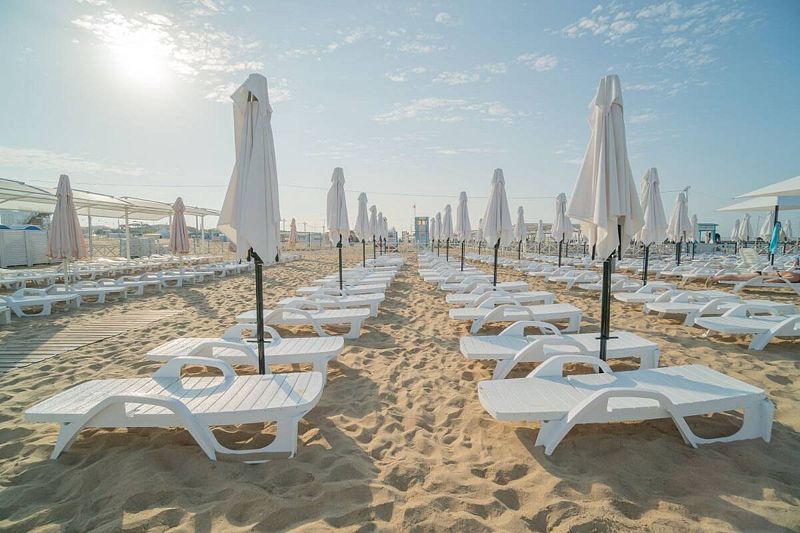 Собственный песчаный пляж санатория, оборудованный всем необходимым для комфортного отдыха, расположен всего в 300 метрах от жилых корпусов.