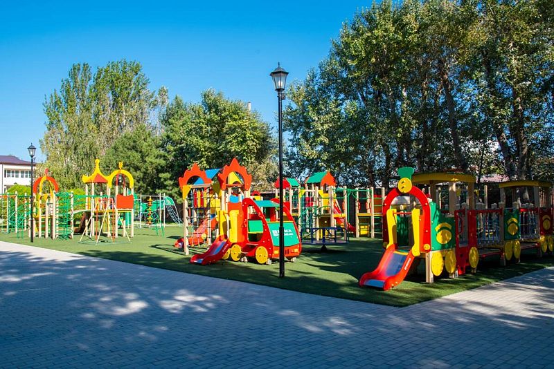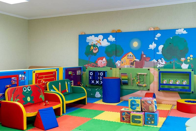 Детский бассейн оснащен водопадом и имеет безопасную глубину.