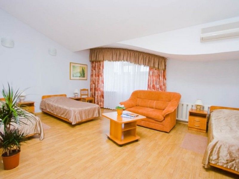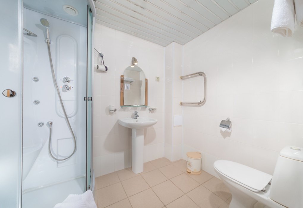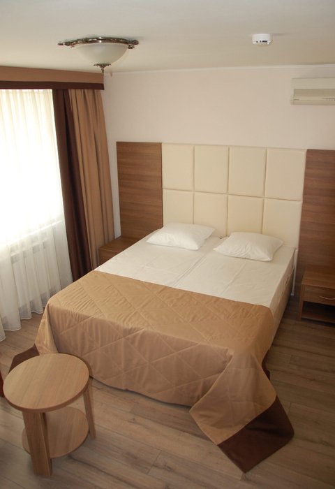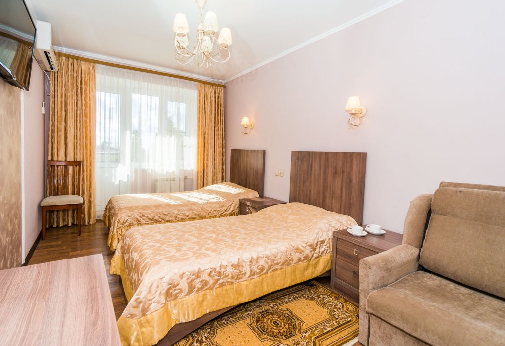 Площадь жилой комнаты 15 м2. Санитарная комната – 2,5 м2 оборудована умывальником, унитазом, душевым поддоном. В номере — две односпальные кровати, прикроватные тумбочки, платяной шкаф, туалетный столик, зеркало, стулья, комплект постельных принадлежностей, щетки для одежды и обуви, набор посуды, ключ для открывания бутылок, графин, а также информационные папки со справочными и рекламными материалами. Оснащение номера: телевизор; холодильник; сплит-система; электрический чайник.