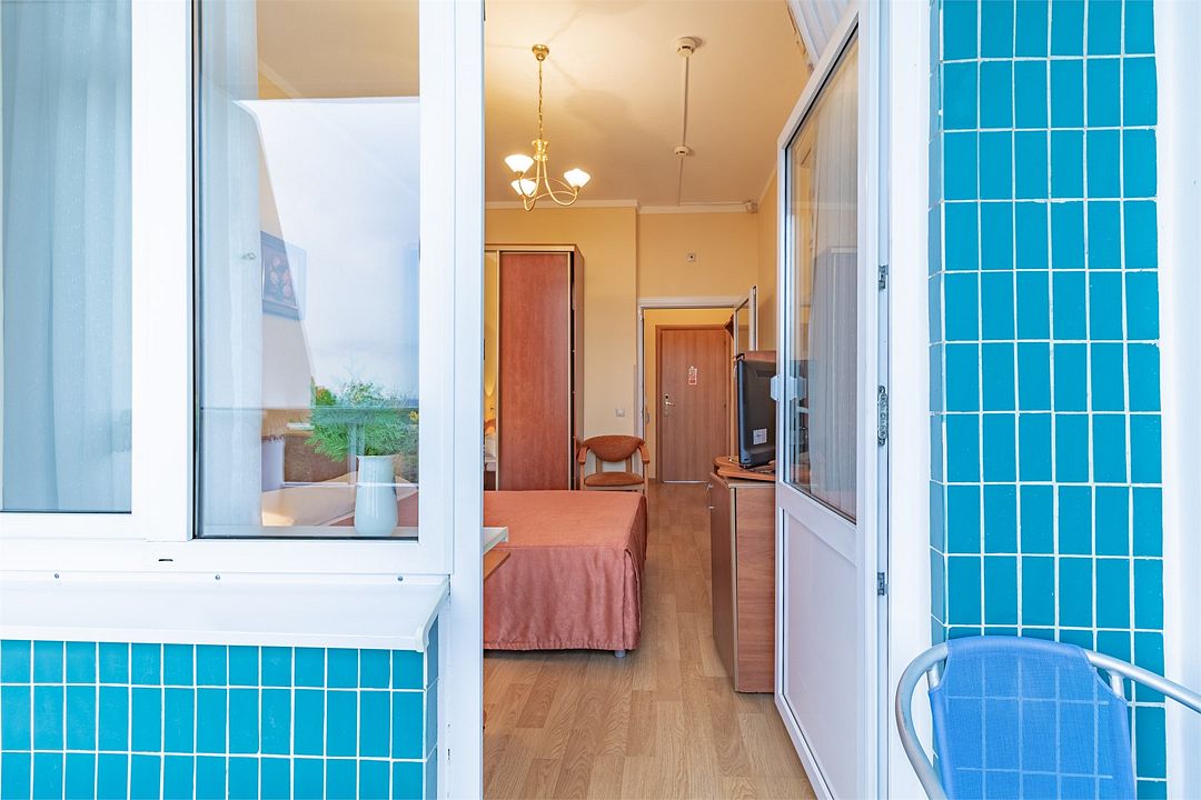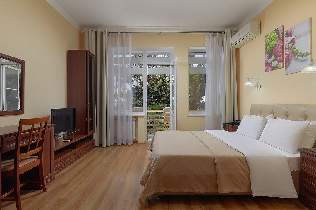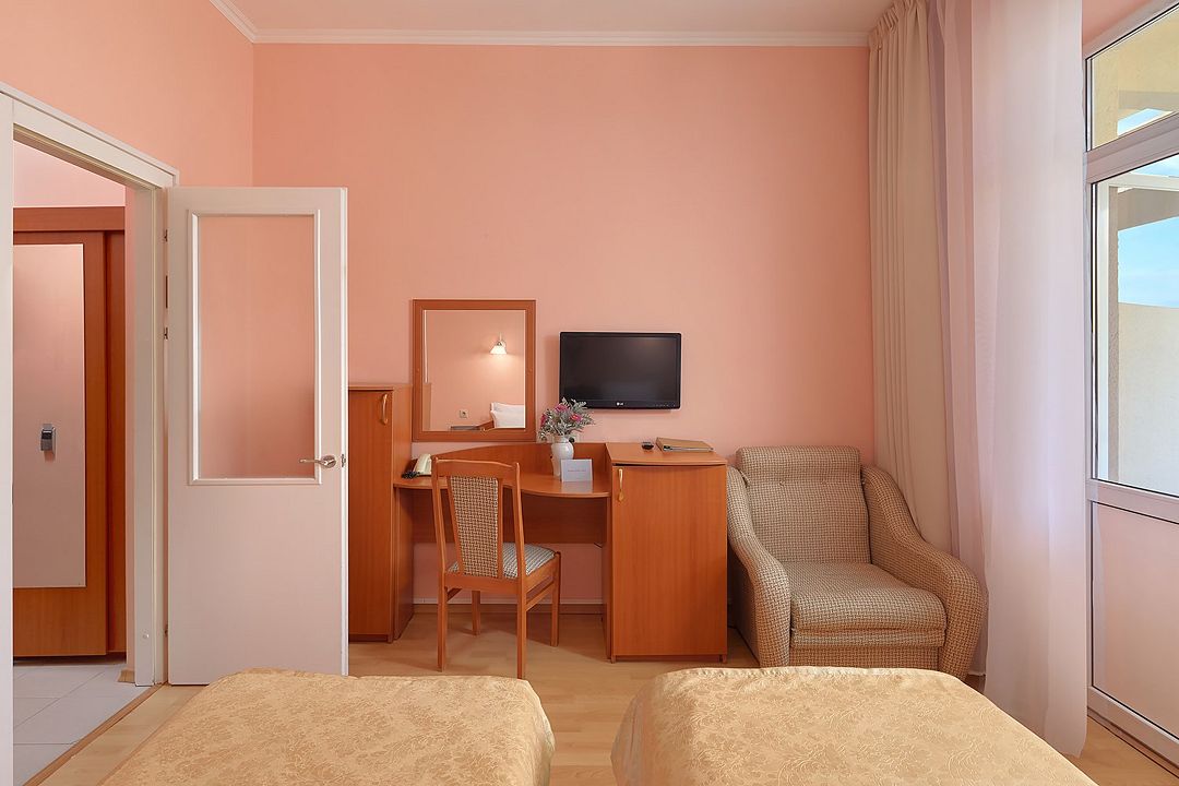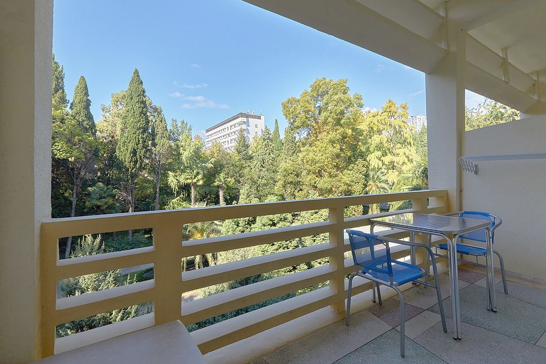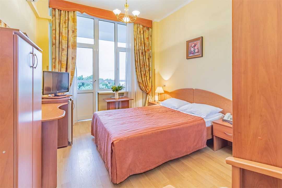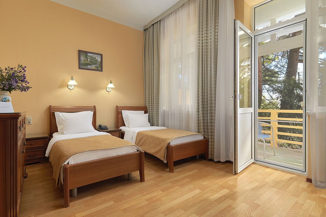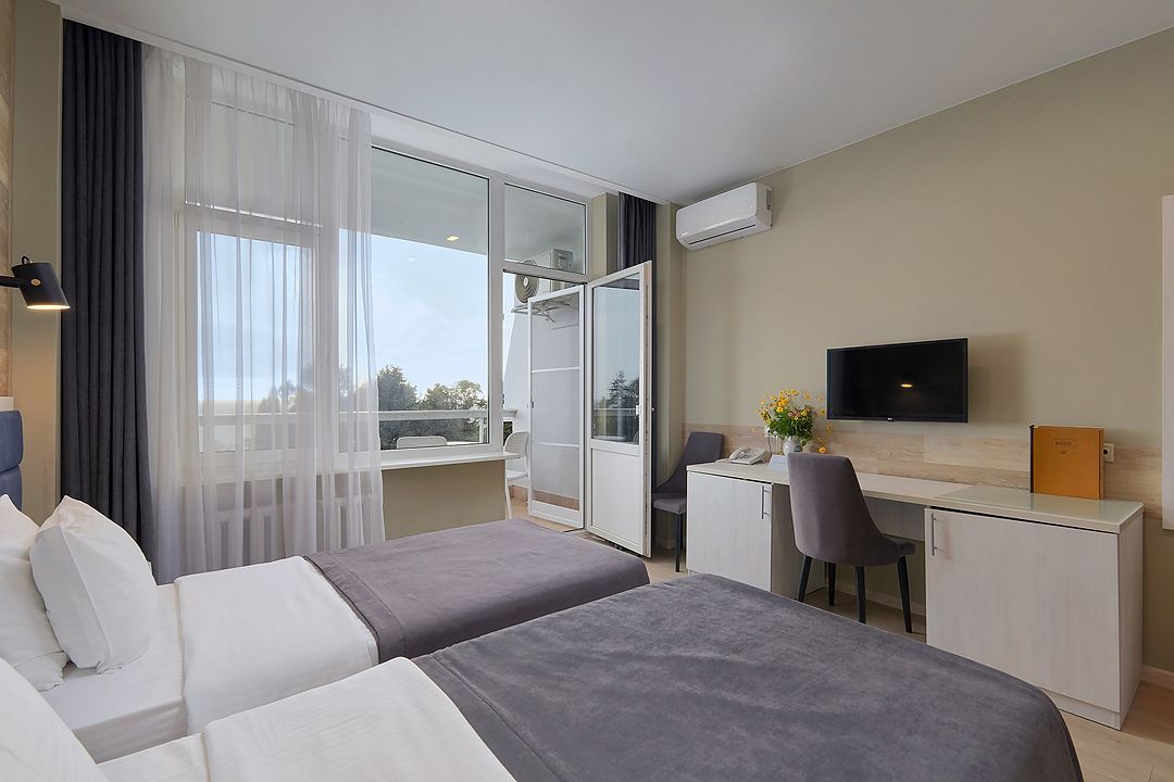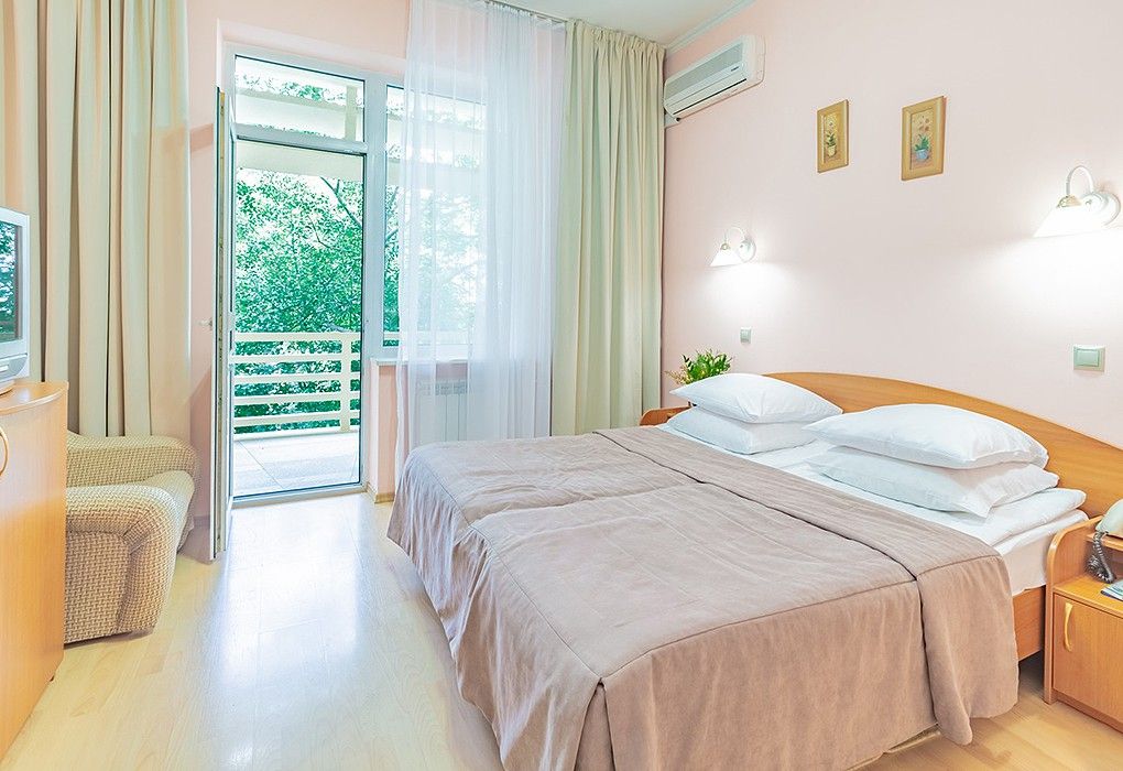 Однокомнатные номера стандарт в теплых светлых тонах площадью 14м2 со всеми удобствами и просторной лоджией с 2 по 4 этаж. С видом на парк. Две раздельные кровати. Максимальное размещение 2+1(доп.место-кресло-кровать). В ванной есть туалетные принадлежности: мыло, шампунь, которые меняются каждый день. 4 комплекта полотенец, в том числе для пляжа. Предусмотрен сейф, стол, шкаф, телевизор, кондиционер, холодильник. Дополнительно: чайник, минимальный набор посуды, фраже. Уборка проводится каждый день.Услуги и удобства