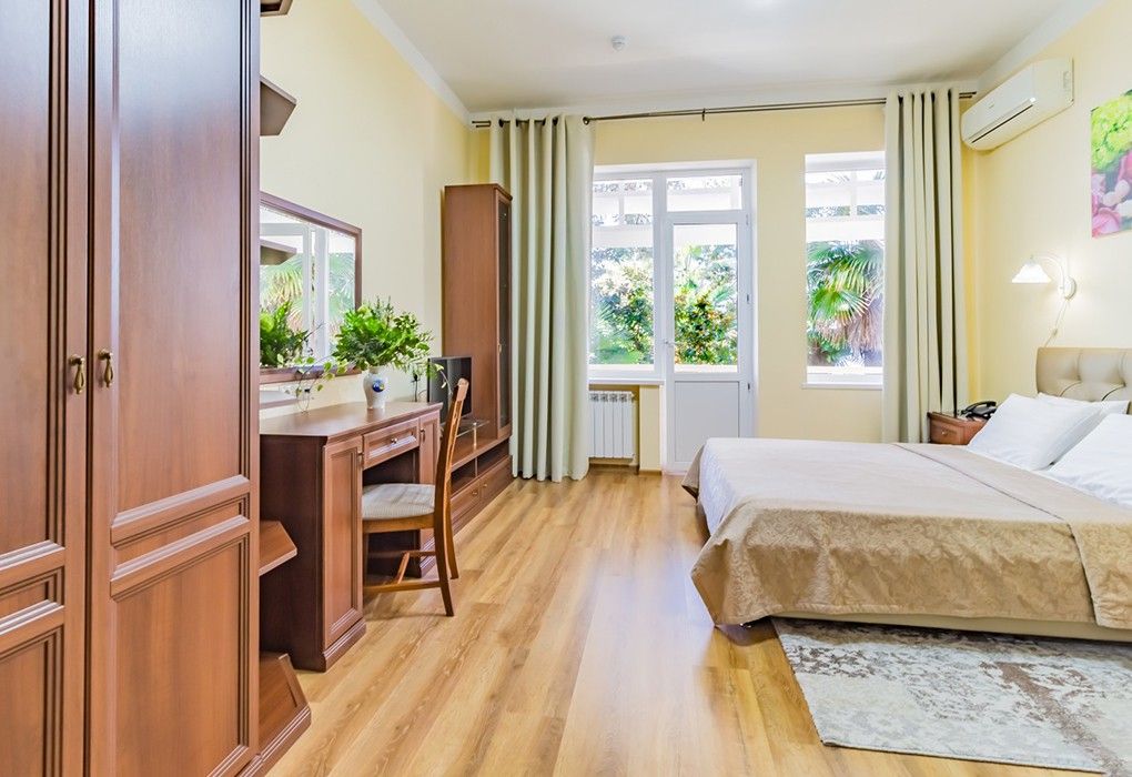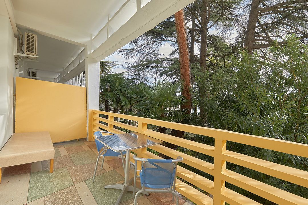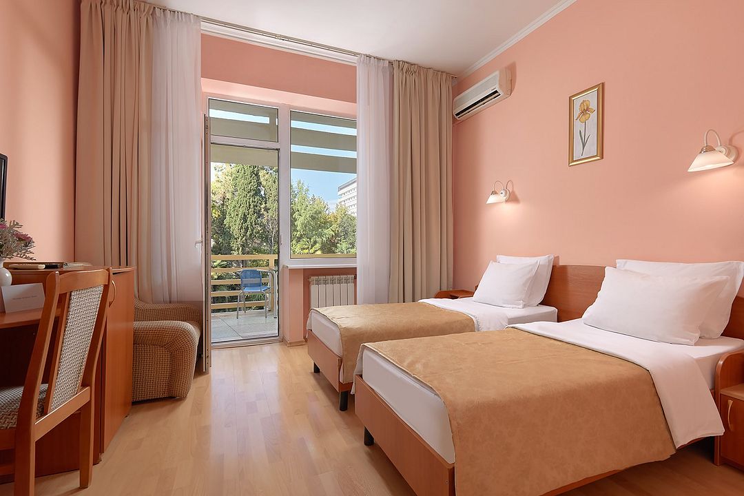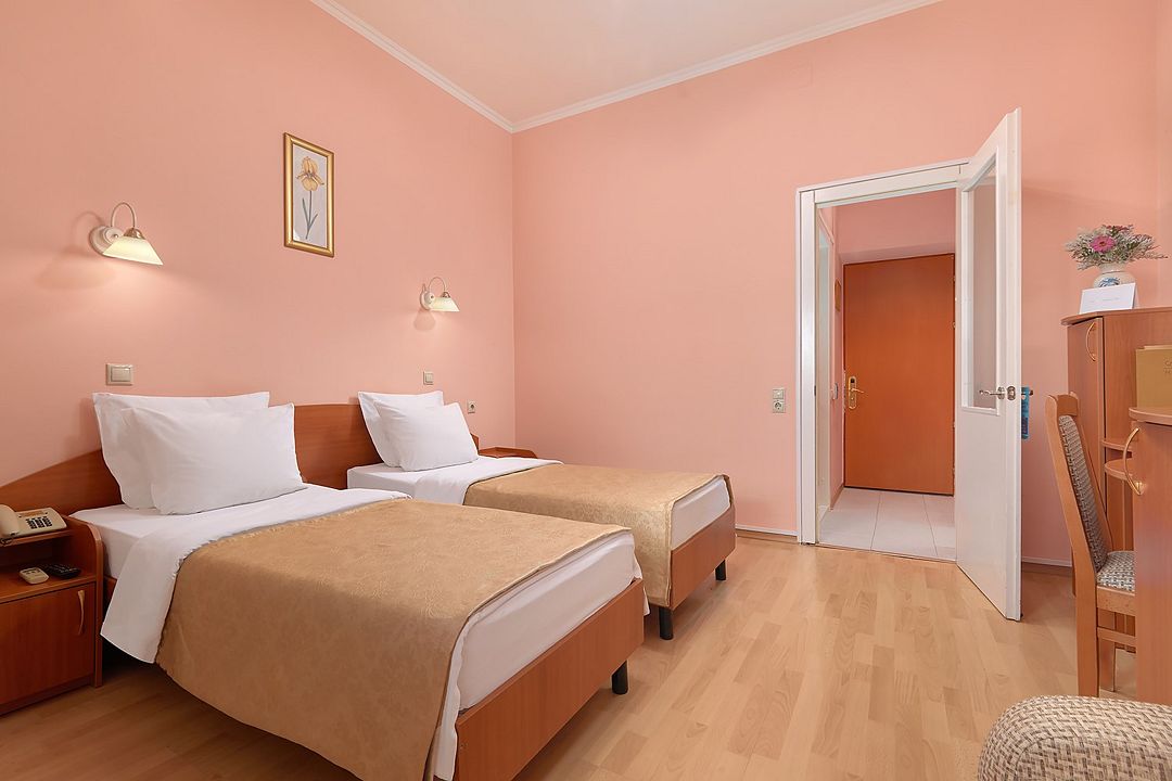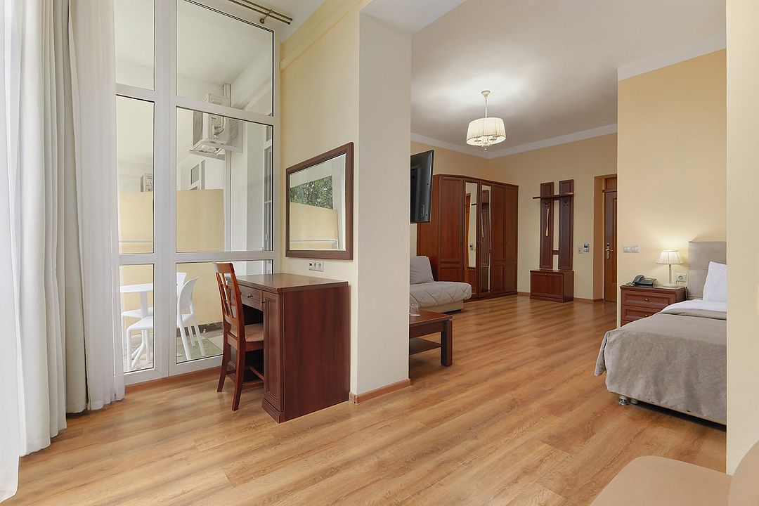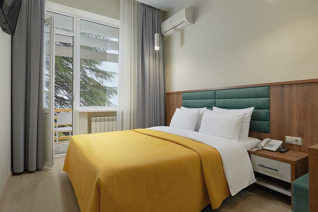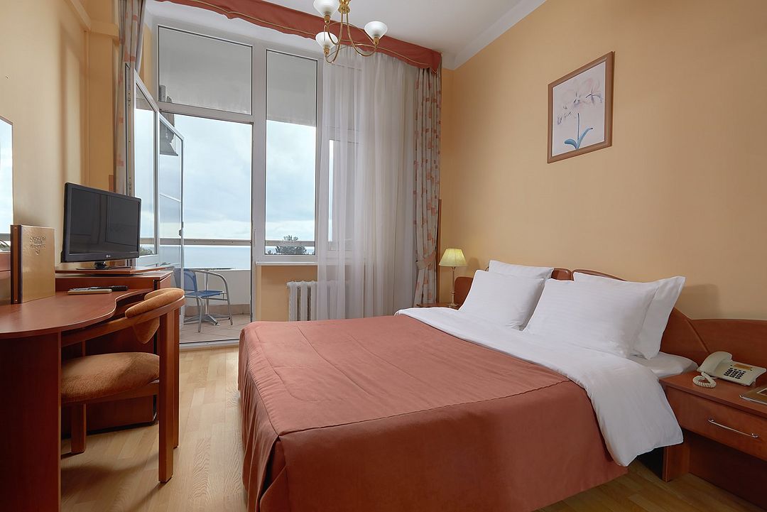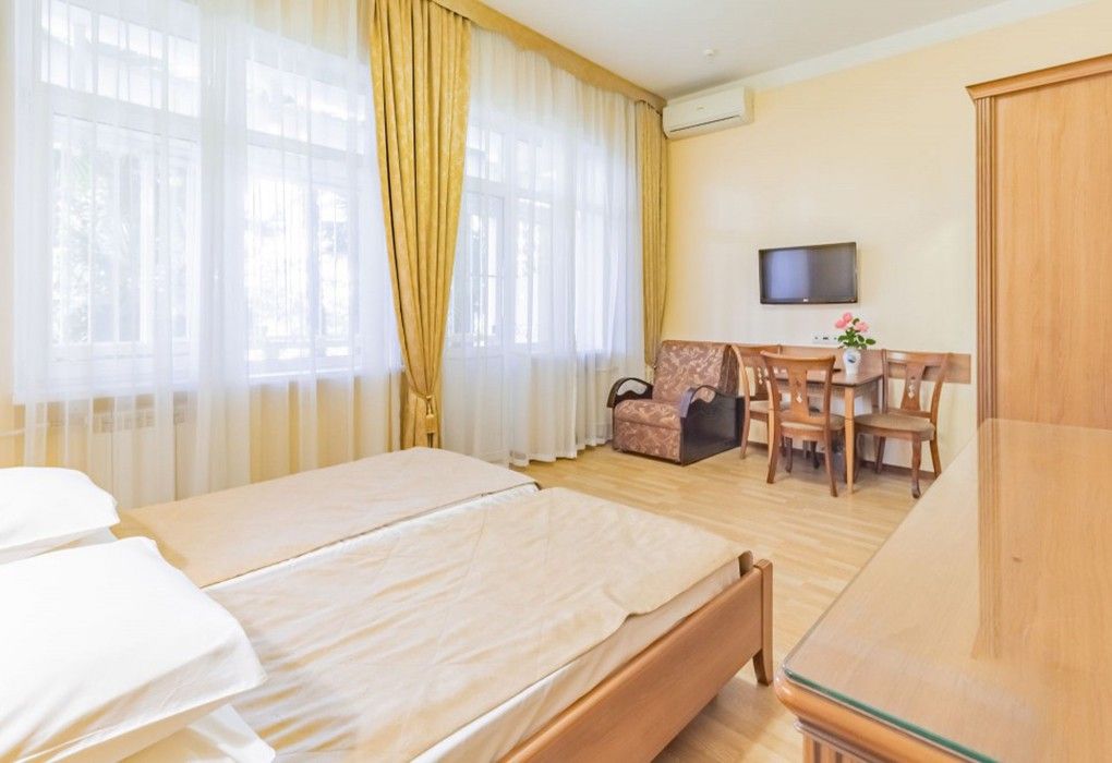 Однокомнатные номера стандарт в теплых светлых тонах площадью 14м2 со всеми удобствами и просторной лоджией с 2 по 4 этаж. С видом на парк. Две раздельные кровати. Максимальное размещение 2+1(доп.место-кресло-кровать). В ванной есть туалетные принадлежности: мыло, шампунь, которые меняются каждый день. 4 комплекта полотенец, в том числе для пляжа. Предусмотрен сейф, стол, шкаф, телевизор, кондиционер, холодильник. Дополнительно: чайник, минимальный набор посуды, фраже. Уборка проводится каждый день.Услуги и удобства
