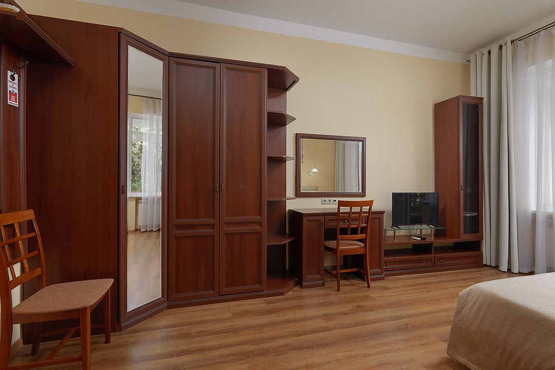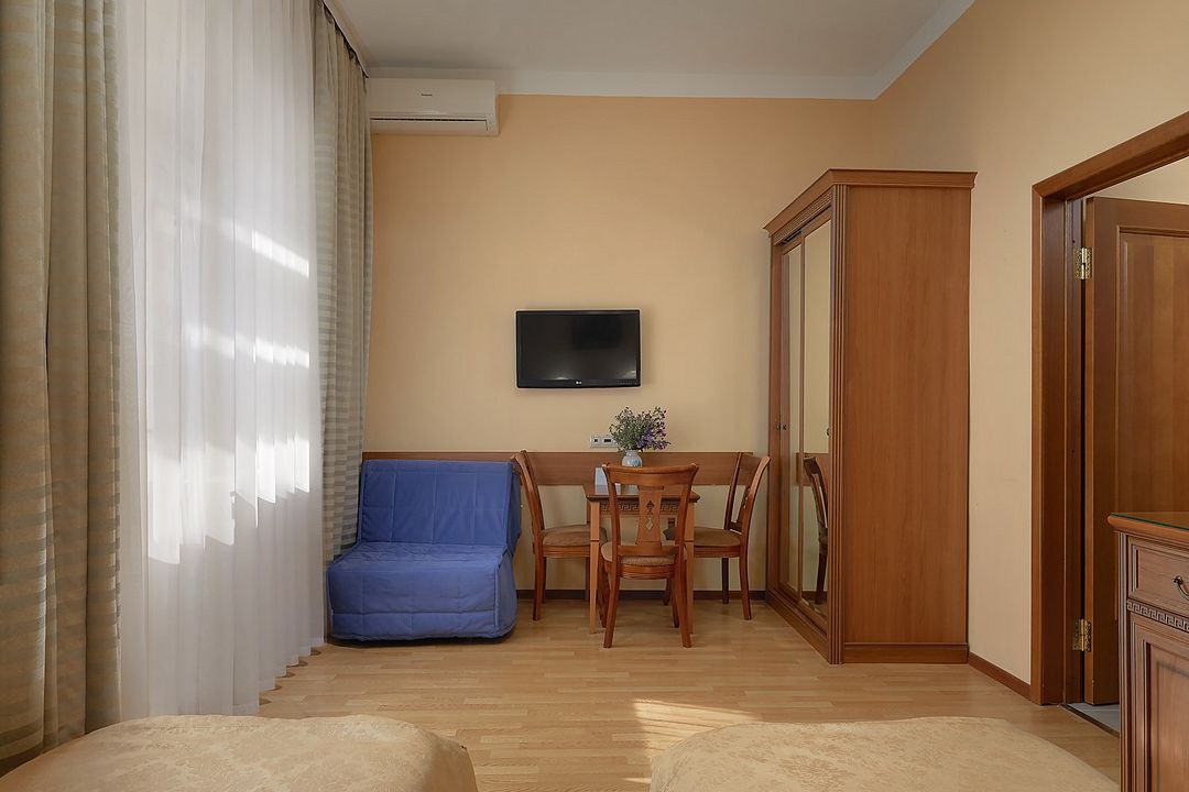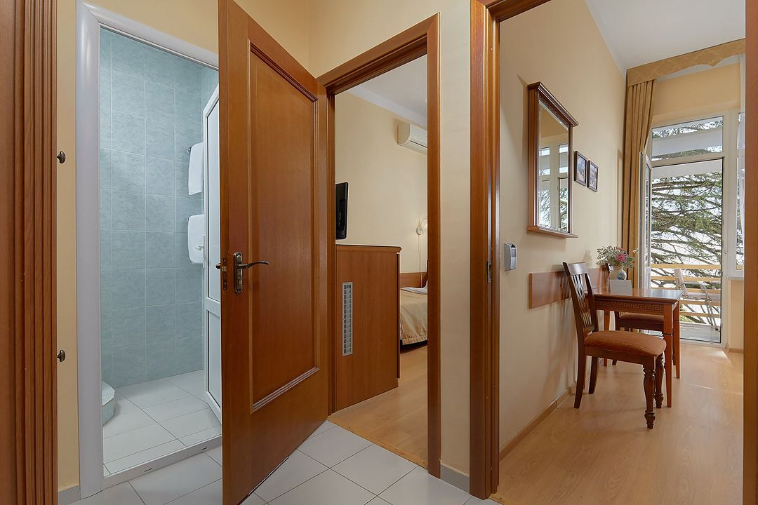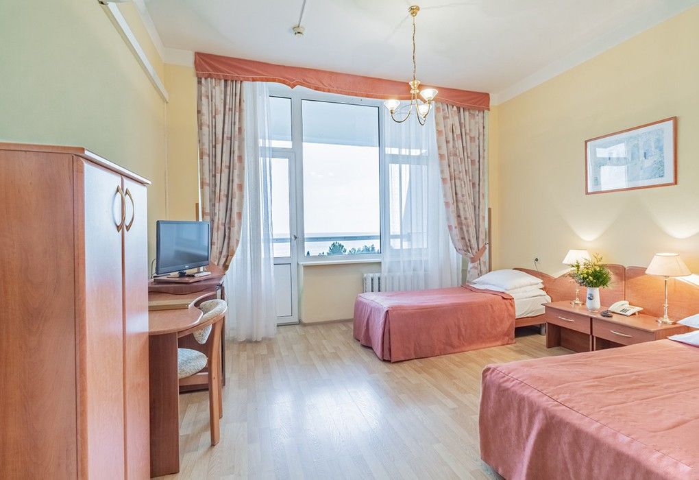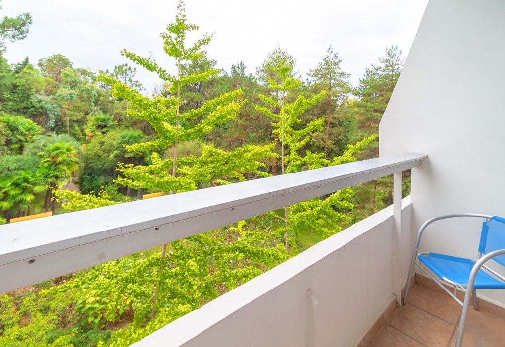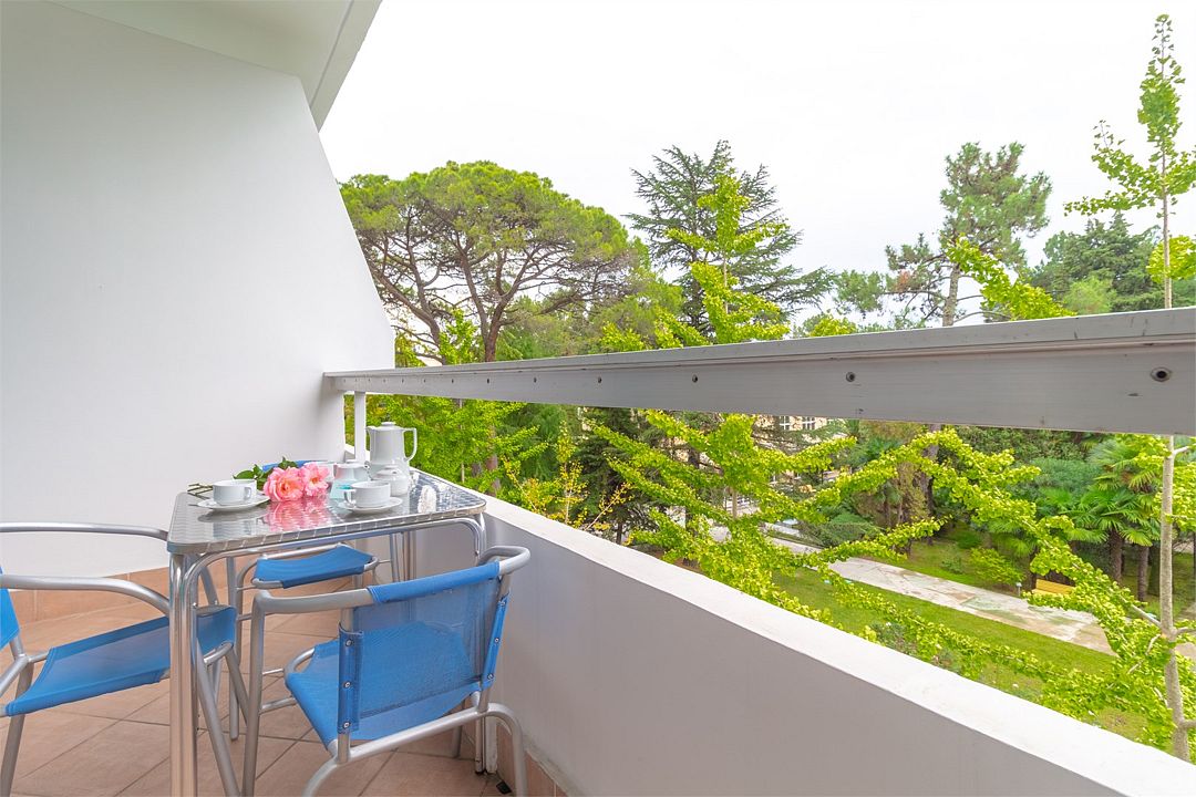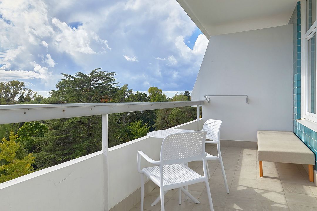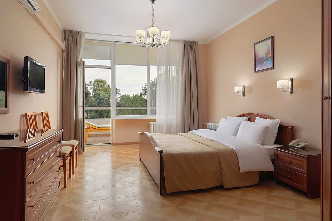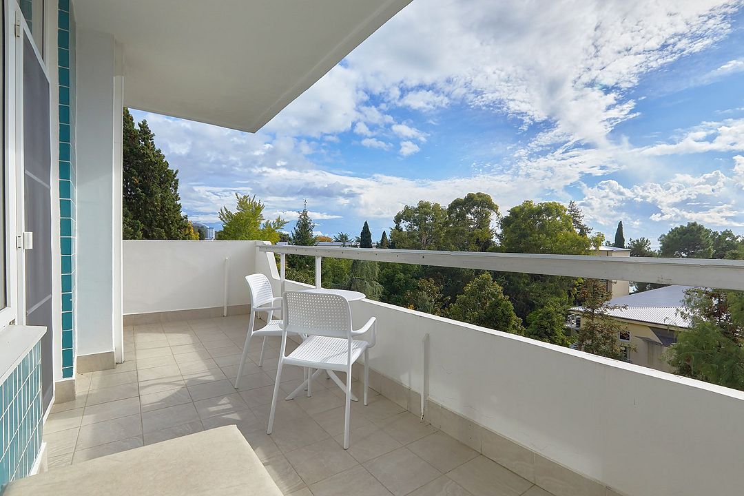 Однокомнатные номера стандарт в теплых светлых тонах площадью 14м2 со всеми удобствами и просторной лоджией с 2 по 4 этаж. С видом на парк. Две раздельные кровати. Максимальное размещение 2+1(доп.место-кресло-кровать). В ванной есть туалетные принадлежности: мыло, шампунь, которые меняются каждый день. 4 комплекта полотенец, в том числе для пляжа. Предусмотрен сейф, стол, шкаф, телевизор, кондиционер, холодильник. Дополнительно: чайник, минимальный набор посуды, фраже. Уборка проводится каждый день.Услуги и удобства