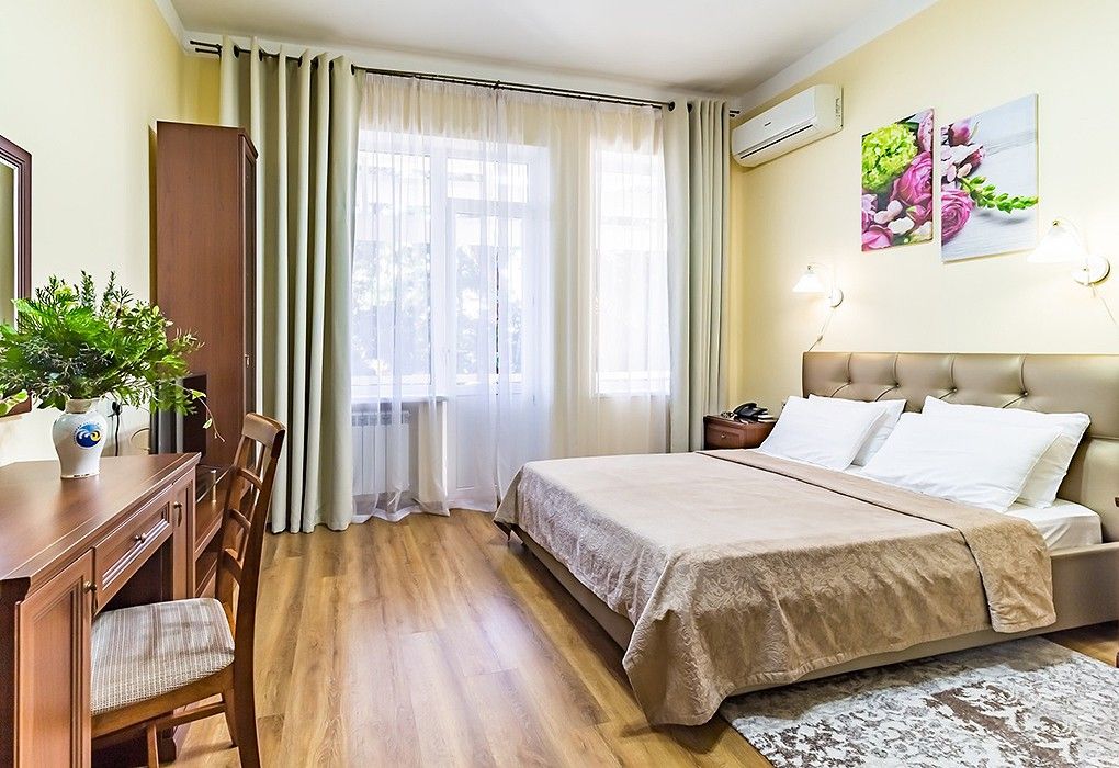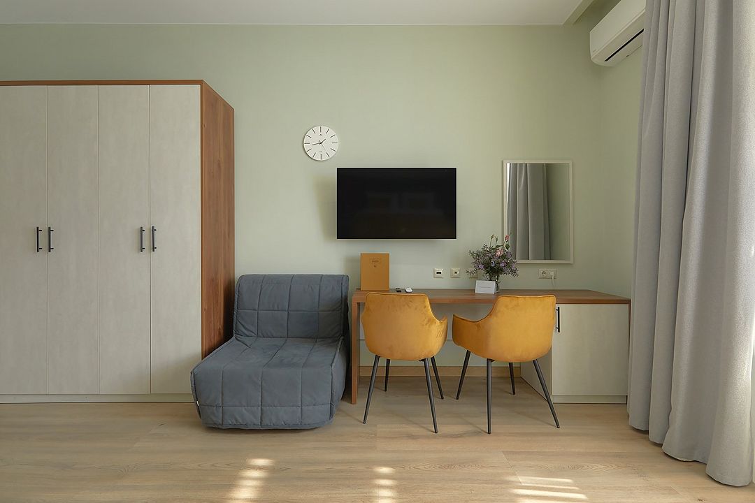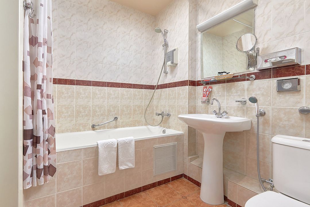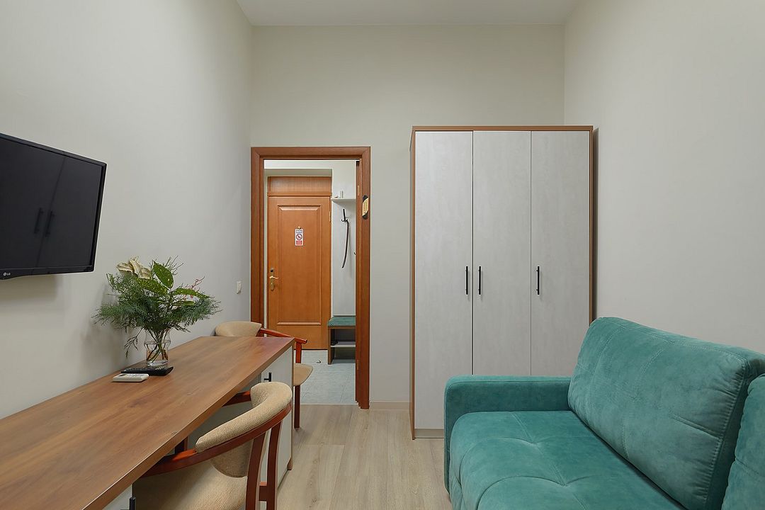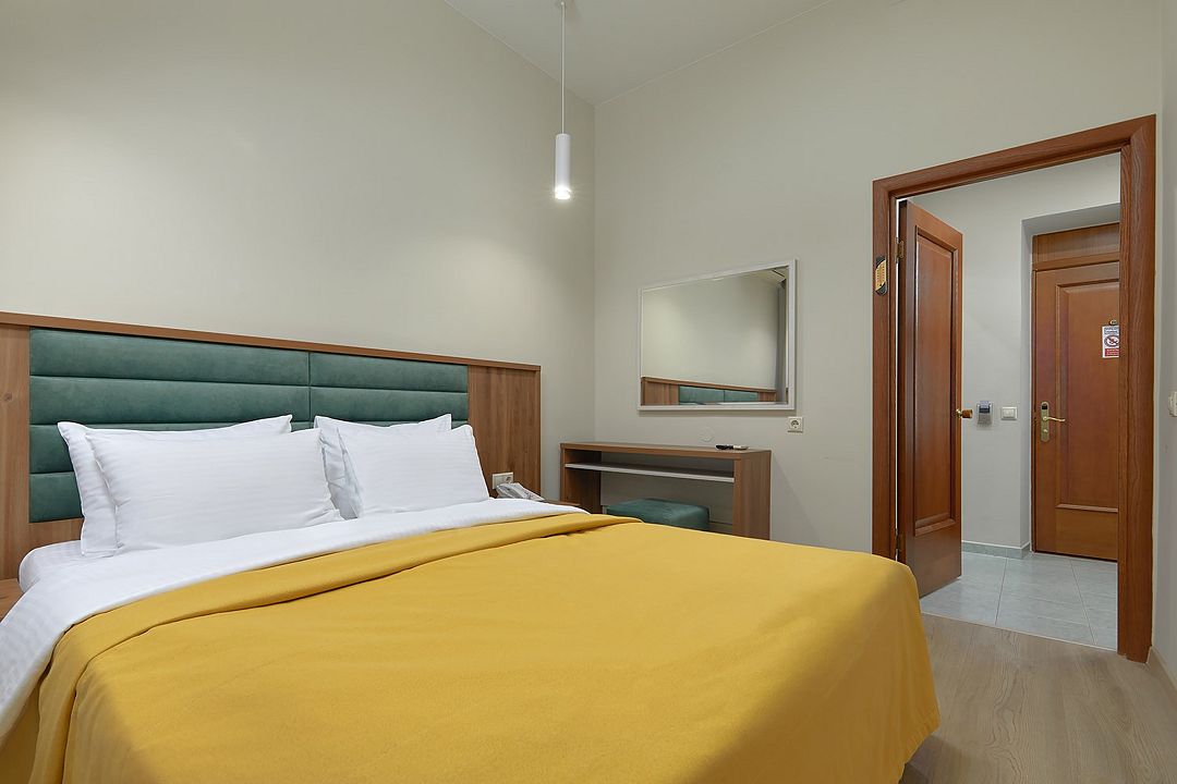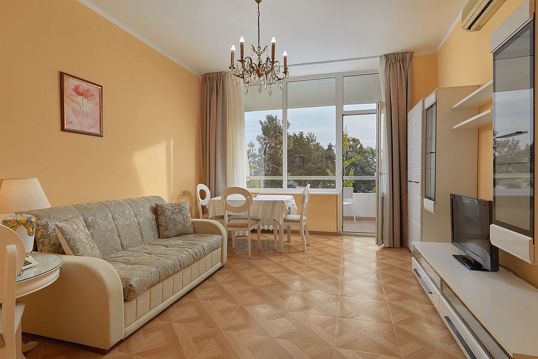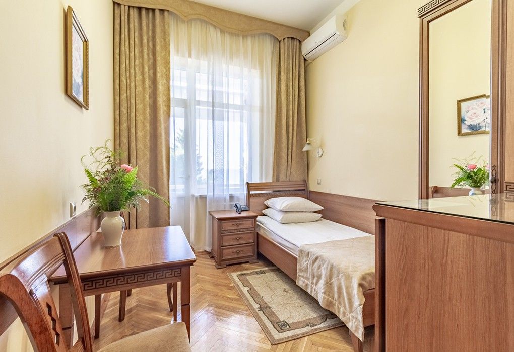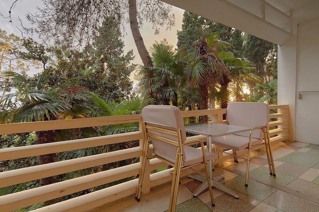 Однокомнатные номера стандарт в теплых светлых тонах площадью 14м2 со всеми удобствами и просторной лоджией с 2 по 4 этаж. С видом на парк. Две раздельные кровати. Максимальное размещение 2+1(доп.место-кресло-кровать). В ванной есть туалетные принадлежности: мыло, шампунь, которые меняются каждый день. 4 комплекта полотенец, в том числе для пляжа. Предусмотрен сейф, стол, шкаф, телевизор, кондиционер, холодильник. Дополнительно: чайник, минимальный набор посуды, фраже. Уборка проводится каждый день.Услуги и удобства