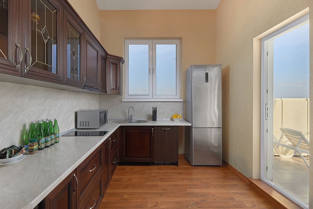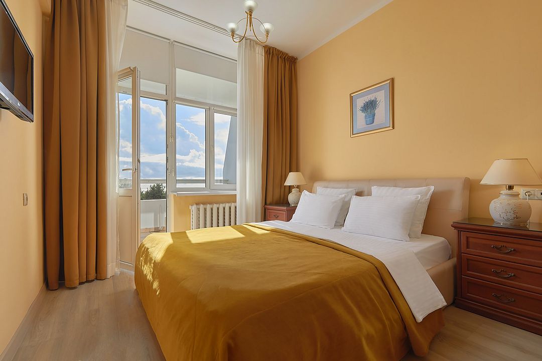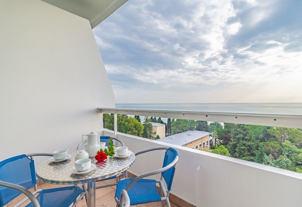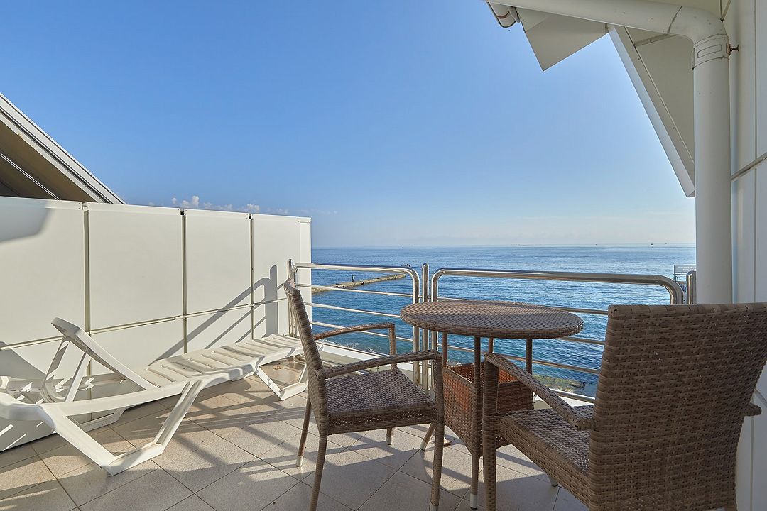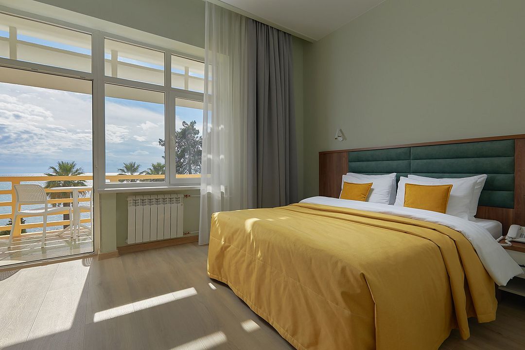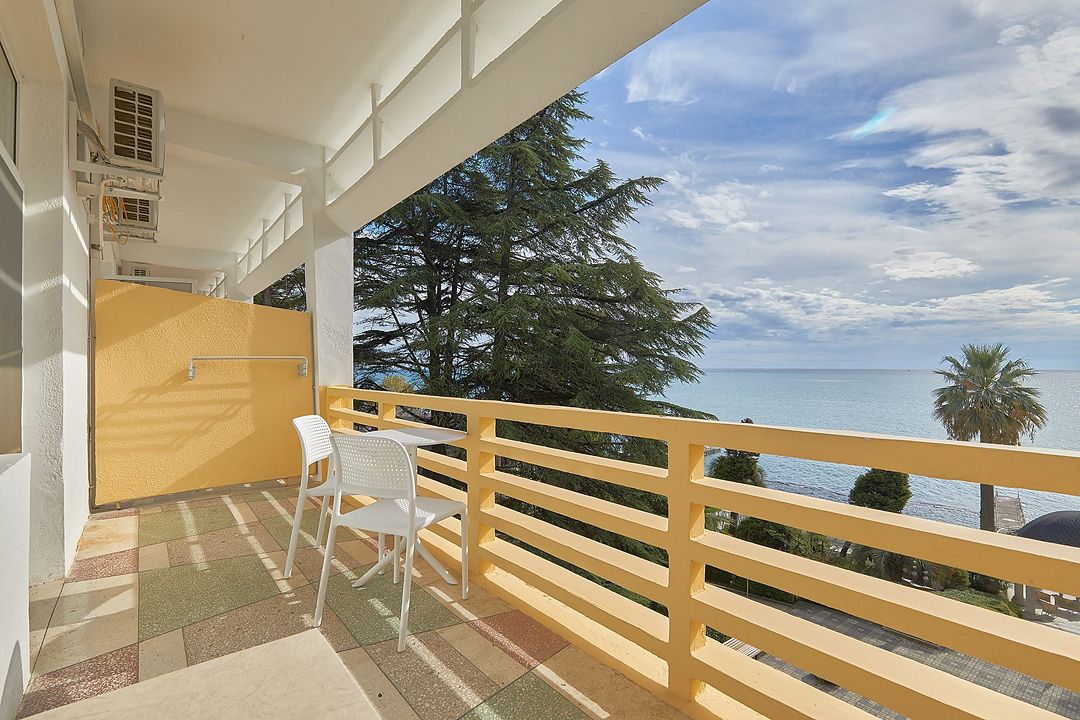 Комфортные уютные номера в теплых бежевых тонах со всеми удобствами и просторной лоджией с 2 по 4 этаж. Прямой вид на море. Максимальное размещение 2+1(доп.место-кресло-кровать). В ванной есть туалетные принадлежности: мыло, шампунь, которые меняются каждый день. 4 комплекта полотенец, в том числе для пляжа. Предусмотрен сейф, стол, шкаф, телевизор, кондиционер, холодильник. Дополнительно: чайник, минимальный набор посуды, фраже. Уборка проводится каждый день.Услуги и удобства