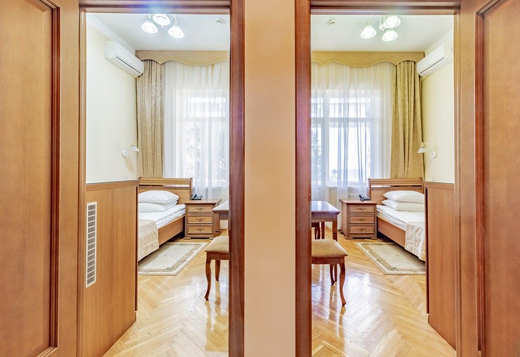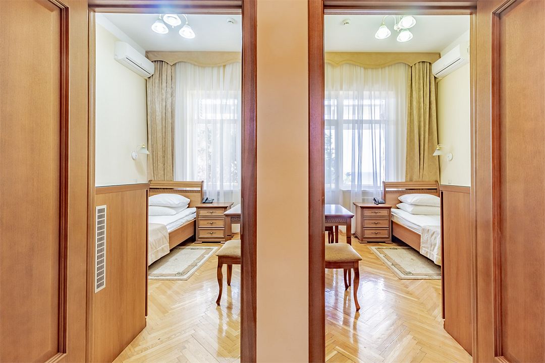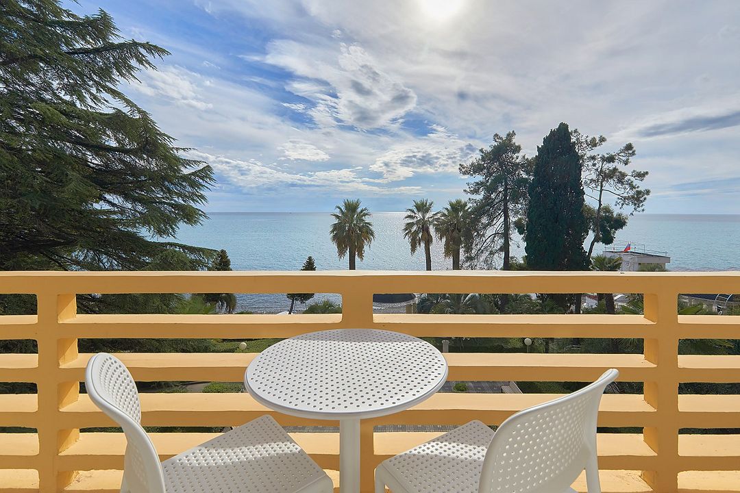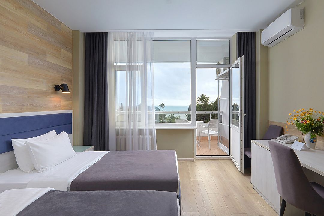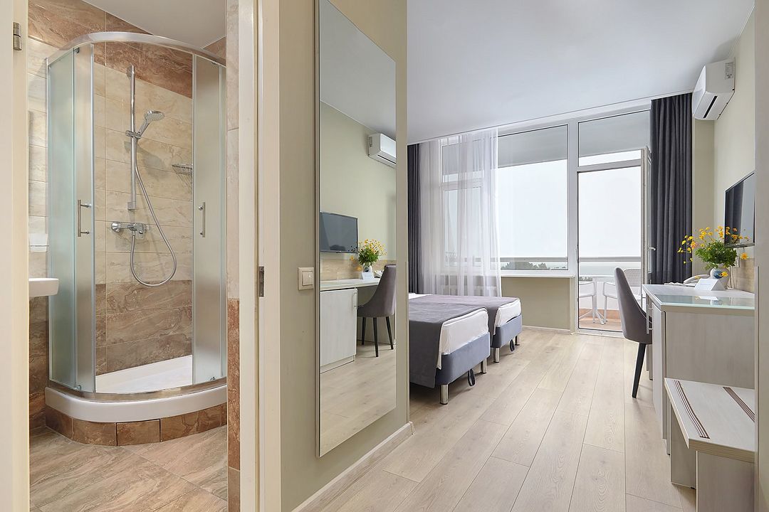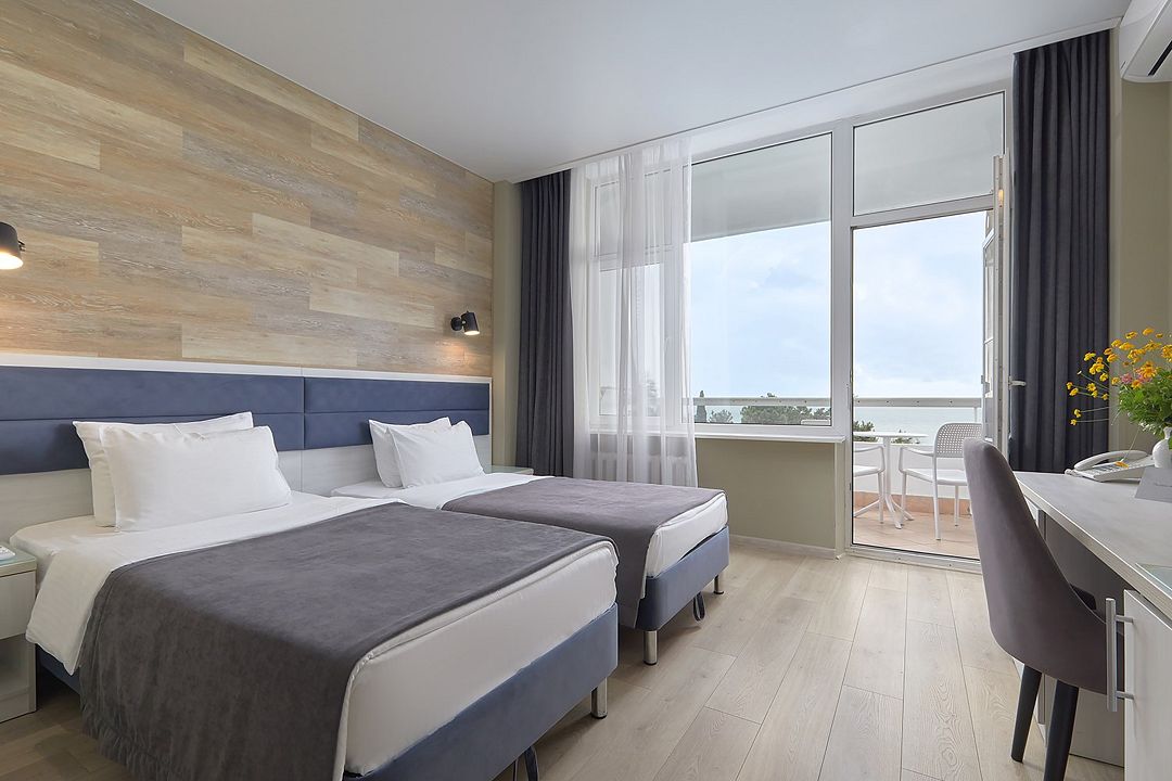 Стандартный двухкомнатный двухместный номер с видом на море с 3 по 4 этаж. Размещение по одному человеку в комнате. Санузел и ванная комната-раздельно. В ванной есть туалетные принадлежности: мыло, шампунь, которые меняются каждый день. 4 комплекта полотенец, в том числе для пляжа. В каждой комнате предусмотрен сейф, стол, шкаф, телевизор, кондиционер. Дополнительно: чайник, минимальный набор посуды, фраже. Уборка проводится каждый день.Услуги и удобства