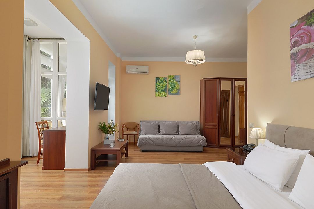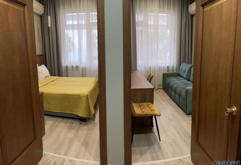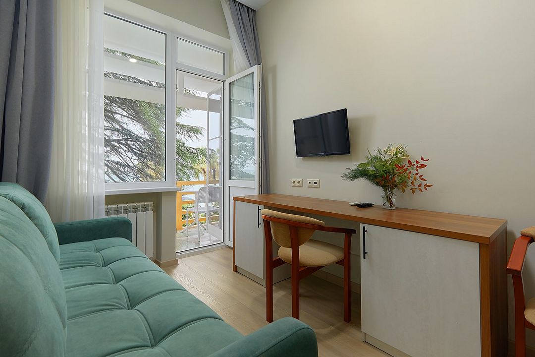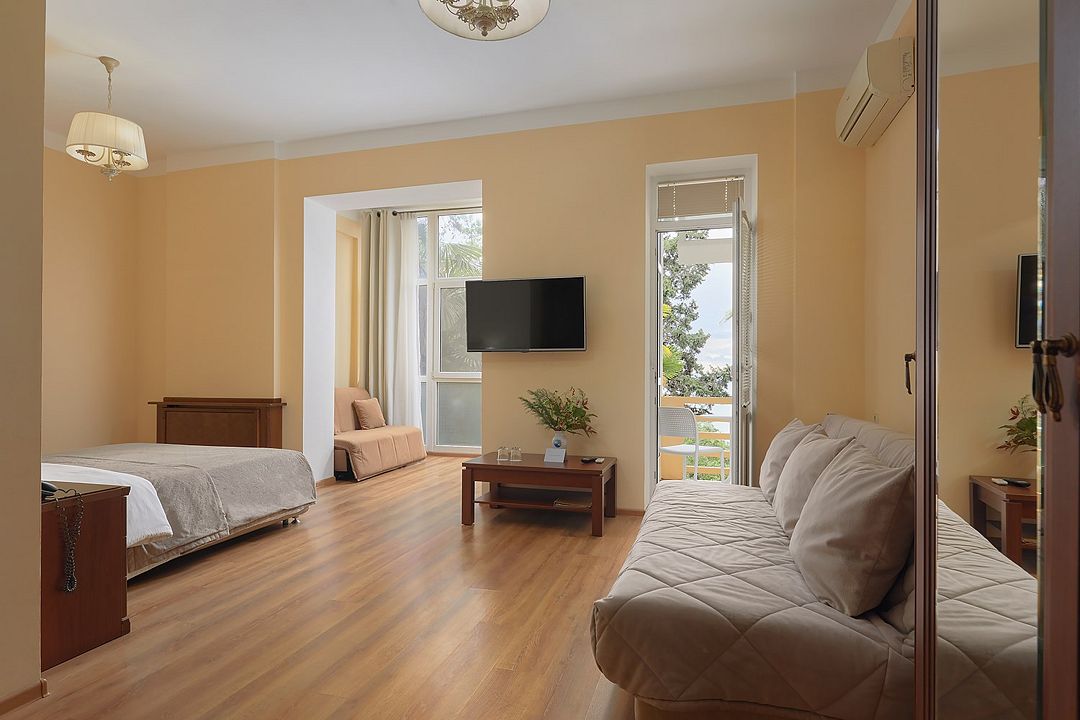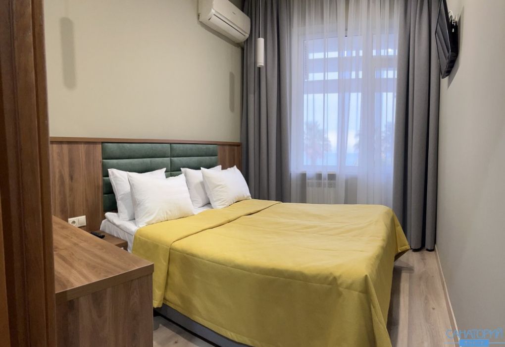 Стандартный двухкомнатный двухместный номер с видом на море на 2 этаже. В номере двухспальная кровать и диван. Максимальное размещение 2+1. Санузел и ванная комната-раздельно. В ванной есть туалетные принадлежности: мыло, шампунь, которые меняются каждый день. 4 комплекта полотенец, в том числе для пляжа. Предусмотрен сейф, стол, шкаф, телевизор, кондиционер. Дополнительно: чайник, минимальный набор посуды, фраже. Уборка проводится каждый день.Услуги и удобства