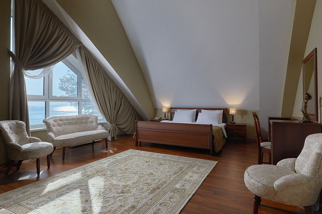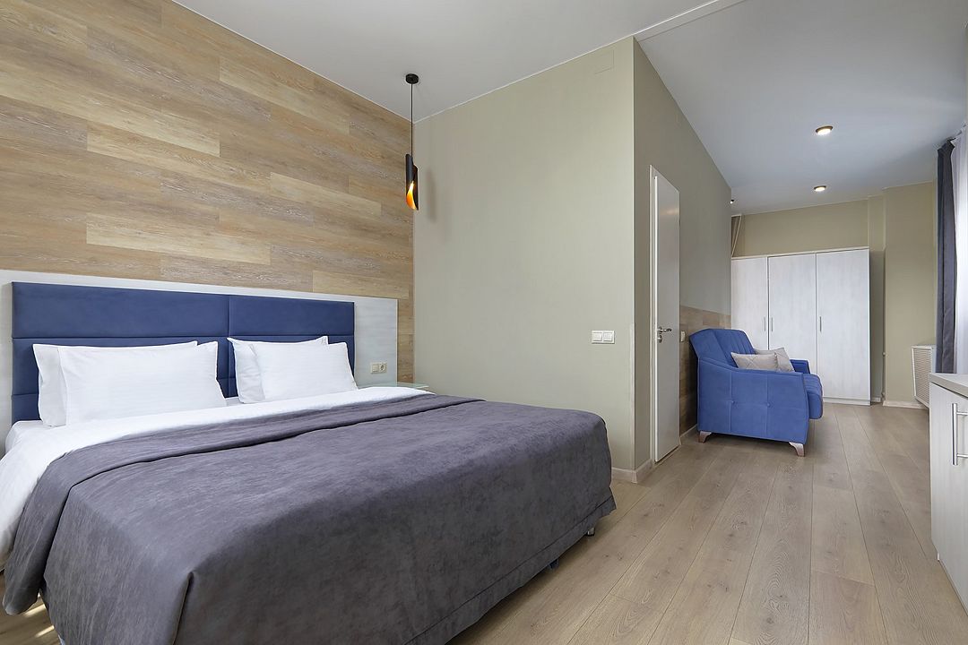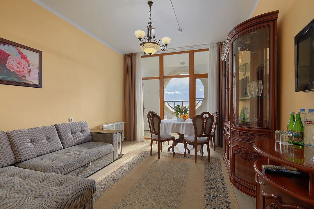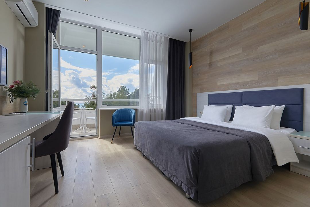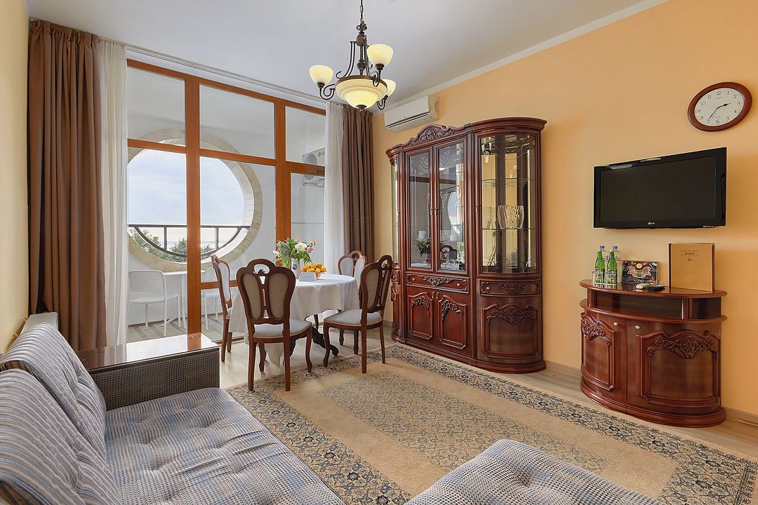 Стандартный двухкомнатный двухместный номер с видом на море на 2 этаже. В номере двухспальная кровать и диван. Максимальное размещение 2+1. Санузел и ванная комната-раздельно. В ванной есть туалетные принадлежности: мыло, шампунь, которые меняются каждый день. 4 комплекта полотенец, в том числе для пляжа. Предусмотрен сейф, стол, шкаф, телевизор, кондиционер. Дополнительно: чайник, минимальный набор посуды, фраже. Уборка проводится каждый день.Услуги и удобства