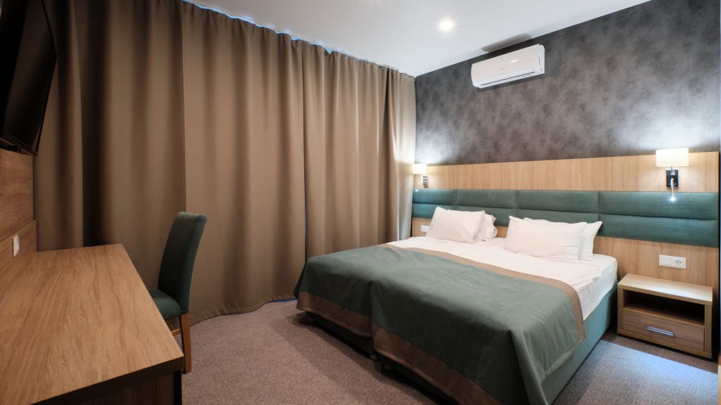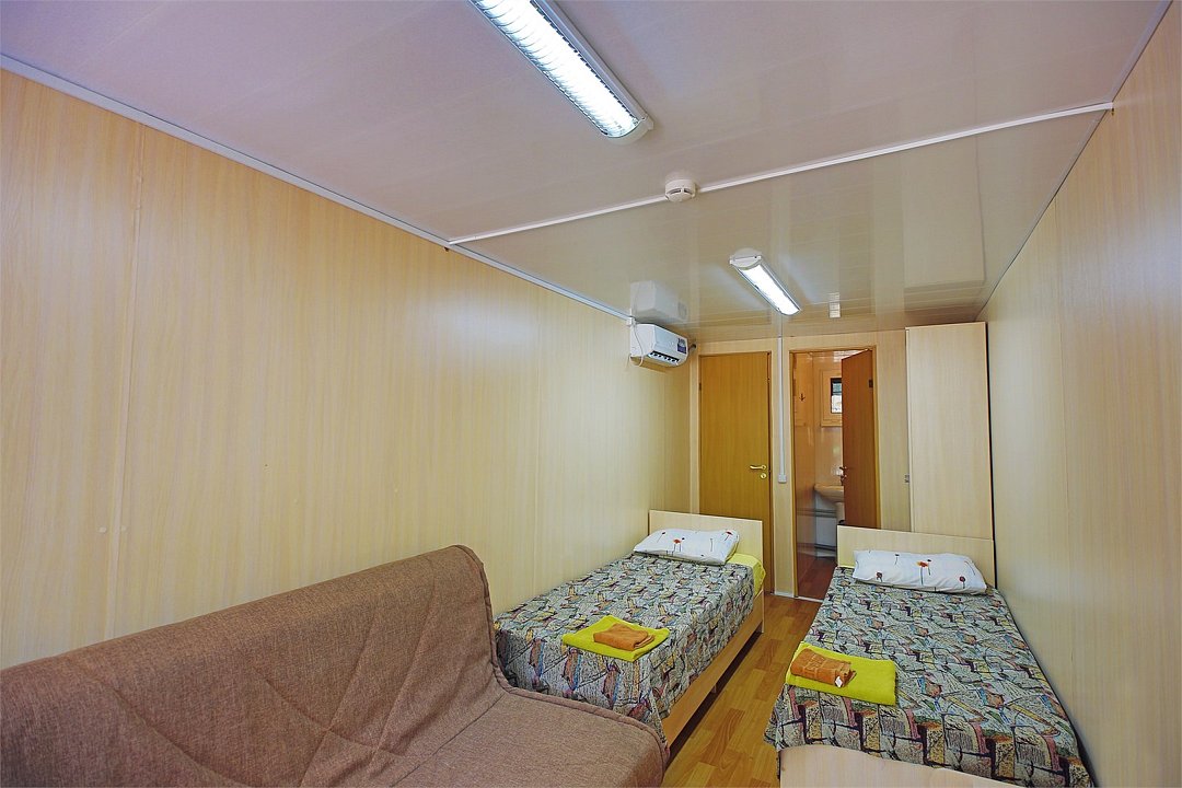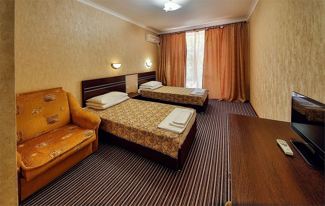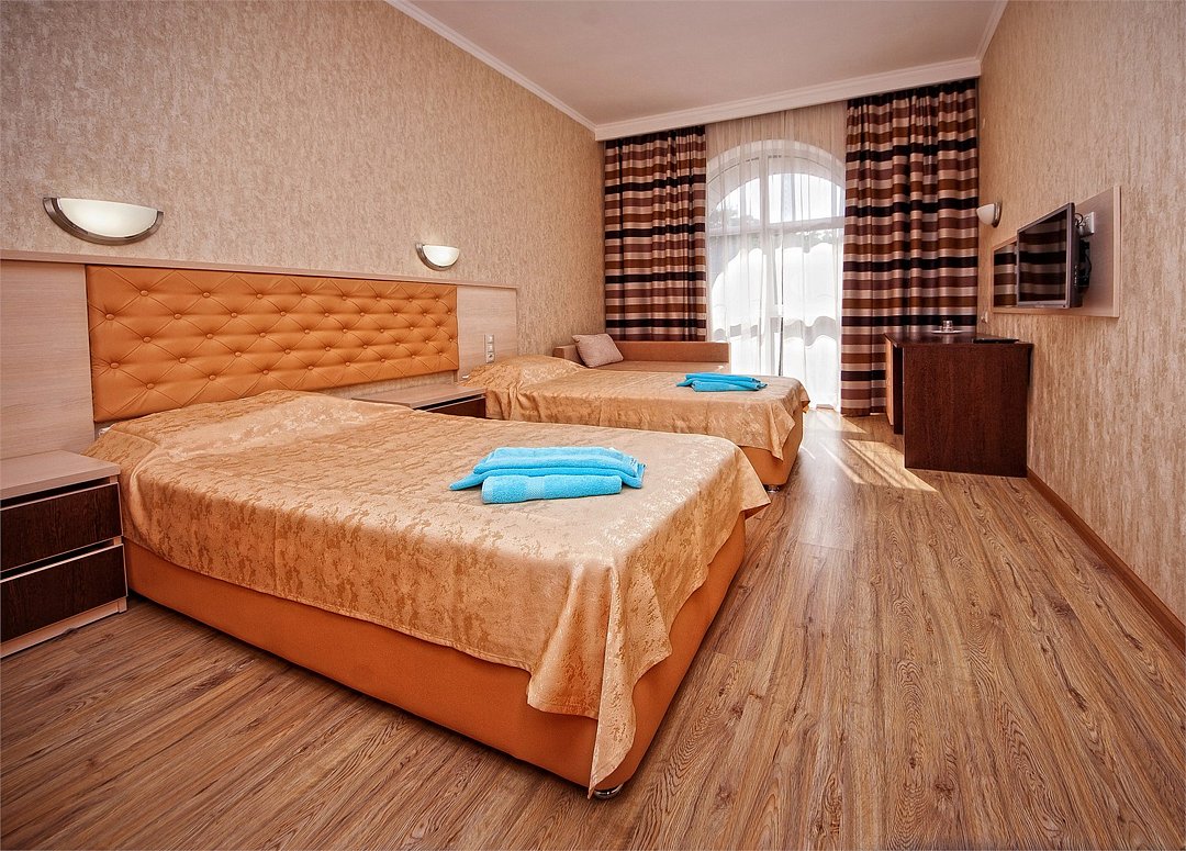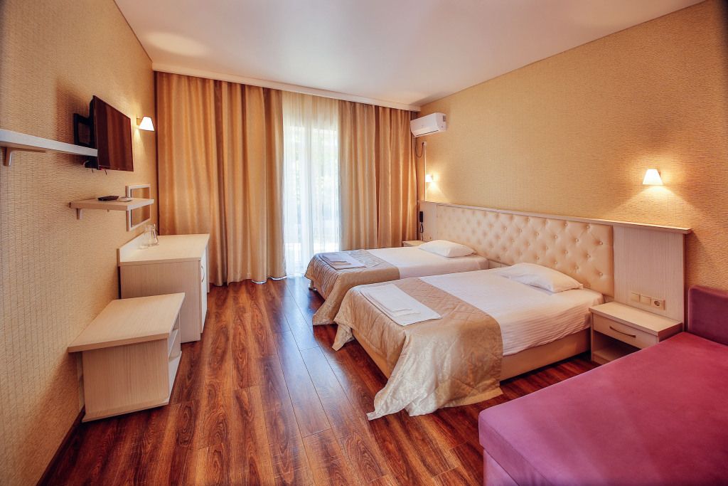 Дизайн отделки номеров может отличаться от указанного на фото. Эти номера состоят из двух односпальных кроватей (соединяются в двуспальную кровать топпером) в спальне и кресла-кровати, где могут разместиться максимум 3 человека. Функционально оснащенный шкаф обеспечивает достаточно места для вашего багажа. В ванной комнате установлен душ, в комнате мини-холодильник, телевизор, сплит-система. Мы предоставляем утюг и гладильную доску на этаже. Полотенца меняют каждые 3-4 дня, а постельное белье - еженедельно. Уборка осуществляется ежедневно (с 08:00 до 15:00). Номера расположены в корпусах 17, 20, 21 и 22. Номера без балкона в корпусах 20, 21 и 22.Услуги и удобства