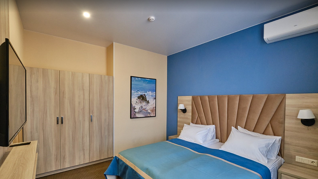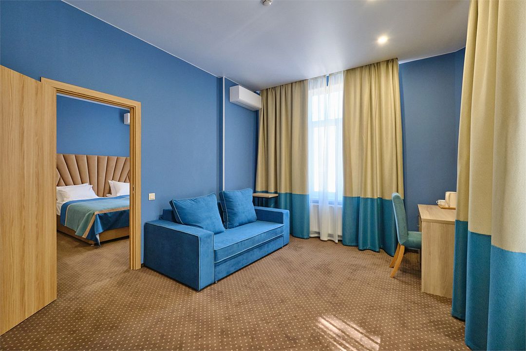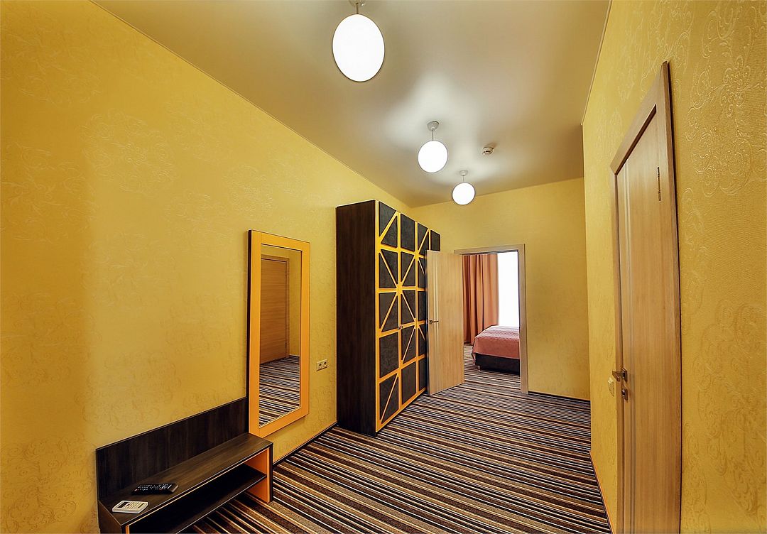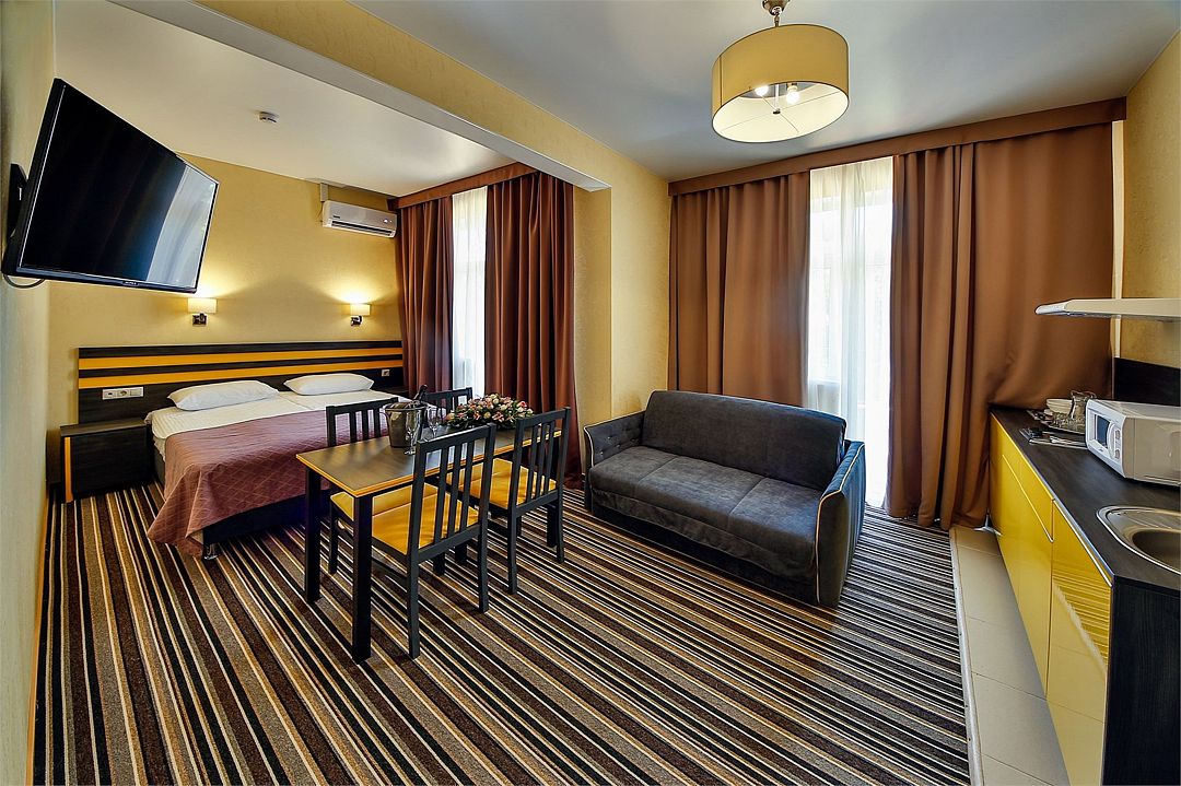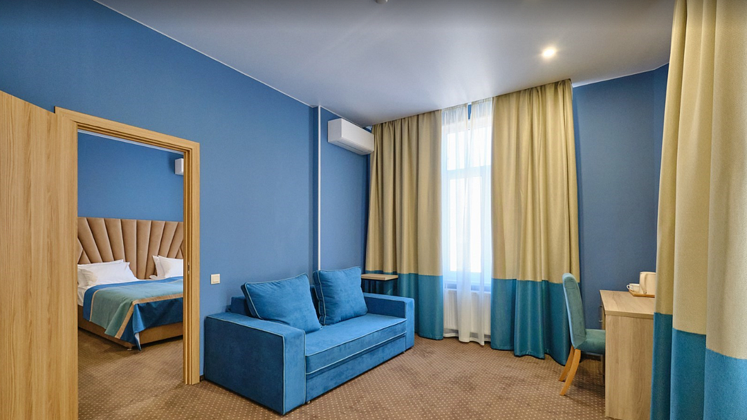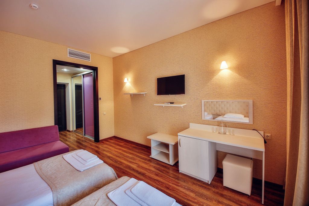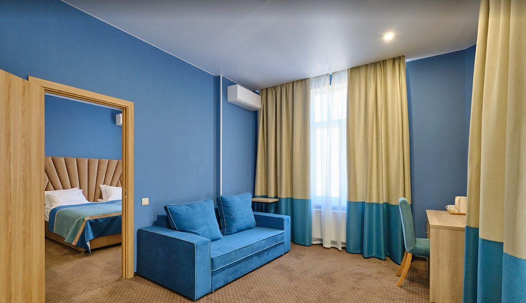 Дизайн отделки номеров может отличаться от указанного на фото. Делюксы с одной спальней и гостиной, в которых могут разместиться до 4 человек. Спальня состоит из двух односпальных кроватей (соединяются в двуспальную кровать топпером), диваном-кроватью, зоны «Рабочее место» с рабочей поверхностью и удобными креслами идеально подходящими для мобильной работы. В гостиной зоне с достаточным количеством сидячих мест в течение дня, которые раскладываются в спальное место, есть телевизор. В коридоре просторный встроенный шкаф. В комнате мини-холодильник, сплит-система, в ванной комнате установлен душ, также мы предоставляем утюг и гладильную доску на этаже. Полотенца меняют каждые 3-4 дня, а постельное белье - еженедельно. Уборка осуществляется ежедневно (с 08:00 до 15:00). Номера расположены в 6 корпусе. Все номера с балконами.Услуги и удобства