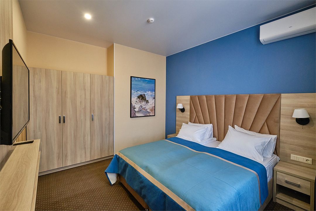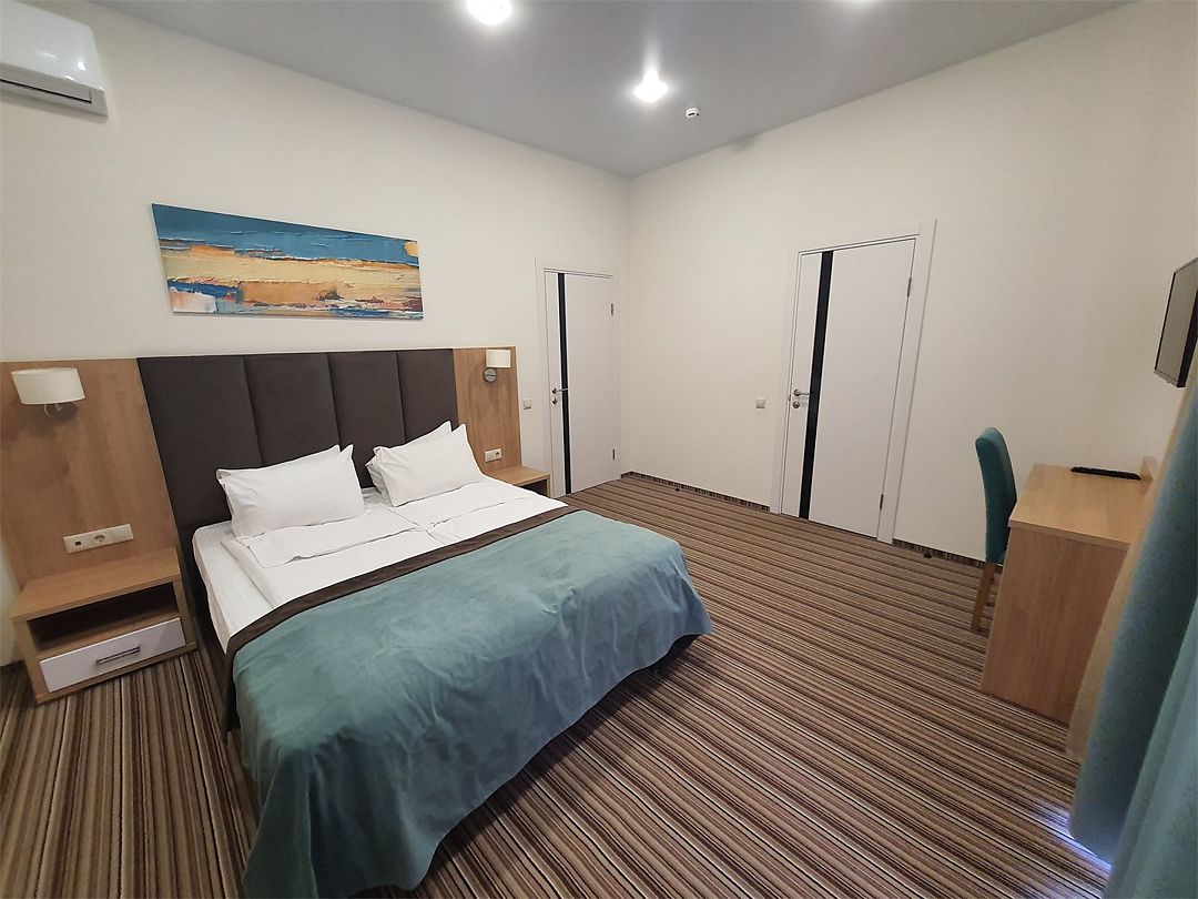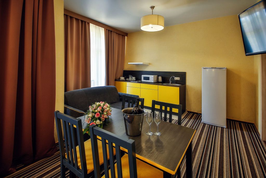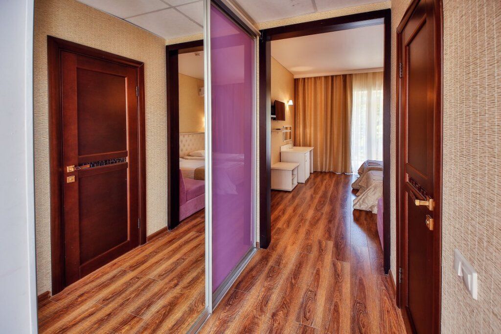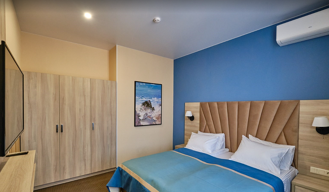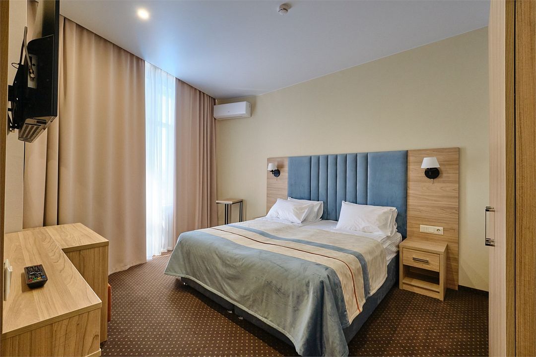 Дизайн отделки номеров может отличаться от указанного на фото. Делюксы с одной спальней и гостиной, в которых могут разместиться до 4 человек. Спальня состоит из двух односпальных кроватей (соединяются в двуспальную кровать топпером), диваном-кроватью, зоны «Рабочее место» с рабочей поверхностью и удобными креслами идеально подходящими для мобильной работы. В гостиной зоне с достаточным количеством сидячих мест в течение дня, которые раскладываются в спальное место, есть телевизор. В коридоре просторный встроенный шкаф. В комнате мини-холодильник, сплит-система, в ванной комнате установлен душ, также мы предоставляем утюг и гладильную доску на этаже. Полотенца меняют каждые 3-4 дня, а постельное белье - еженедельно. Уборка осуществляется ежедневно (с 08:00 до 15:00). Номера расположены в 6 корпусе. Все номера с балконами.Услуги и удобства