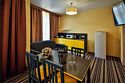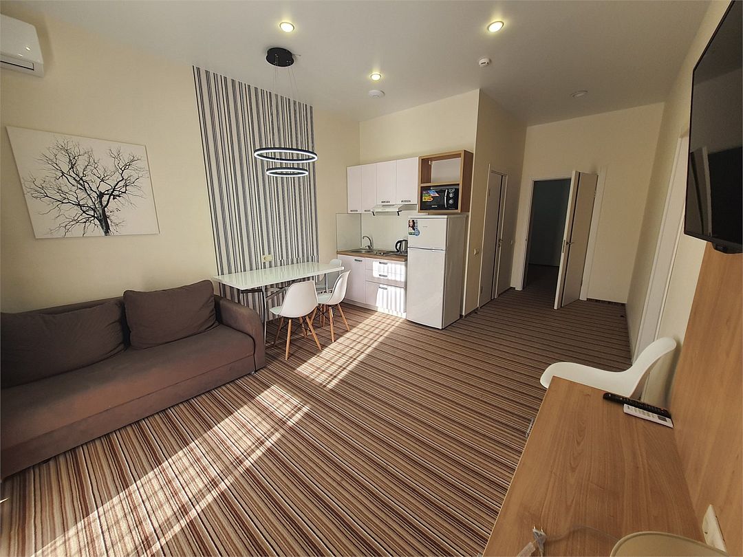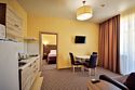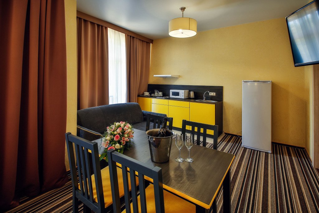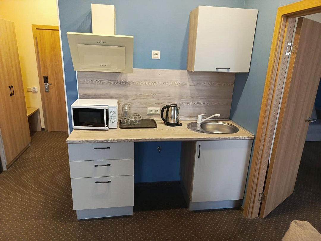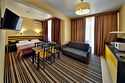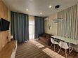 Дизайн отделки номеров может отличаться от указанного на фото. Спальня состоит из двух односпальных кроватей (соединяются в двуспальную кровать топпером), телевизора и зоны “Рабочей место” с рабочей поверхностью и удобным стулом. Гостиная зона с диваном-кроватью и телевизором, обеденной и кухонной зоной, оснащенной большим холодильником, электрической плитой с вытяжкой, раковиной, электрическим чайником и набором посуды. В ванной комнате установлен душ. В коридоре просторный встроенный шкаф. Во всех номерах этой категории есть WIFI и фен, сплит-система. Мы предоставляем утюг и гладилную доску на этаже. Полотенца меняют каждые 3-4 дня, а постельное белье - еженедельно. Уборка осуществляется ежедневно (с 08:00 до 15:00). Номера расположены в корпусе 6 на четвертом этаже. Все номера с балконами. Напротив зданий спортивные бассейны.Услуги и удобства