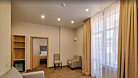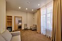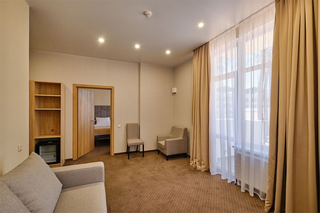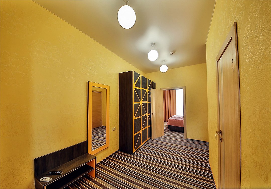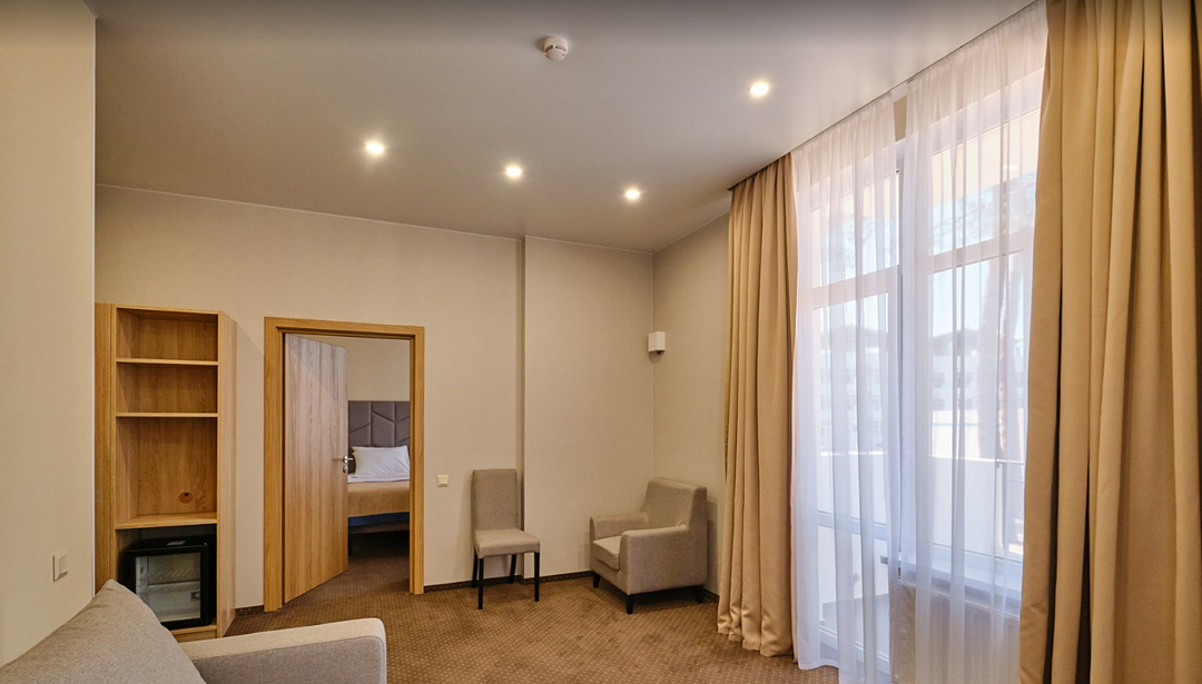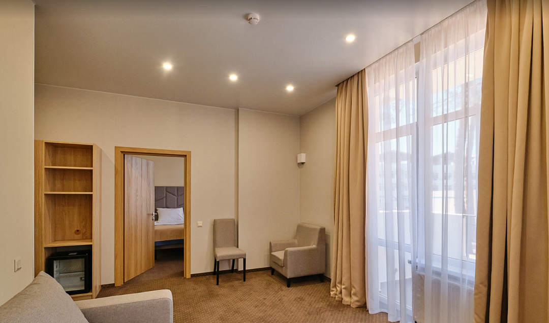 Дизайн отделки номеров может отличаться от указанного на фото. Люксы с одной спальней и гостиной, в которых могут разместиться до 4 человек. Спальня состоит из двух односпальных кроватей (соединяются в двуспальную кровать топпером), диваном-кроватью, зоны «Рабочее место» с рабочей поверхностью и удобными креслами идеально подходящими для мобильной работы. В гостиной зоне с достаточным количеством сидячих мест в течение дня, которые раскладываются в спальное место, есть телевизор. В коридоре просторный встроенный шкаф. В комнате мини-холодильник, чайная пара, сплит-система, в ванной комнате установлен душ, также мы предоставляем утюг и гладильную доску на этаже. Полотенца меняют каждые 3-4 дня, а постельное белье - еженедельно. Уборка осуществляется ежедневно (с 08:00 до 15:00). Номера расположены в корпусах 17, 20(3 этаж) и 21(3 этаж). Номера могут быть без балкона.Услуги и удобства